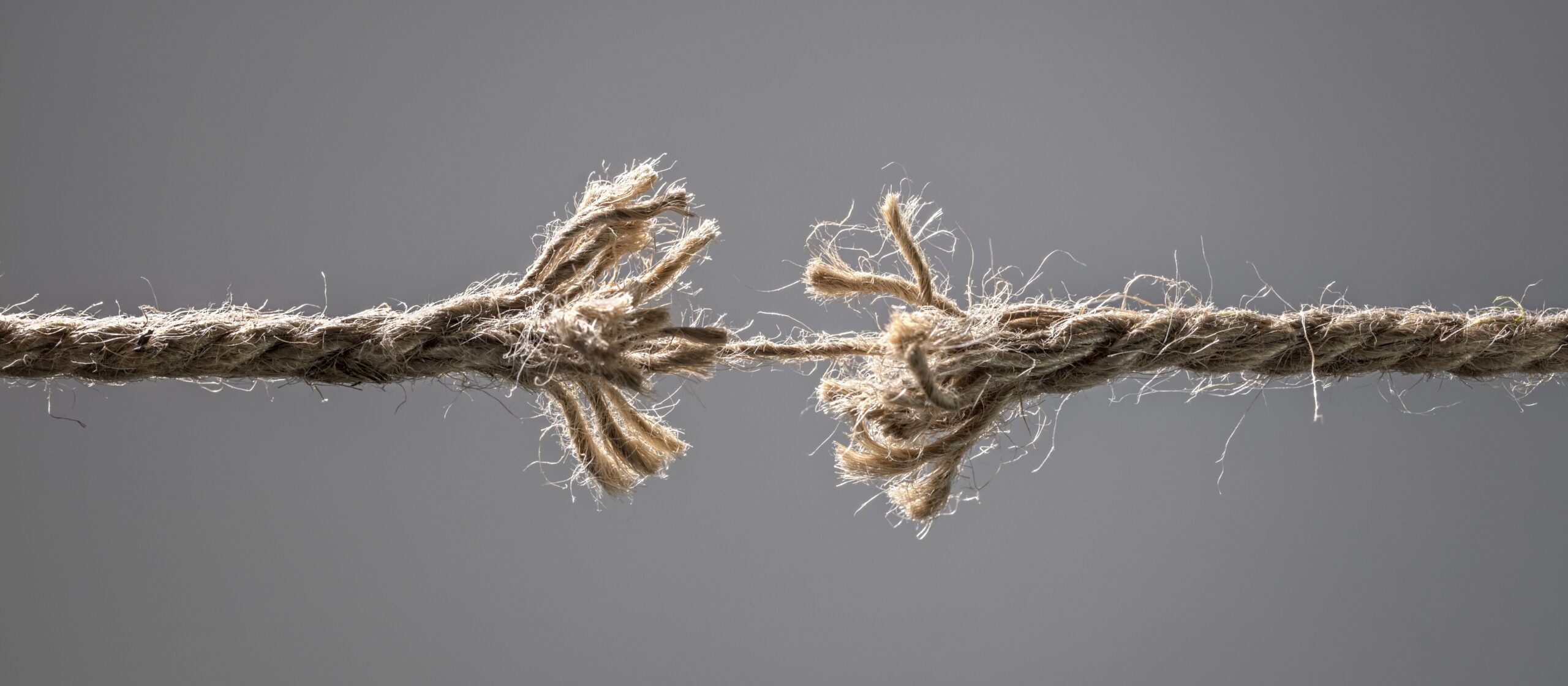 Frayed rope about to break concept for stress, problem, fragility or precarious business situation