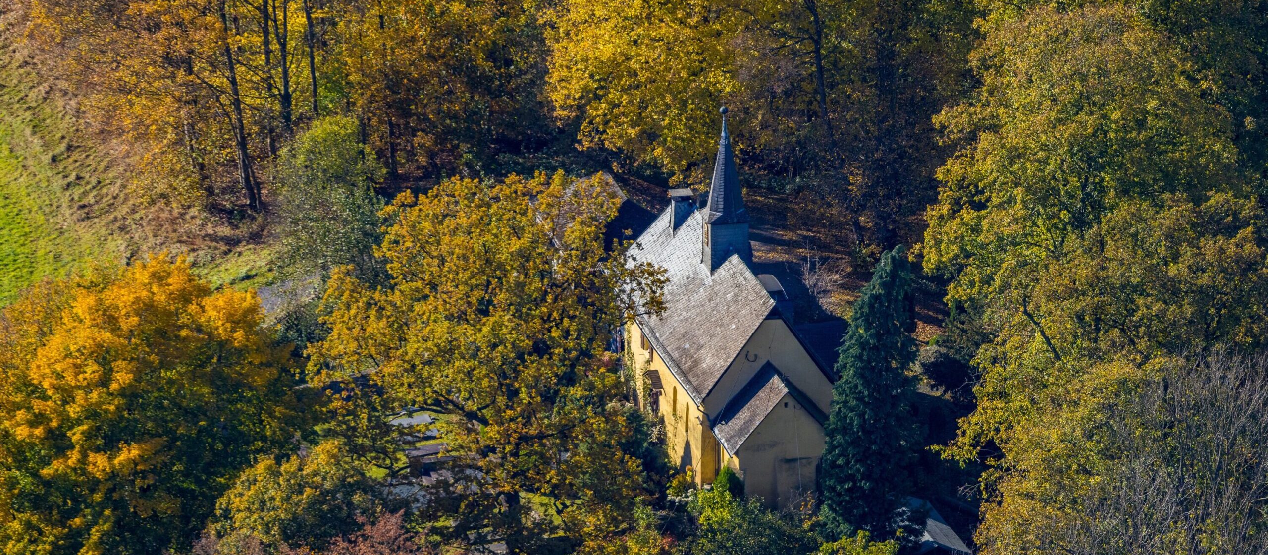 Verwunschen und friedlich liegt sie da, die hübsche Kapelle inmitten der grünen Natur. Innere Ruhe macht sich breit, um uns herum ersterben die Gespräche. Das ist gut so. Die Einsiedelei hoch über dem Ruhrtal ist nicht nur ein sakraler Ort – sie ist auch bewohnt: Zwei Klausnerinnen teilen sich den spartanisch eingerichteten Wohntrakt auf der linken Seite des Gebäudes. Wer hierherkommt, dringt in einen Rückzugsort ein.