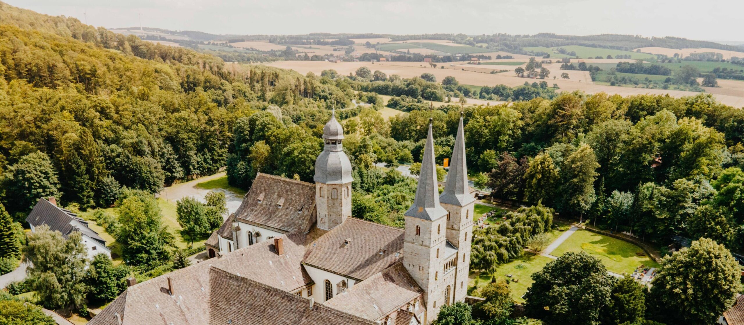 Fast majestätisch erheben sich die beiden schlanken Türme der Abtei Marienmünster über die sanft hügelige Landschaft. Mitten im Grünen mit weitem Blick auf das Lipper Bergland weisen zwei Symbole des Glaubens – ganz bewusst dem Welterbe Westwerk Corvey nachempfunden – den Weg in eine weitläufige barocke Klosteranlage, die in der Region zu den schönsten und beeindruckendsten gehört. Einst im Jahre 1128 von den Grafen von Schwalenberg sozusagen als Zweigstelle von Corvey gegründet, hat sich die ehemalige Benediktinerabtei in modernen Zeiten längst von der großen Schwester an der Weser emanzipiert und eine eigene, individuelle Wertschätzung weit über regionale Grenzen erfahren – als beliebtes „Kloster der Klänge“.