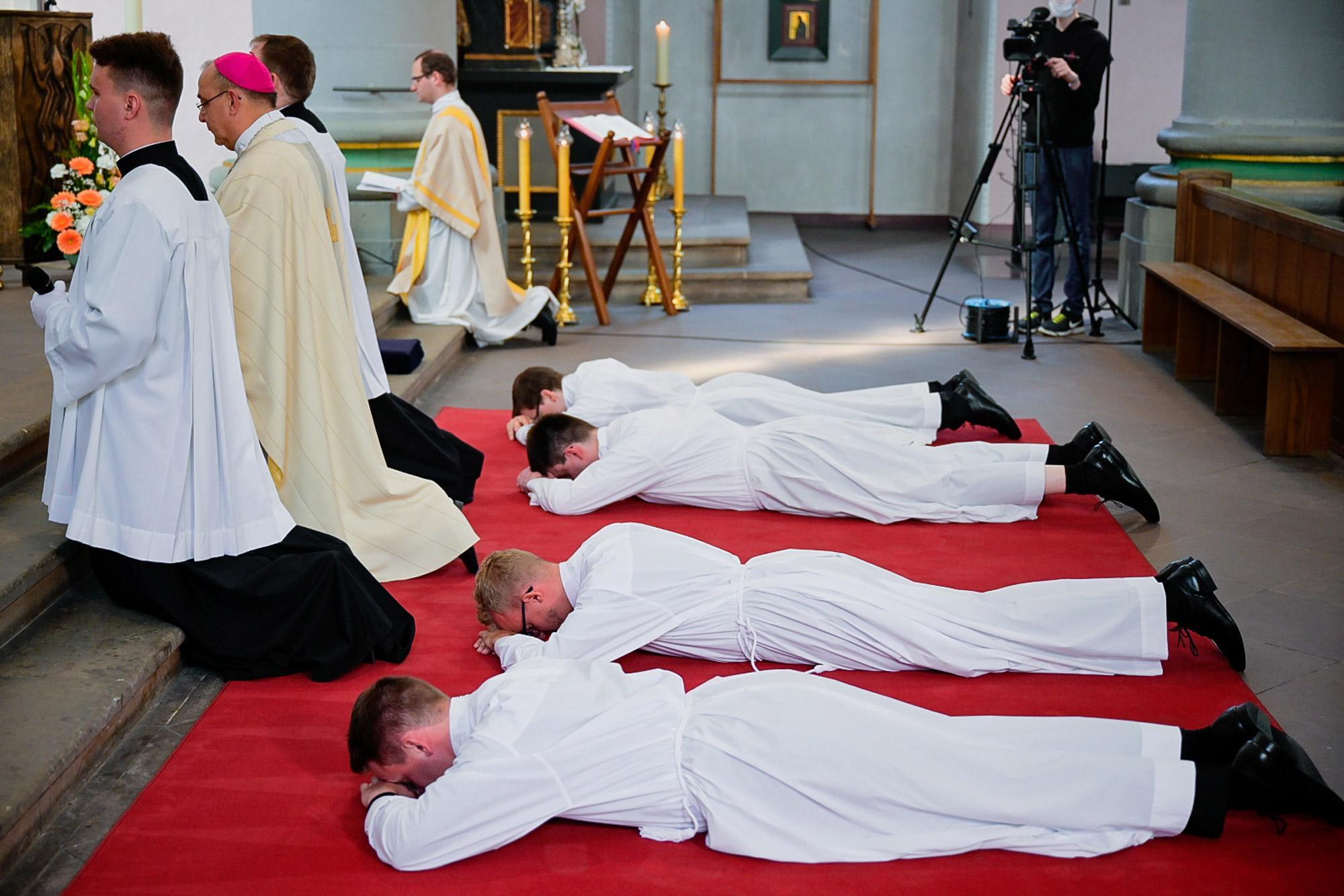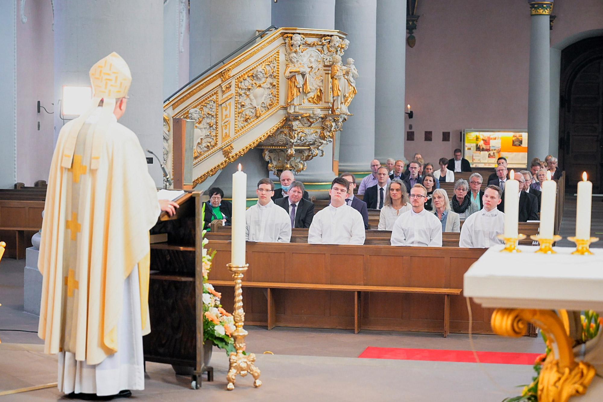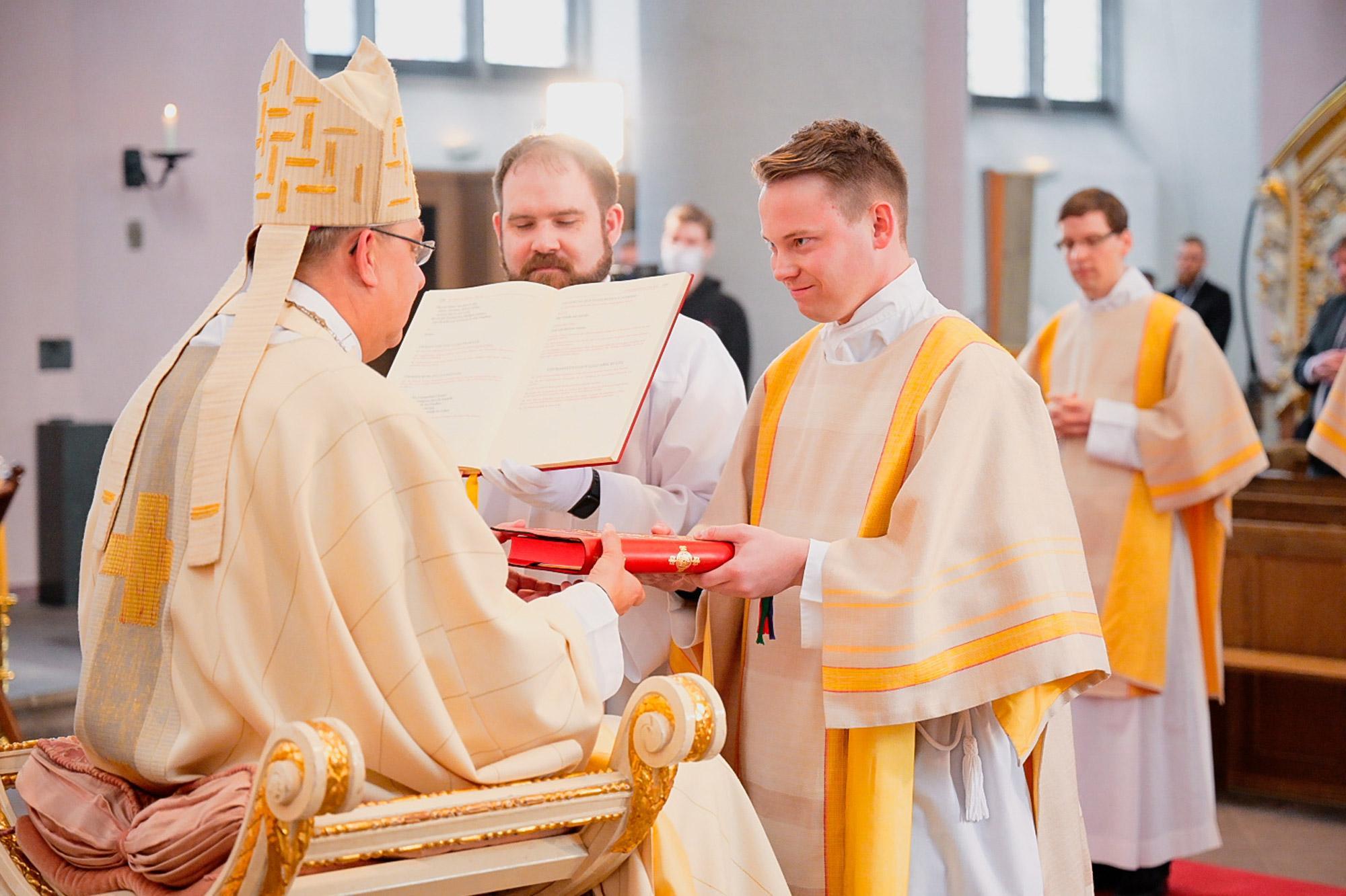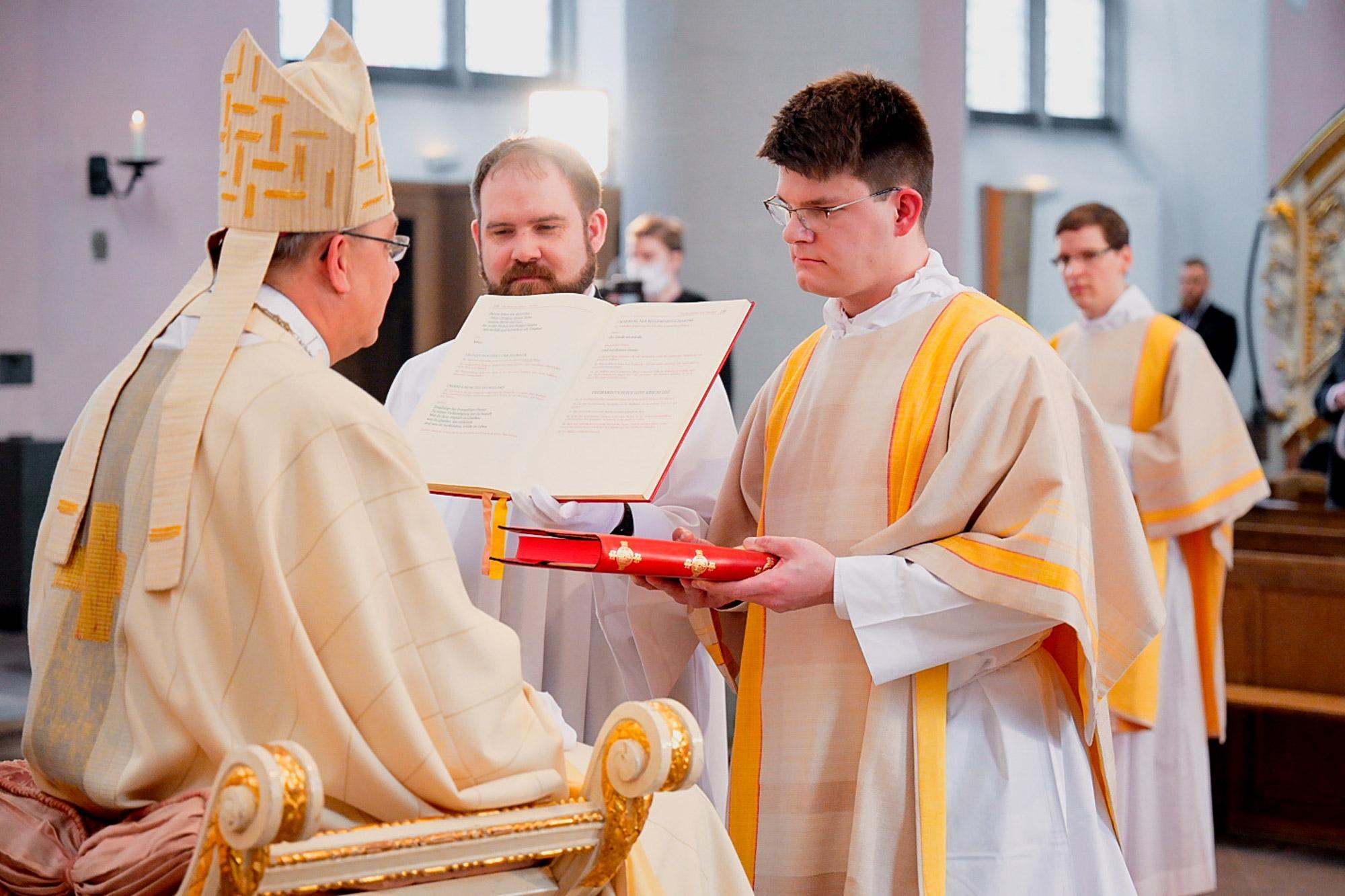 Im feierlichen Gottesdienst wurden die vier Diakonatsweihekandidaten durch Diakon Michael Stiehler einzeln mit Namen aufgerufen, sie traten jeweils vor Weihbischof Dr. Domincus Meier OSB und erklärten mit den Worten „Hier bin ich!“ ihre Bereitschaft zur Weihe. Dann bat der Regens des Erzbischöflichen Priesterseminars Paderborn, Domkapitular Monsignore Dr. Michael Menke-Peitzmeyer, den Bischof im Namen der Kirche, den Männern die Diakonenweihe zu spenden. Weihbischof Dominicus sagte: „Mit dem Beistand unseres Herrn und Gottes Jesus Christus, des Erlösers, erwählen wir diese unsere Brüder zu Diakonen“. Die Gottesdienstgemeinschaft antwortete mit „Dank sei Gott, dem Herrn.“.