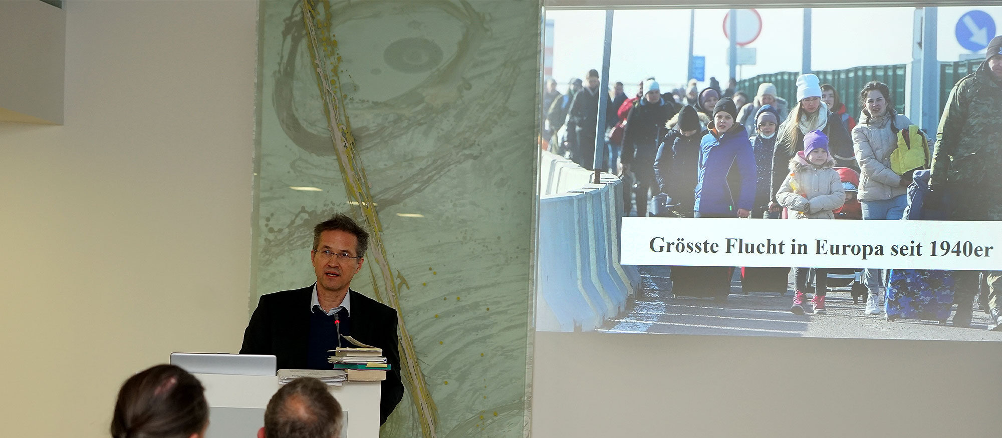 Der Paderborner Diözesanadministrator Monsignore Dr. Michael Bredeck fasste einleitend die Positionen von Papst Franziskus zusammen. Dieser habe bereits früh ein deutliches Zeichen gesetzt, als er in seiner ersten Reise als Papst die Insel Lampedusa besuchte. „Der Blick auf den Menschen ist der Ausgangspunkt christlicher Standpunkte“, erläuterte Monsignore Dr. Bredeck. Der Weg der Christen sei einer der Barmherzigkeit und nicht der Gleichgültigkeit. Papst Franziskus habe die Verantwortung Europas für die Geflüchteten immer wieder offen angesprochen. Dabei gehe es auch um die persönliche Verantwortung des Einzelnen, der Situation nicht gleichgültig gegenüberzustehen.