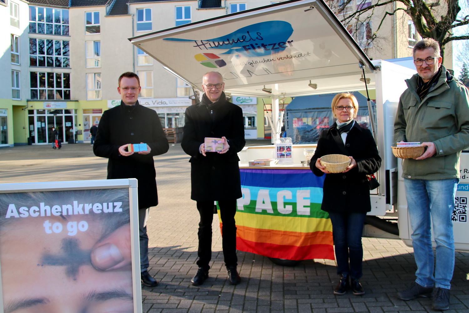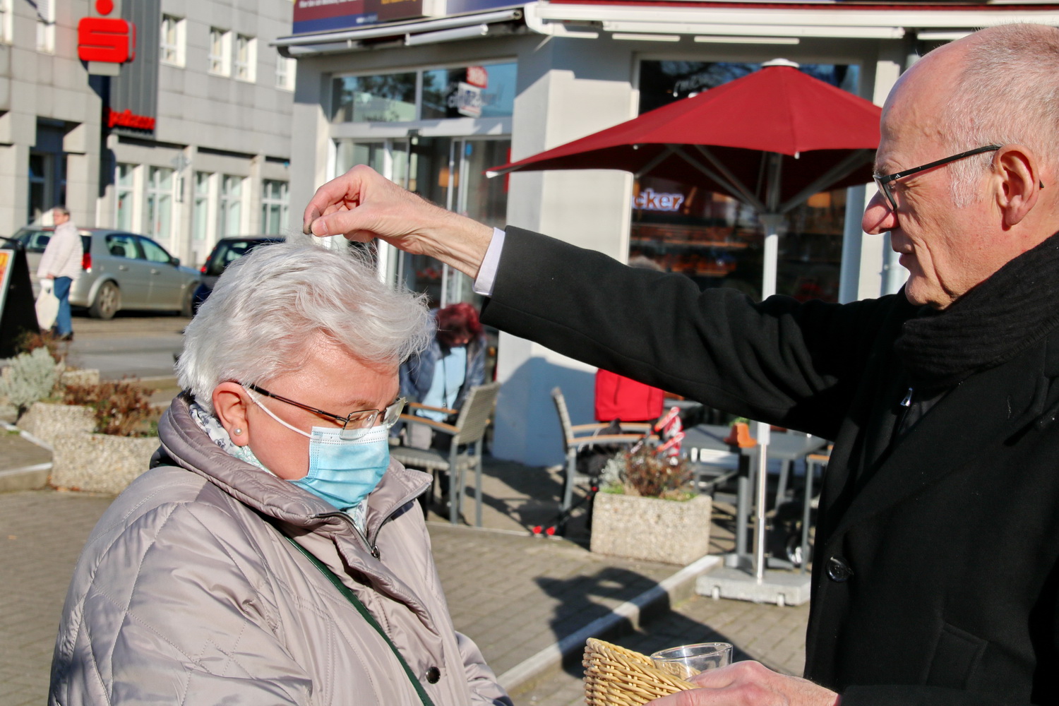 Nach dem gut besuchten Gottesdienst der „Messe zur Marktzeit“ in der Propsteikirche teilte Pastor Stefan Tausch die Asche unter freiem Himmel auf dem Patz von Hiroshima hinter der Propsteikirche aus. So hatten auch Passantinnen und Passanten die Möglichkeit, sich mit Asche bestreuen zu lassen. Pastor Tausch sprach dabei die Worte „Kehr um und glaub an das Evangelium!“. Durch die Corona-Pandemie ist derzeit das sonst auf die Stirn gezeichnete Aschekreuz durch ein kontaktloses Bestreuen mit Asche ersetzt.