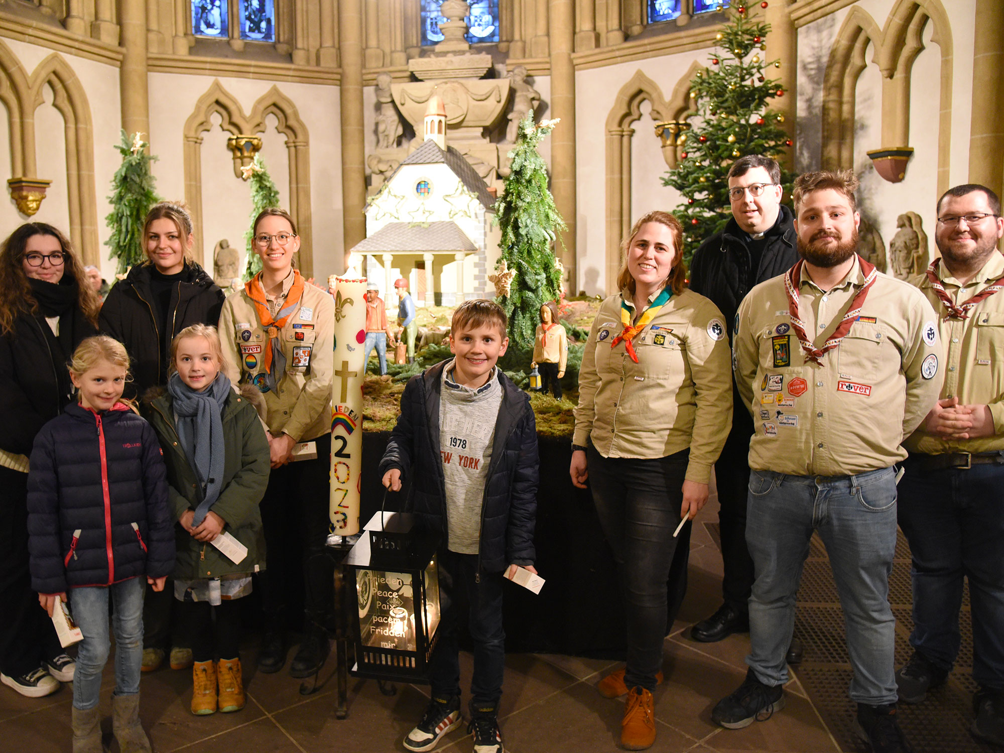 Am Montag kam das Friedenslicht aus Bethlehem in Paderborn an: Dominique Brinkmann, Benedikt Janssen und Diözesankurat Thorsten Hasse vom DPSG-Diözesanvorstand Paderborn brachten das Friedenslicht zu Diözesanadministrator Monsignore Dr. Michael Bredeck und seinem Ständigen Vertreter Prälat Thomas Dornseifer. „Das Friedenslicht ist jedes Jahr ein sprechendes Zeichen“, unterstrich Msgr. Dr. Bredeck als aktueller Leiter des Erzbistums Paderborn.