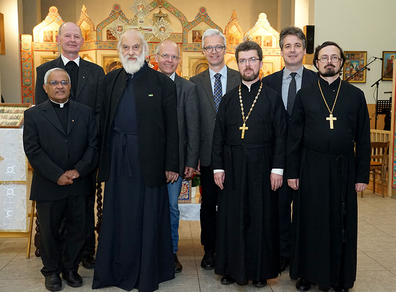 Ökumenischer Abend in der russisch-orthodoxen Kirche in Dortmund (v.l.): Pastor Antony Vazhakoottathil, Pfarrer Ansgar Schocke, Ipodiakon Nikolaj Thon, Ulrich Klauke, Dr. Johannes Oeldemann, Priester Evgeny Murzin, Dr. Markus Ingenlath und Erzpriester Dr. Vladimir Khulap.pdpDortmund, 20. Mai 2019. Die Gastfreundschaft, das Geistliche und das Geistige seien drei Stichworte, die er mit der russisch-orthodoxen Kirche verbinde. Dies sagte Dr. Johannes Oeldemann, Direktor am Johann-Adam-Möhler-Institut für Ökumenik, Paderborn, am Freitagabend (17. Mai 2019) bei der ökumenischen Begegnung zwischen orthodoxen und katholischen Christen aus Anlass der Eröffnung der Renovabis-Aktion im Erzbistum Paderborn.