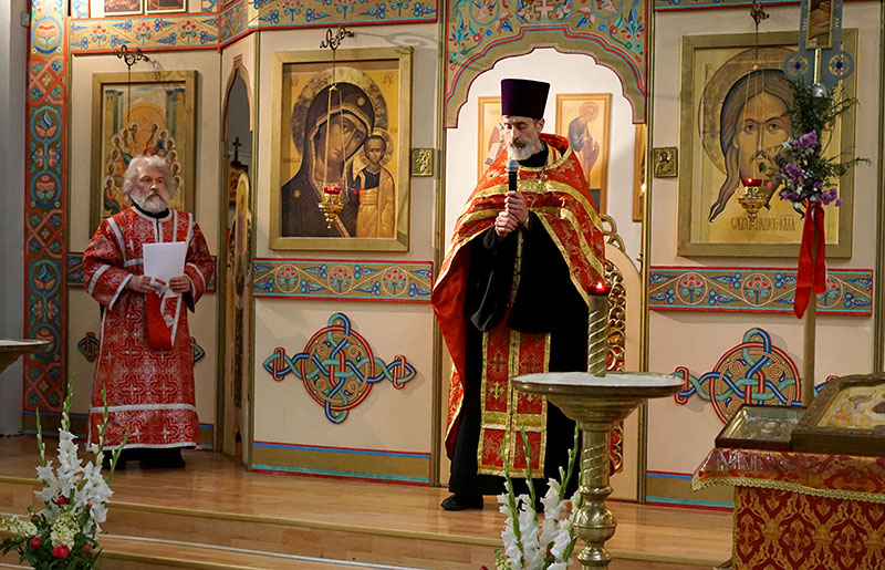 Vesper in der russisch-orthodoxen Kirche in Dortmund (v.l.): Diakon Igor Shchirovsky und Priester Vadim Abramov.pdp„Entfremdete Brüder – unbekannte Schwesterkirchen?“, war die anschließende Diskussion überschrieben. Daran nahmen teil, der Erzpriester Dr. Vladimir Khulap (Vizerektor der Theologischen Akademie des Moskauer Patriarchats, St. Petersburg), Dr. Johannes Oeldemann, Priester Vadim Abramov (Pfarrer der russischen orthodoxen Gemeinde in Dortmund), Pfarrer Ansgar Schocke (stellvertretender Stadtdechant der Katholischen Stadtkirche Dortmund), Ulrich Klauke (Leiter des Referates Weltmission, Entwicklung und Frieden im Erzbischöflichen Generalvikariat) und Ipodiakon Nikolaj Thon (Referent für zwischenkirchliche Beziehungen der Berliner Diözese der Russischen Orthodoxen Kirche / Moskauer Patriarchat) sowie Dr. Markus Ingenlath (Leiter der Abteilung Kommunikation und Kooperation beim Hilfswerk Renovabis).