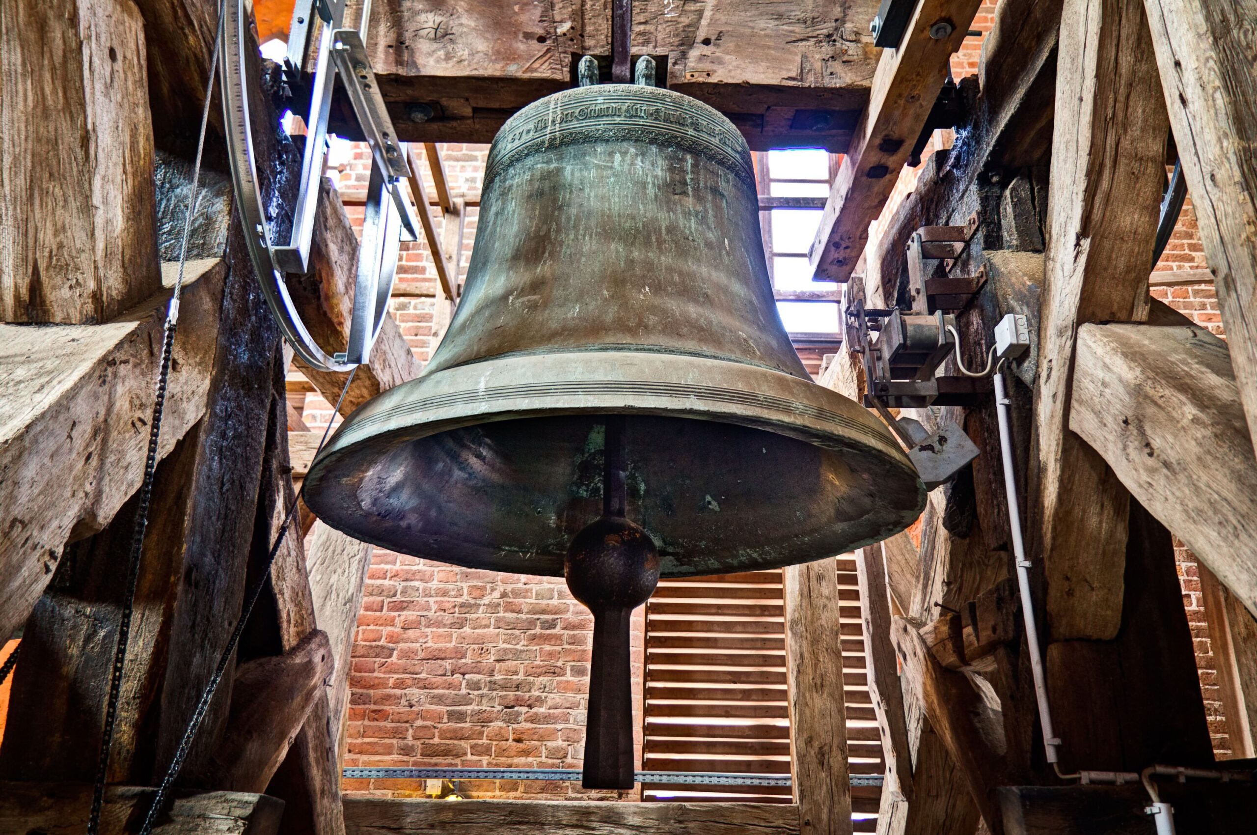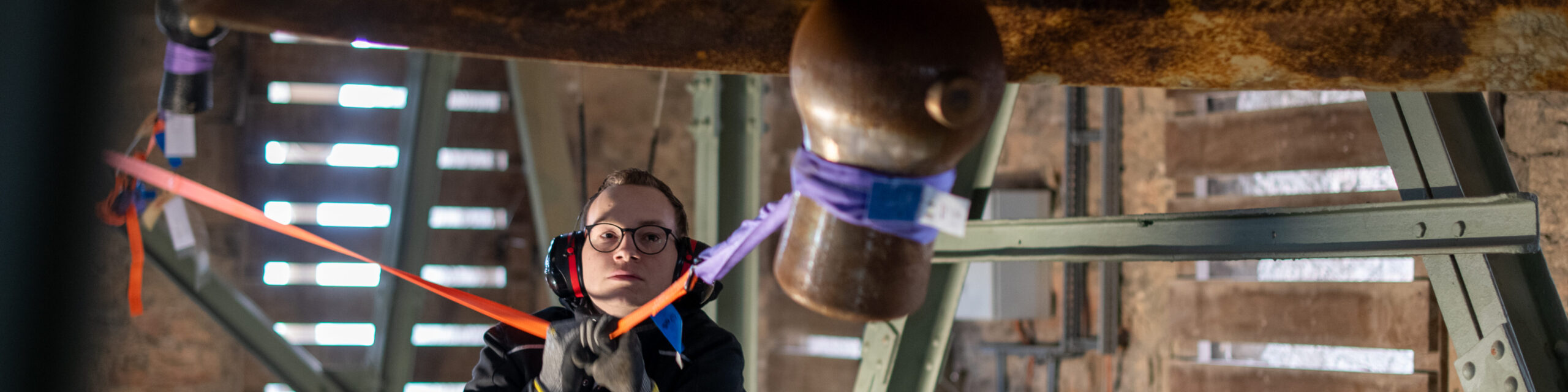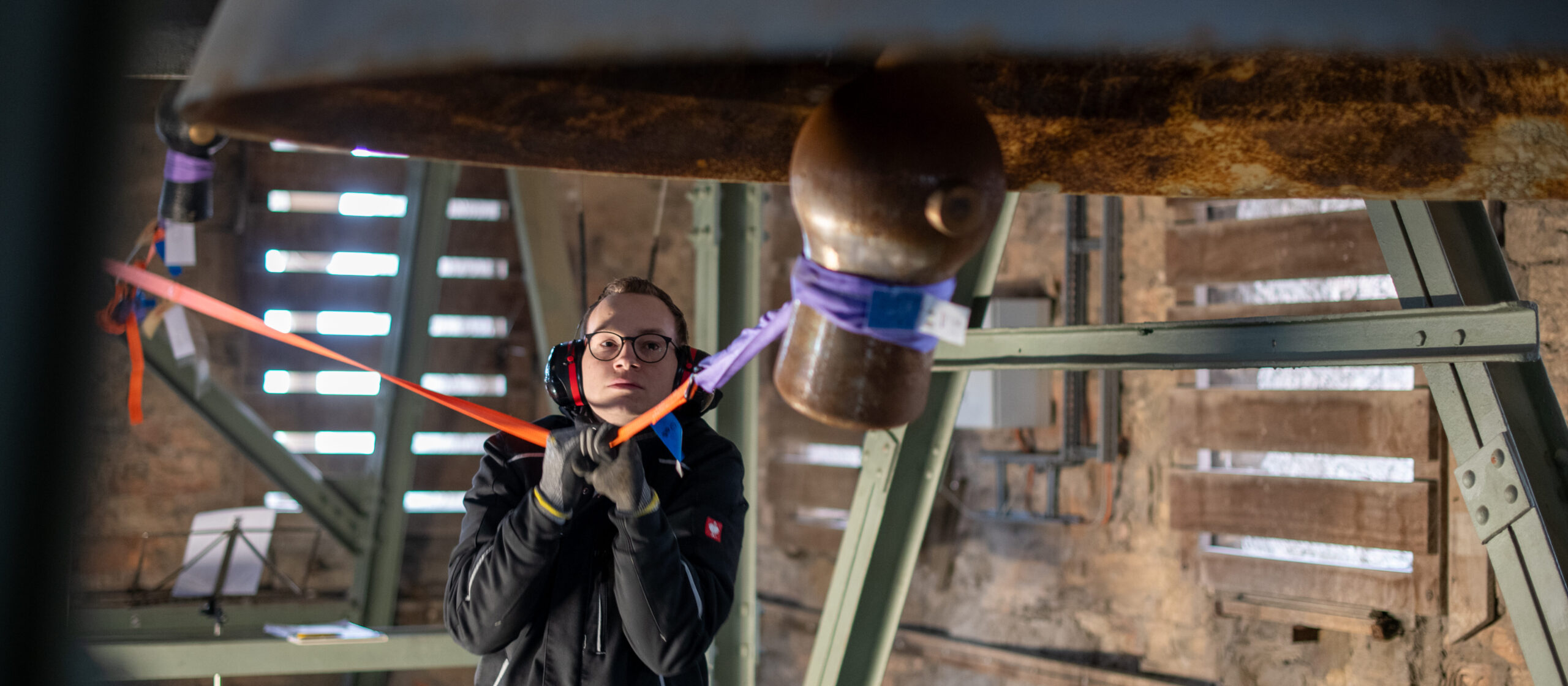 Doch der Pastor lässt sich nicht beirren. Es geht um eine letzte Kurve – dann steht Hufelschulte im Glockenstuhl. Ein einziger, hoher Raum. Ein einziger, riesiger Klangkörper. Das ist direkt zu hören, als draußen an der Turmuhr der große Zeiger auf Minute 15 vorrückt. Eine Glocke schlägt dreimal zur Viertelstunde. Der Ton ist so laut, dass man die gerade erklommene Treppe fast wieder herunterfällt. Jetzt ist klar, warum Hufelschulte vor dem Aufstieg sagte: „Das Wichtigste bei einem Glockenkonzert ist ein guter Gehörschutz.“