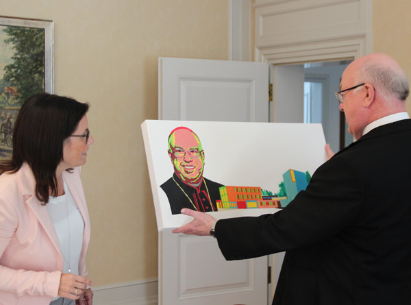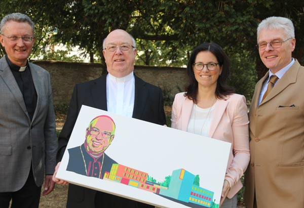 Die Gäste, die im Juni mit Erzbischof Becker im Edith-Stein-Berufskolleg seinen 70. Geburtstag gefeiert hatten, konnten das Gemälde dort am Tag der Feier selbst ausgestalten. So ist nicht nur ein Gemeinschaftswerk, sondern auch ein Unikat entstanden. Der Schulleiter des Edith-Stein-Berufskollegs, Wilfried Lappe, und Kunstlehrerin Jeanette Wippermann waren gemeinsam mit Dompropst Monsignore Joachim Göbel, Leiter der Hauptabteilung Schule und Erziehung im Erzbischöflichen Generalvikariat, zur Übergabe des Kunstwerks ins Bischofshaus gekommen.