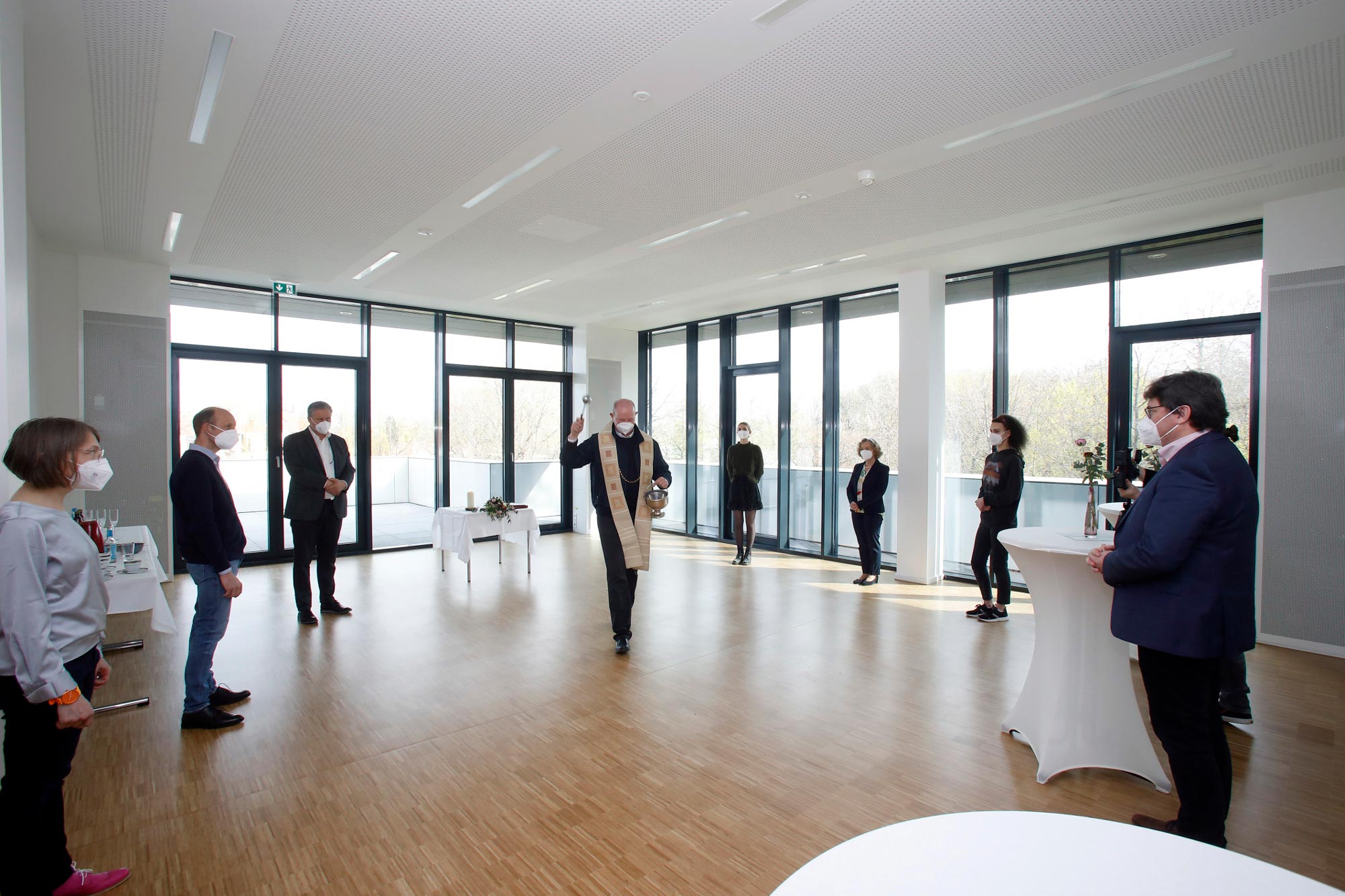 In Anwesenheit eines wegen der Pandemie nur kleinen Kreises segnete der örtliche Pfarrer Ansgar Schocke die Schule. „Wir haben hier ein baulich gelungenes Schulkonzept umgesetzt, das sich auch inhaltlich als durchaus vorzeigbar erweist in einem der ältesten und wichtigsten Berufsfelder der Menschen“, sagte Klaus Bathen, Vorsitzender des Verwaltungsrates. Die neuen Räume sind lichtdurchflutet, klar gestaltet und mit modernster Klimatechnik ökologisch gebaut. Das grüne Umfeld des Hoeschparkes und eine moderne Architektur rahmen den Campus ein. Großzügige Terrassen und eine partiell angelegte Außenanlage ermöglichen zukünftig Unterricht an der frischen Luft und laden zum Verweilen in den Pausen ein.