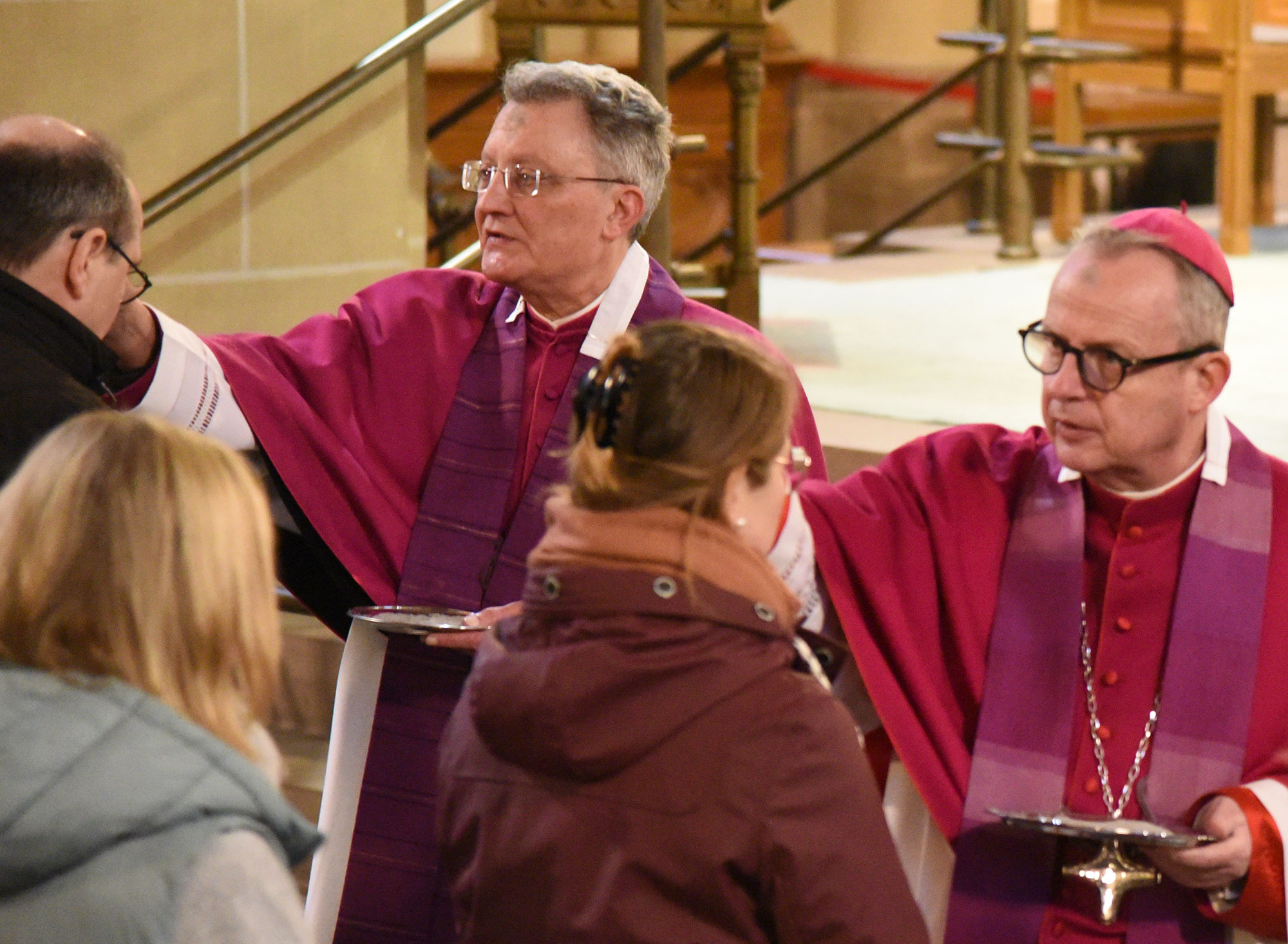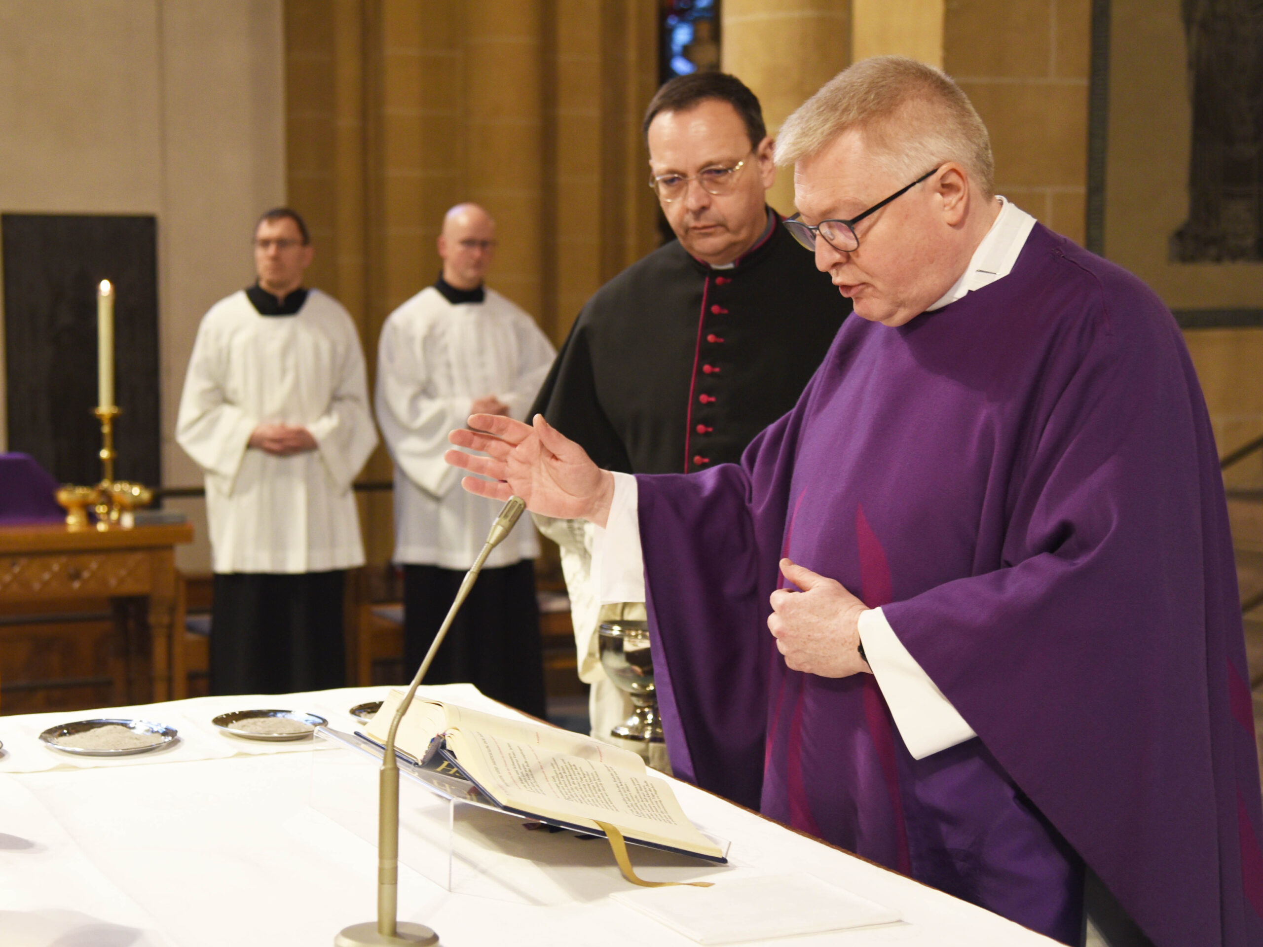 Im Anschluss an die Predigt segnete Msgr. Dr. Bredeck die Asche für die Spendung des Aschekreuzes. Mit den Worten „Bedenke Mensch, dass Du Staub bist und wieder zu Staub zurückkehren wirst“ wurde mit der Asche ein Kreuz auf die Stirn jeder und jedes Gläubigen gezeichnet.