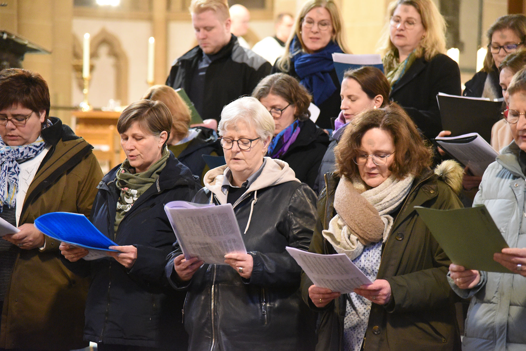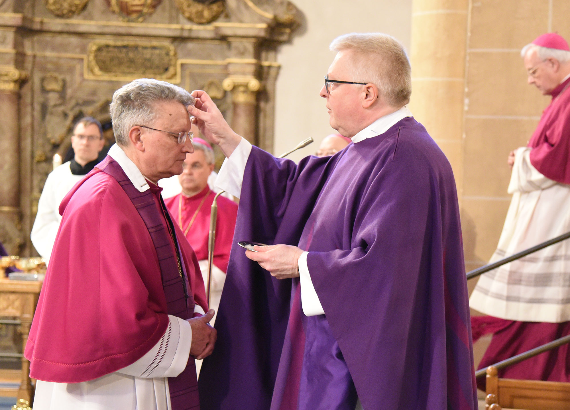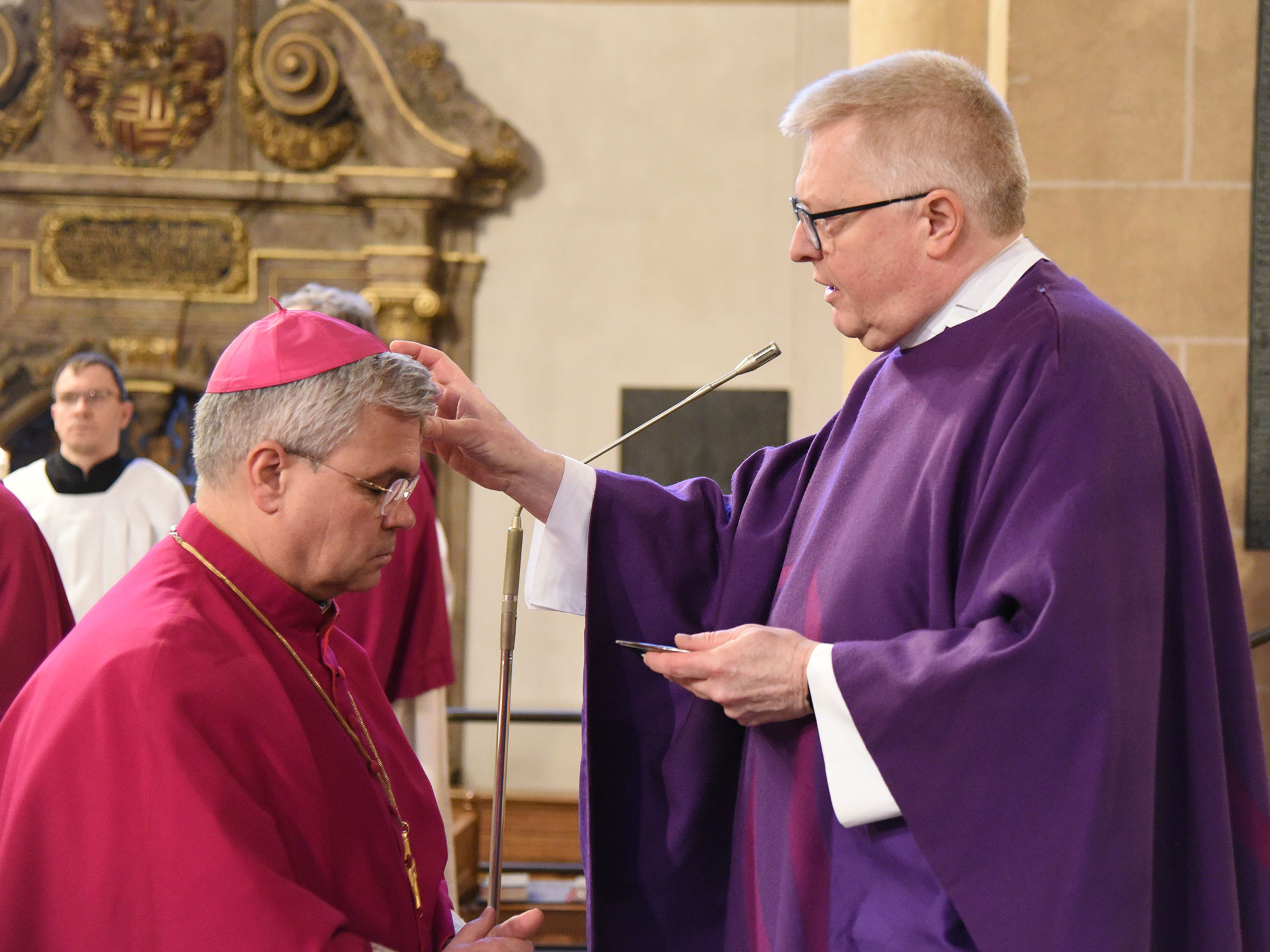 Zu Beginn der 40-tägigen Fastenzeit empfingen am Aschermittwoch, 14. Februar 2024, zahlreiche Gläubige im Paderborner Dom das Aschekreuz als Zeichen der Umkehr. Auch der künftige Paderborner Erzbischof Dr. Udo Markus Bentz ließ sich im Kapitelsamt in der Bischofskirche des Erzbistums Paderborn von Diözesanadministrator Monsignore Dr. Michael Bredeck das Aschekreuz auf die Stirn zeichnen. „Die Fastenzeit kann die Zeit sein, die unser Leben auf den Prüfstand bringt“, sagte der Diözesanadministrator, der dem Gottesdienst als Zelebrant vorstand, in seiner Predigt.