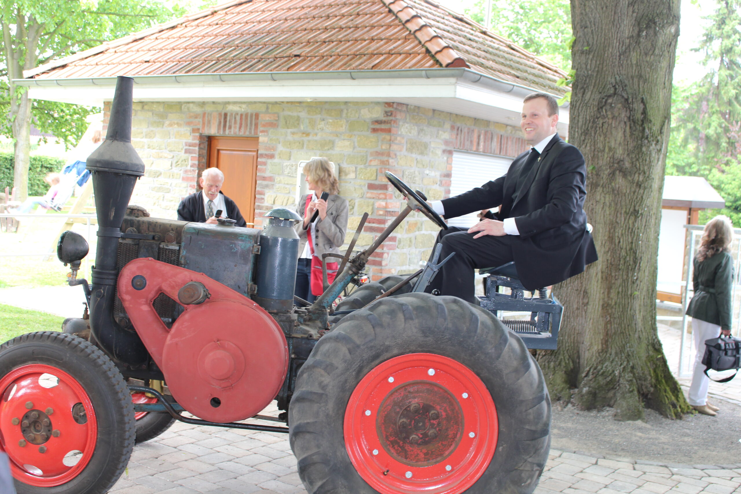 Wenn nötig repariert Hufelschulte die alten Fahrzeuge nämlich auch selbst. Zu diesen Schmuckstücken zählt auch ein „Lanz Bulldog“, Baujahr 1940. „Ein besonderer Traktor, der meinem Opa gehört hat“, freut sich der Vikar, der zu seiner Primiz in Westönnen am 24. Mai 2015 damit überrascht wurde. Denn nach der Messfeier hörte er vor der Kirche schon das typische Motorengeräusch, das ihn ahnen ließ, dass er vom Gotteshaus zur Schützenhalle damit Spalier fahren musste.