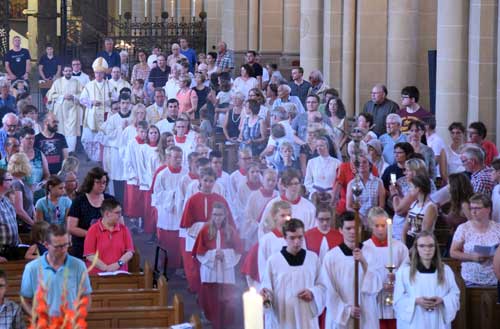 In seiner Einführung erinnerte Weihbischof Matthias König an die zeitgleich in Rom stattfindende internationale Ministrantenwallfahrt, an der rund 60.000 Ministrantinnen und Ministranten teilnehmen. Er verwies auf die im Altarraum des Paderborner Domes aufgestellte Kerze, die ein leuchtendes Zeichen der Verbundenheit sei. „Wir sind eine große, weltumspannende Gemeinschaft, als Gemeinschaft sind wir ‚behütet und bedacht‘ und durch den Dienst als Ministranten gebt ihr diese gute Botschaft weiter“, so Weihbischof König.
