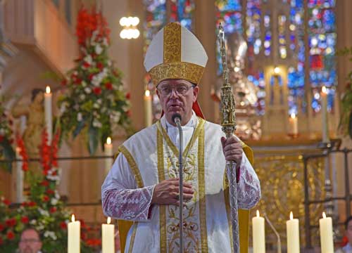 Ministranten tragen die Frohe Botschaft in die Welt, so Weihbischof Matthias König in seiner Predigt.pdp / Thomas Throenle Im Hinblick auf das Leitwort des Libori-Festes „behütet und bedacht“ sagte Weihbischof König in seiner Predigt, dass viele Menschen sich in einer Kirche „richtig geborgen fühlen“, die „bergende und wohltuende Atmosphäre einer Kirche“ schätzen. Es sei sehr wertvoll, dass sich insbesondere Messdienerinnen und Messdiener gut in einer Kirche auskennen, mit ihr vertraut sind und sich darin zu Hause fühlen. „Durch euren Dienst wirkt ihr wesentlich daran mit, dass auch andere Menschen in der Kirche ein Zuhause finden.“