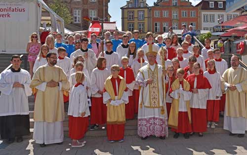 Messdiener aus dem ganzen Erzbistum feierten das Libori-Pontifikalamt gemeinsam mit Weihbischof Matthias König.pdp / Thomas Throenle„Es ist wichtig, eine Brücke vom Gottesdienst zu den Menschen und in den Alltag zu bauen. Das tun wir, indem wir Jesus nachfolgen und seine Zeugen sind, von ihm Zeugnis geben.“ Das sagte Weihbischof Matthias König am Libori-Freitag im Pontifikalamt mit Ministranten und Kindern im Hohen Dom zu Paderborn. Messdienerinnen und Messdiener aus dem gesamten Erzbistum Paderborn nahmen an der Heiligen Messe am Vormittag teil. Den Ministrantendienst übernahmen Messdiener aus dem Pastoralen Raum Brakeler Land und dem Pastoralen Raum Marsberg. Der Gottesdienst wurde musikalisch gestaltet von der Band „echtkultig“ aus Lichtenau.