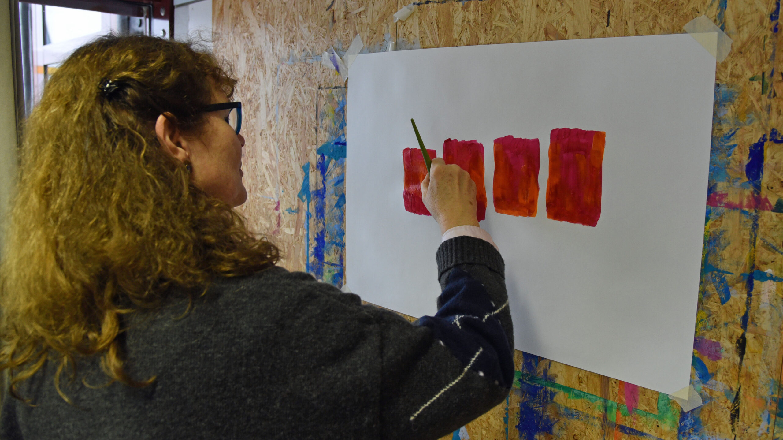 „Für mich zählt der Moment hier. Es ist eine Auszeit, in der ich angeregt werde durch die Farben – diese faszinierende Farbpalette“, erzählt eine andere Teilnehmerin. Ihrem Bild sieht man die Freude der vielen Farbmöglichkeiten an. Das Motiv passe so jetzt zu ihr. Außerdem nutze sie den Vorteil des Malorts Diözesanmuseum, indem sie Zuhause keine Staffelei aufbauen müsse.
