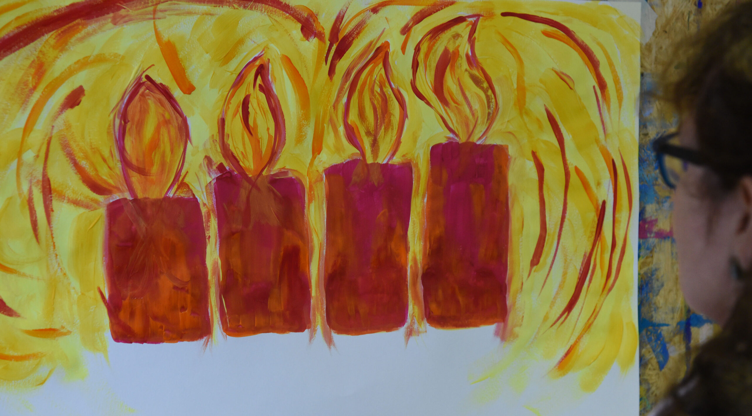 Bettina Schmidt, Seelsorgerin an den Michaelsschulen, genießt diese Auszeit. Sie ist bereits zum dritten Mal dabei. „Das ist meine ganz persönliche Ruhezeit aus dem Alltag und in der Adventszeit. Ich male gern und vor allem gern mit Farben. Es ist ein Innehalten. Ich komme ohne konkrete Idee beim Malen her, und bin gespannt,was letztlich dabei herauskommt.“ Beim ersten Mal sei sie durch den Urlaub inspiriert gewesen, beim zweiten Mal durch Pfingsten. „Jetzt ist es der Advent geworden“, darf sich Bettina Schmidt über leuchtende Adventskerzen freuen.