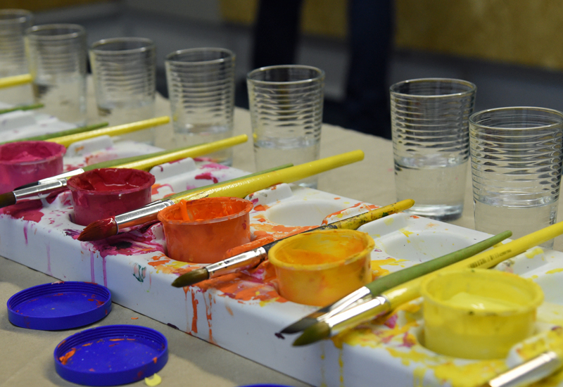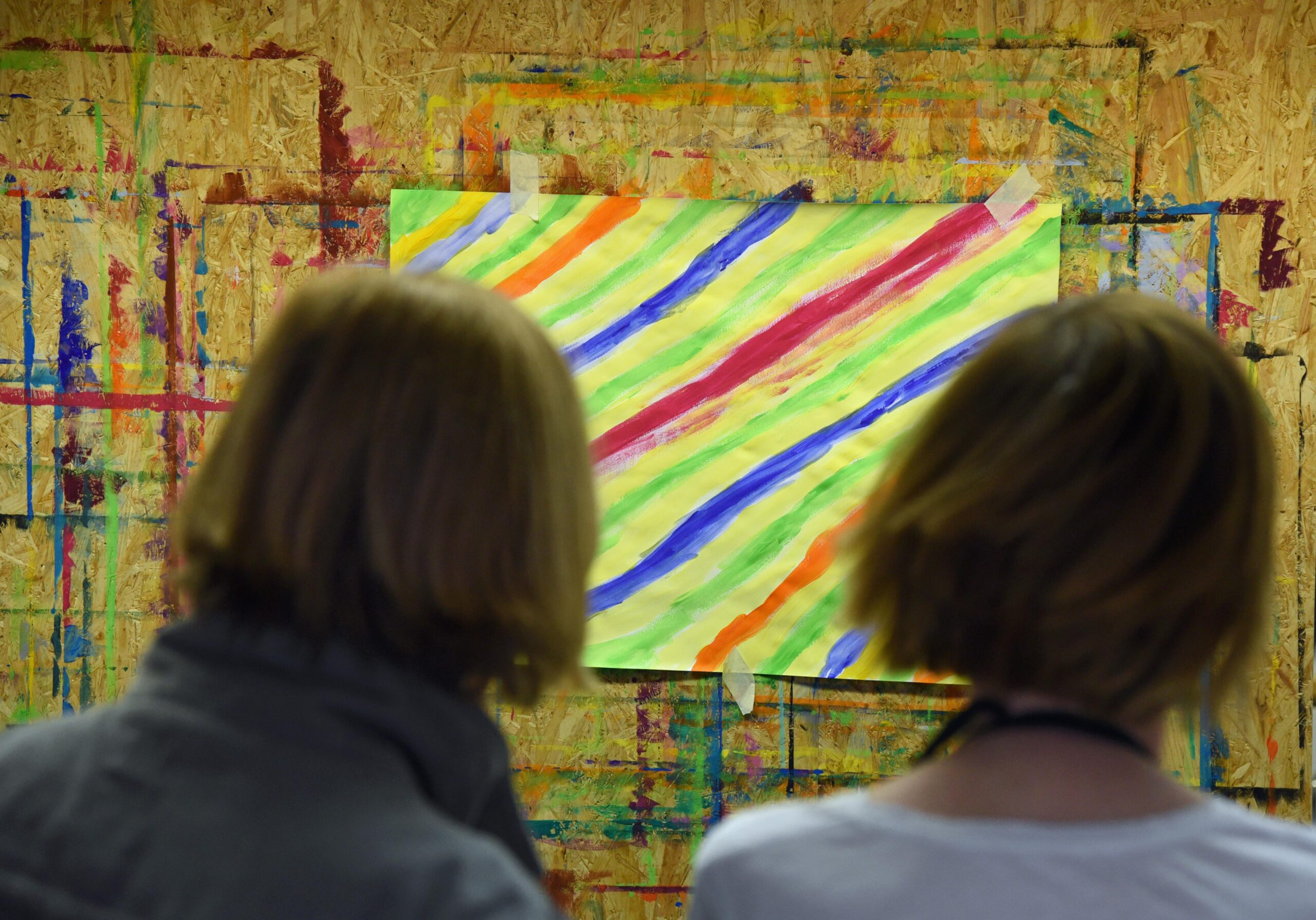 Schnell entstehen am Malort Diözesanmuseum Linien, Formen und erkennbare Figuren auf den Blättern, während durch gleichbleibende Pendelbewegung zwischen Farbtisch und Malwand ein Rhythmus im Raum entsteht, der beruhigt. „Wenn man in die kindliche Gedankenhaltung kommt, kann man sich sogar den Luxus erlauben, dass etwas nicht klappt“, macht Stiegemann Mut, sich auszuprobieren.