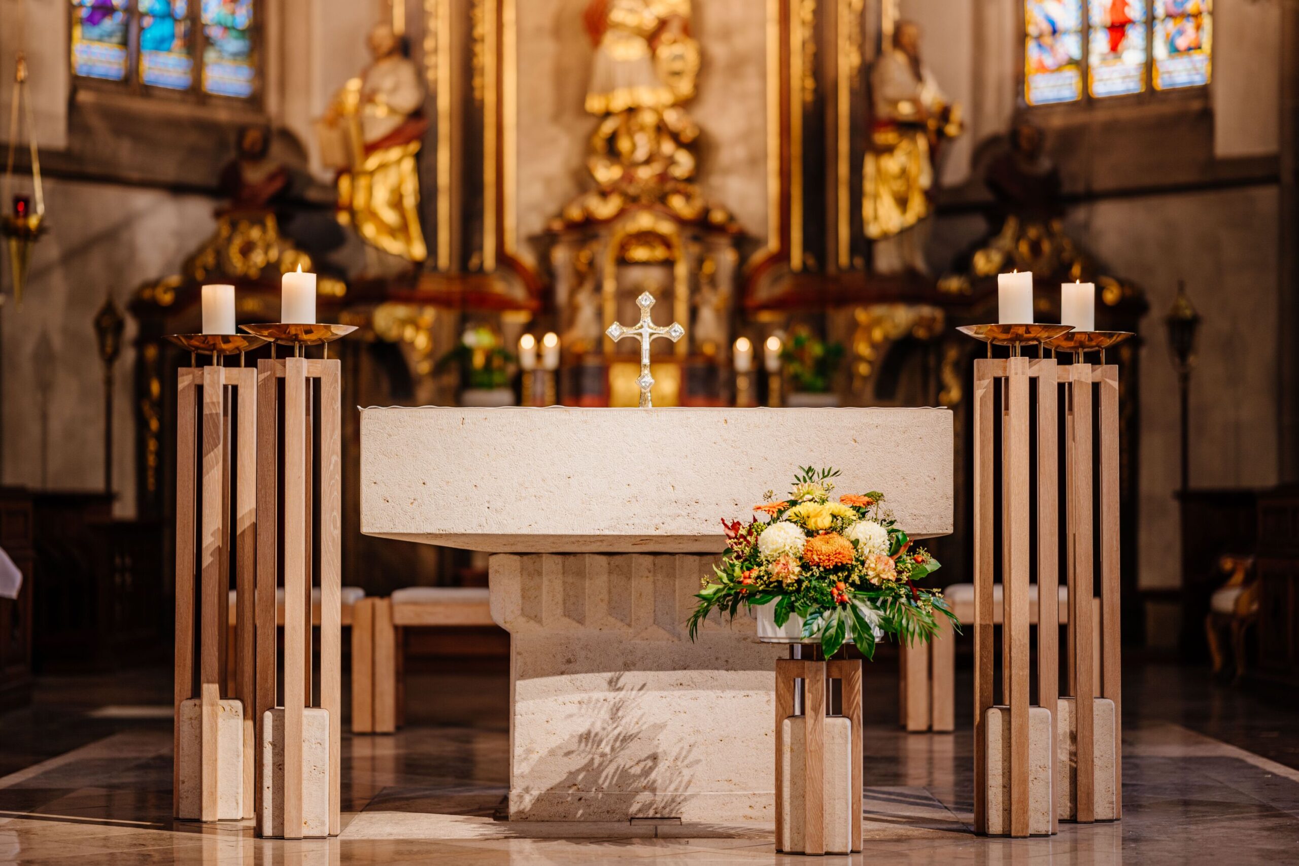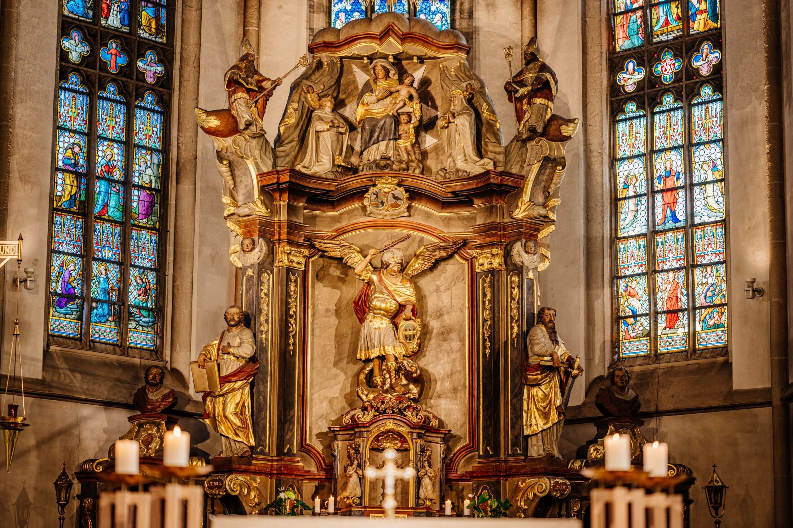 Der heilige Michael fasziniert Kinder wie Erwachsene seit dem Jahr 1748. „Zu der Zeit hatte ein Hofrat namens Johann von Pein von der Stadt Brakel für 36.000 Taler einen stattlichen Gutshof erworben“, berichtet Alfons Jochmaring, ehrenamtlicher Stadt- und Kirchenführer in Brakel. Die letzte Rate von 1.000 Talern blieb der Hofrat der Stadt jedoch schuldig. Stattdessen stiftete er gemeinsam mit seiner Ehefrau der Kirche St. Michael einen neuen Hochaltar. Ihr Stifterwappen ließen die nicht nur mit Geld, sondern auch mit Standesbewusstsein ausgestatteten Adligen in der Mitte des Hochaltars platzieren, direkt über dem Flammenschwert des heiligen Michael.