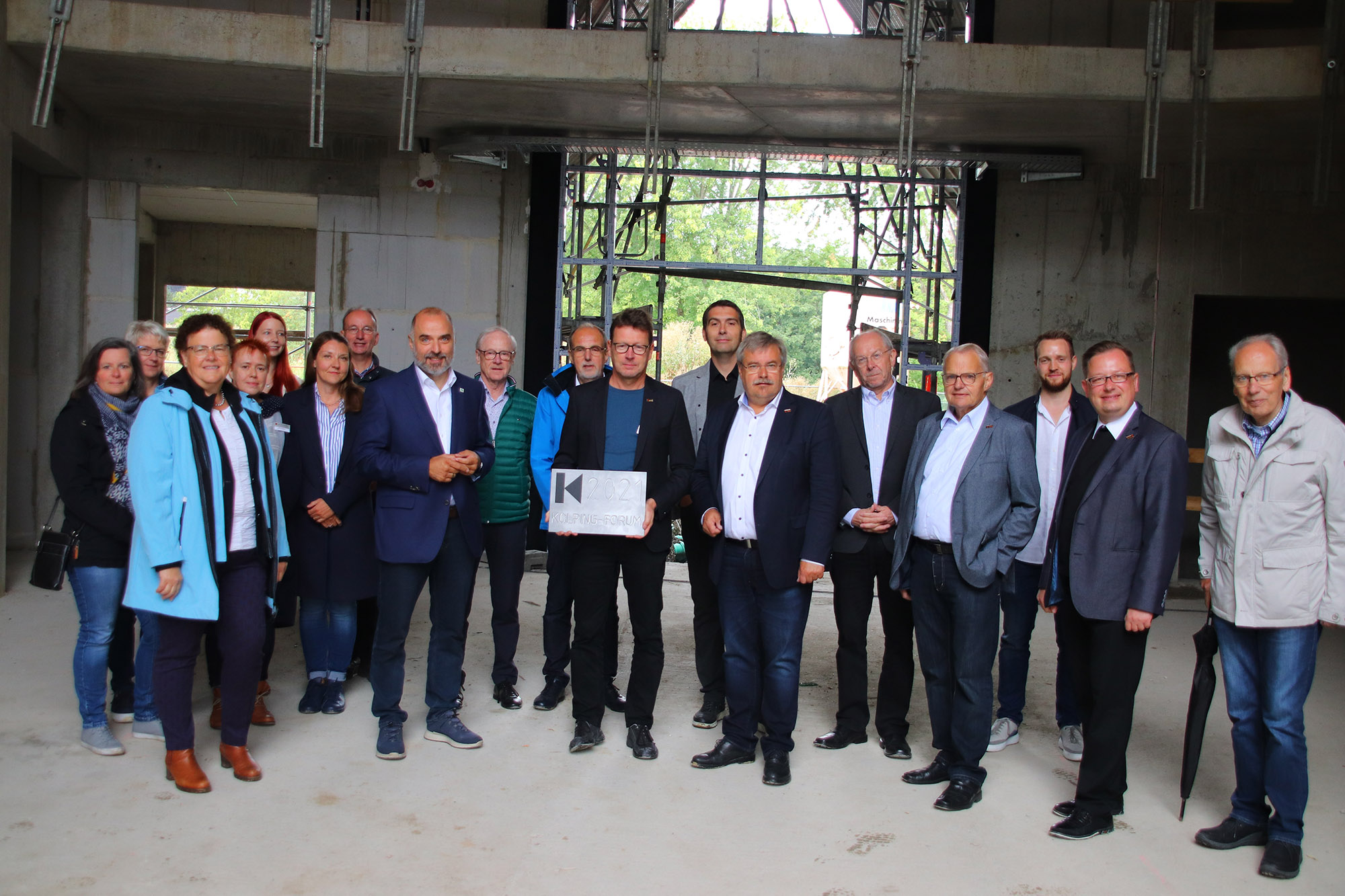 Eine „Grundsteinlegung der besonderen Art“ nannte es Wolfgang Gelhard, Geschäftsführer des Kolping-Bildungswerkes Paderborn, der Muttergesellschaft der Kolping-Bildungszentren Südwestfalen. Denn zum einen war diese Veranstaltung corona-bedingt erst jetzt mit Verspätung möglich und der Baufortschritt ließ inzwischen eher ein Richtfest erwarten. Zum anderen war es kein Grundstein, den Kolping-Diözesanpräses Sebastian Schulz in einer kurzen Andacht segnete, sondern eine Metallplatte, die demnächst ihren Platz im Eingang des Bildungszentrums finden wird.