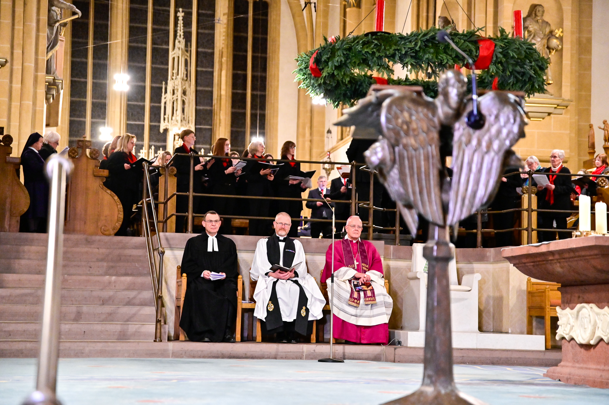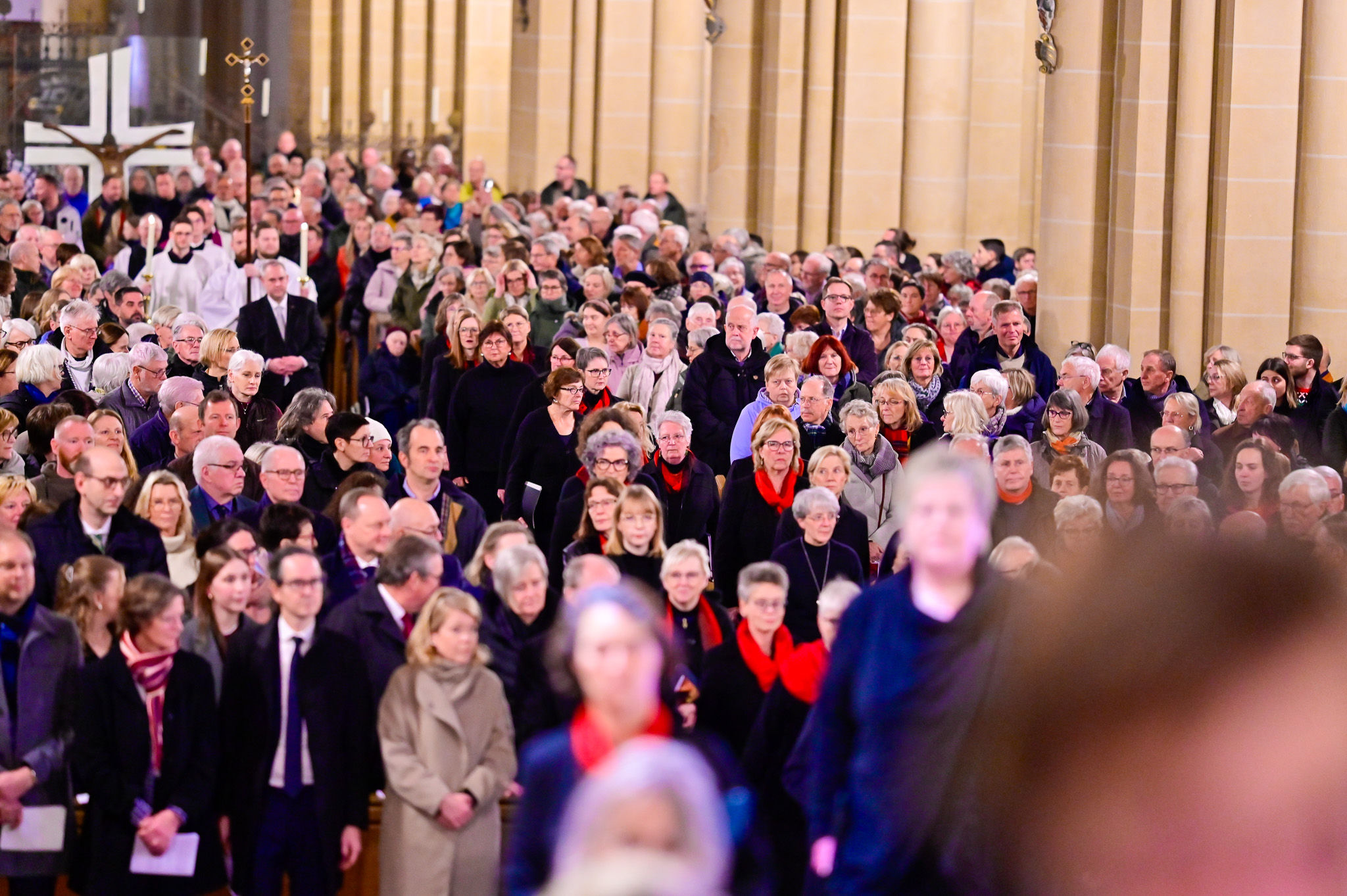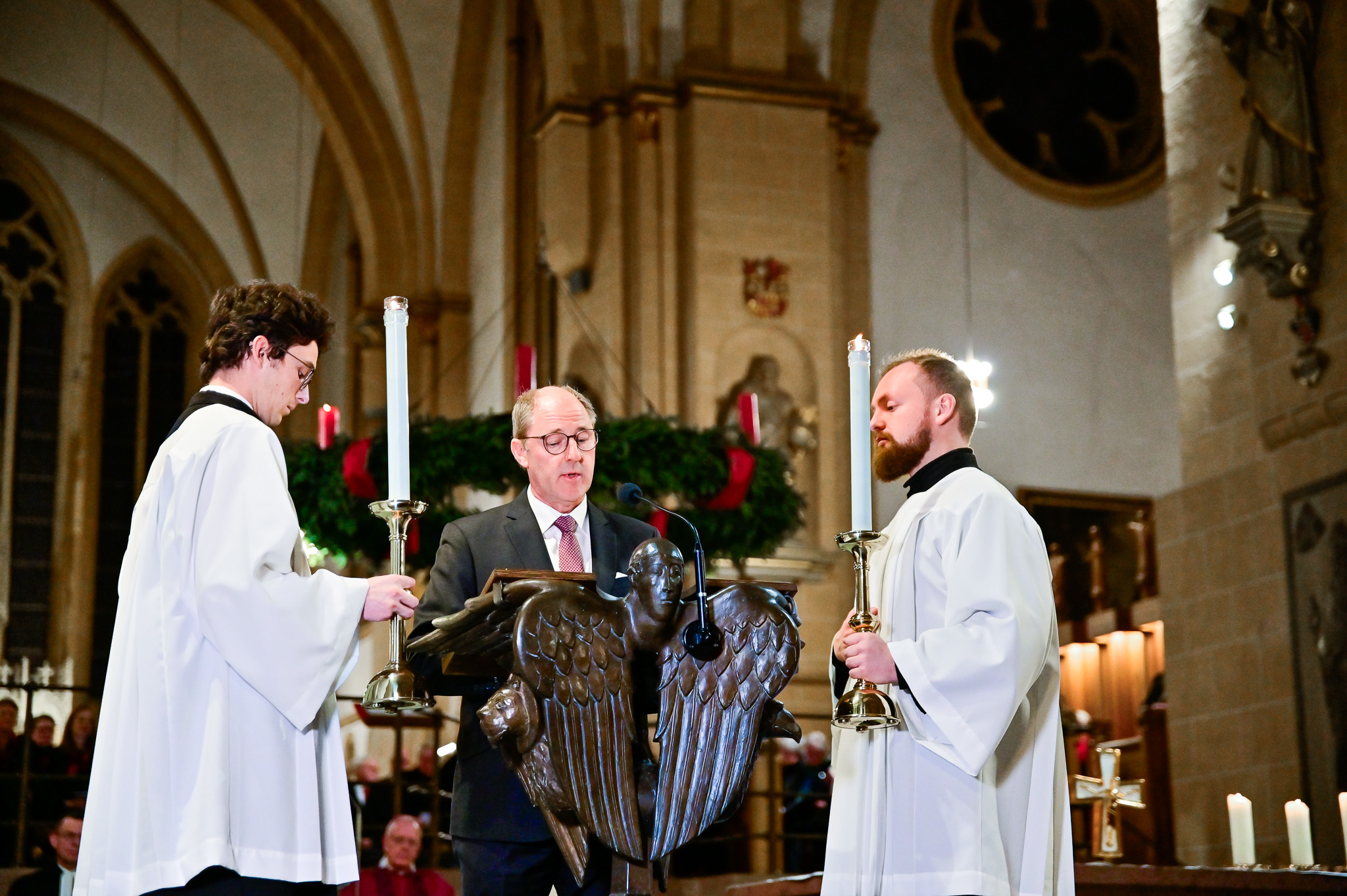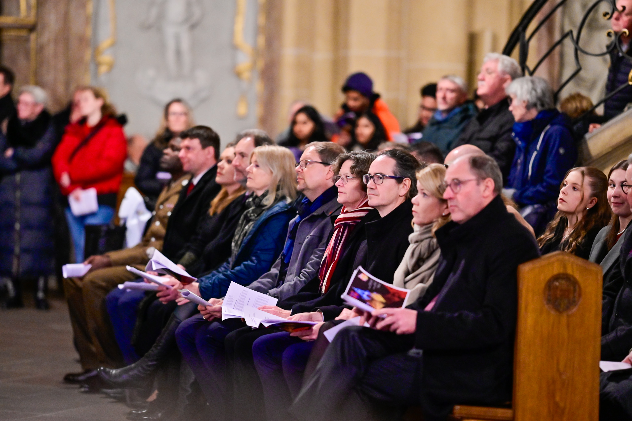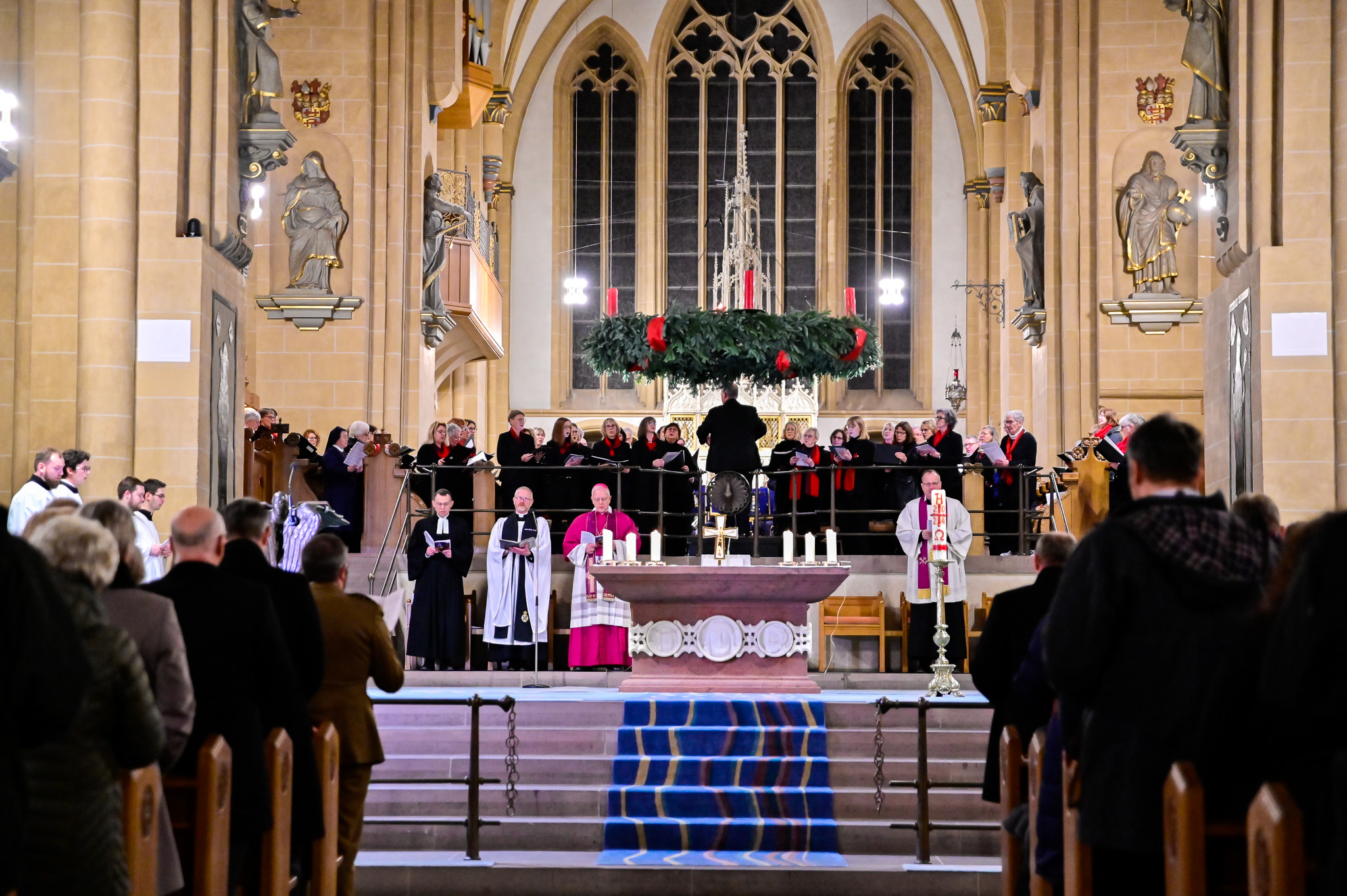 Der Deutsch-Britische Weihnachtsgottesdienst im Paderborner Dom gilt als alljährliches Fest des Glaubens, das Kulturen, Nationen und Konfessionen verbindet. Auch in diesem Jahr hat die britische Tradition der „Nine Lessons and Carols“ und die bewegende musikalische Gestaltung wieder hunderte Menschen im Paderborner Dom versammelt. Wer einen Sitzplatz ergattern wollte, musste schnell sein – lange vor Beginn des Gottesdienstes waren diese restlos belegt und auch die Seitengänge füllten sich rasch mit Gottesdienstbesuchern. Sie alle waren gekommen, um teilzuhaben an der eindrucksvollen internationalen Botschaft des Friedens und der Hoffnung, die sich in diesem Jahr vor allem an die Menschen in der Ukraine, im Sudan und im Nahen und Mittleren Osten richtete: „Trotz aller Not, aller Kriege und Krisen in der Welt: Christen haben durch alle Zeiten weitergehofft, dass Frieden möglich ist. Die Botschaft vom Friedensfürsten Jesus Christus hat ihnen dazu die Hoffnung geschenkt. Diese Botschaft will auch uns heute Abend anrühren und uns so ins Herz gehen, dass wir Botinnen und Boten des Friedens werden“, appellierte Weihbischof Matthias König zu Beginn des Gottesdienstes.