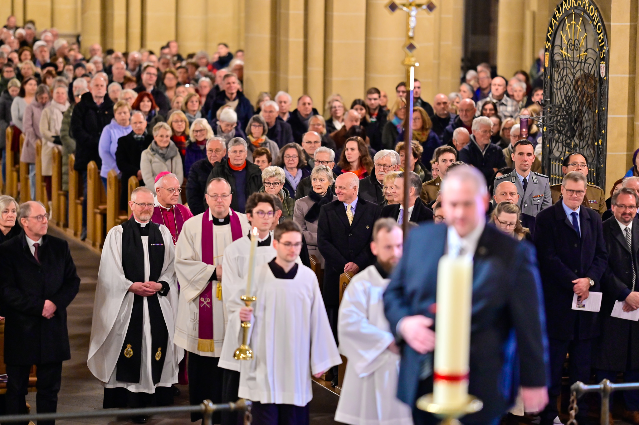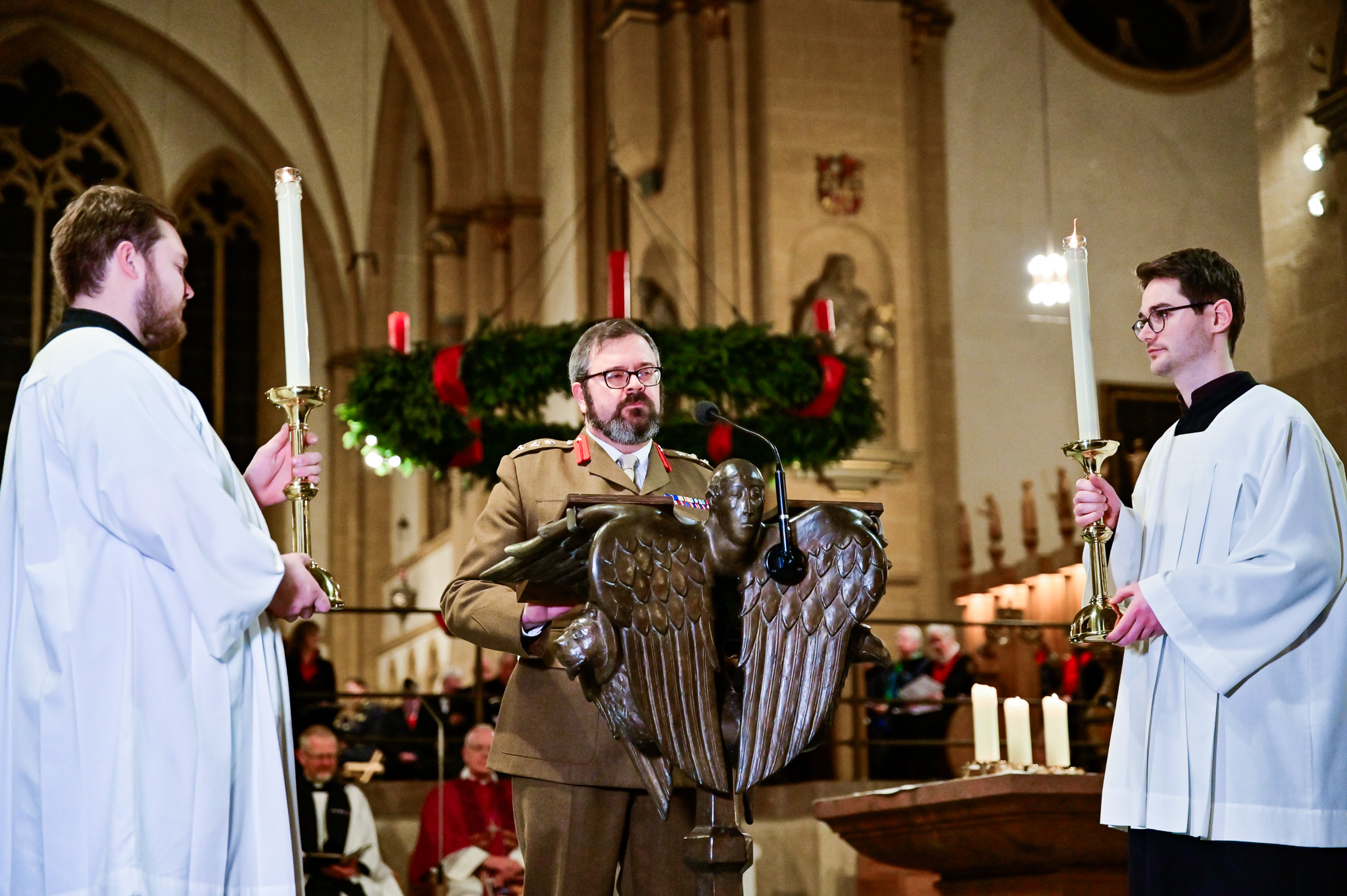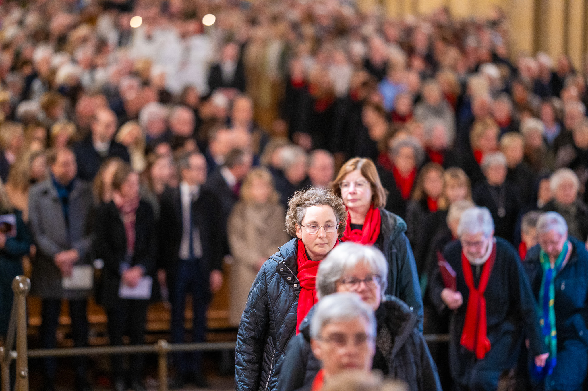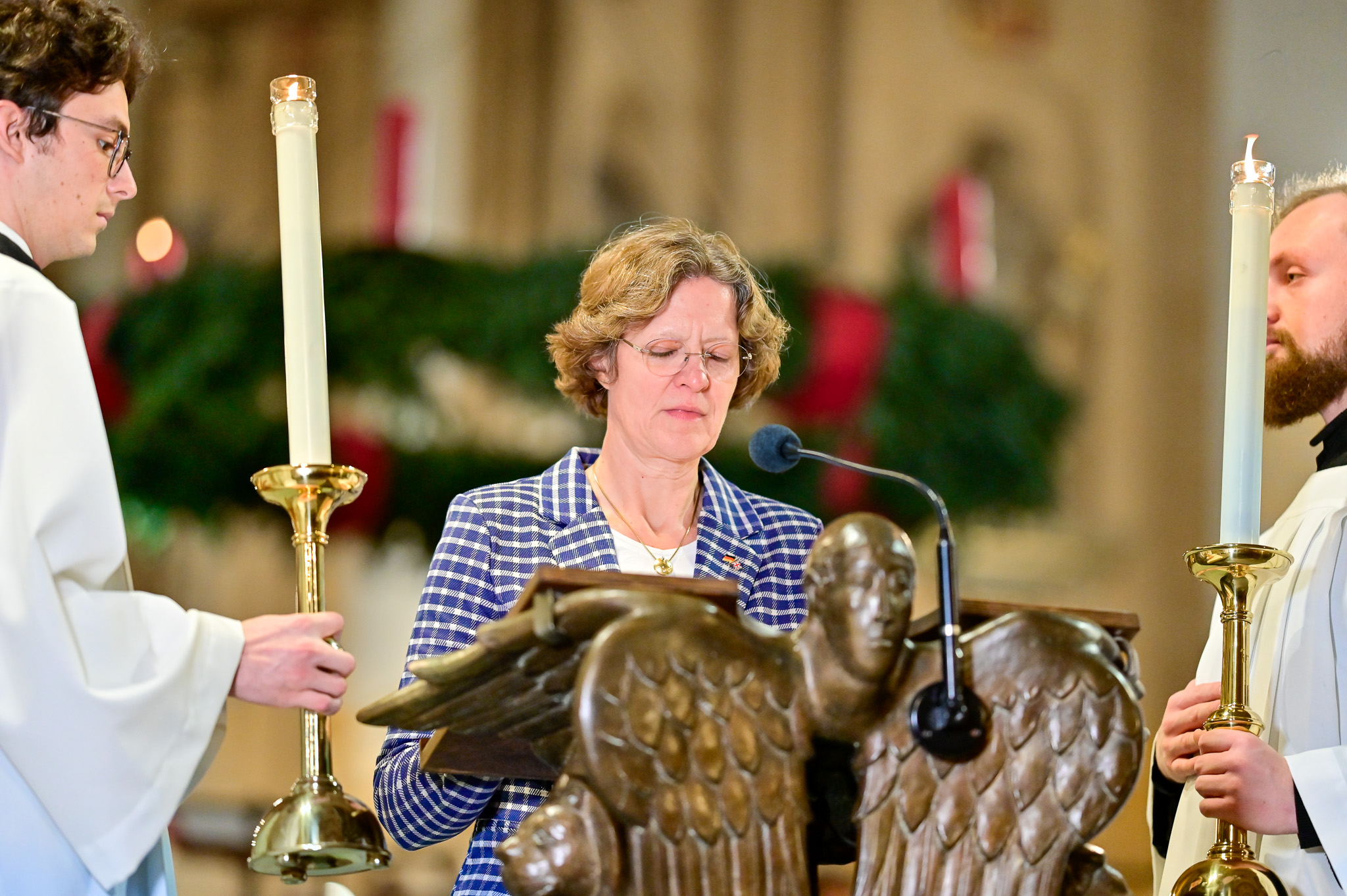 Der Deutsch-Britische Weihnachtsgottesdienst im Paderborner Dom gilt als alljährliches Fest des Glaubens, das Kulturen, Nationen und Konfessionen verbindet. Auch in diesem Jahr hat die britische Tradition der „Nine Lessons and Carols“ und die bewegende musikalische Gestaltung wieder hunderte Menschen im Paderborner Dom versammelt. Wer einen Sitzplatz ergattern wollte, musste schnell sein – lange vor Beginn des Gottesdienstes waren diese restlos belegt und auch die Seitengänge füllten sich rasch mit Gottesdienstbesuchern. Sie alle waren gekommen, um teilzuhaben an der eindrucksvollen internationalen Botschaft des Friedens und der Hoffnung, die sich in diesem Jahr vor allem an die Menschen in der Ukraine, im Sudan und im Nahen und Mittleren Osten richtete: „Trotz aller Not, aller Kriege und Krisen in der Welt: Christen haben durch alle Zeiten weitergehofft, dass Frieden möglich ist. Die Botschaft vom Friedensfürsten Jesus Christus hat ihnen dazu die Hoffnung geschenkt. Diese Botschaft will auch uns heute Abend anrühren und uns so ins Herz gehen, dass wir Botinnen und Boten des Friedens werden“, appellierte Weihbischof Matthias König zu Beginn des Gottesdienstes.