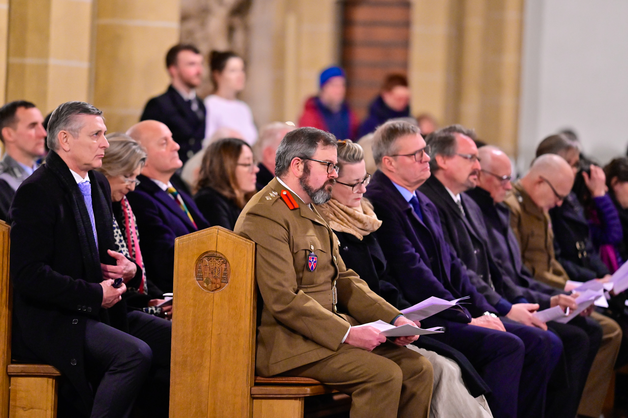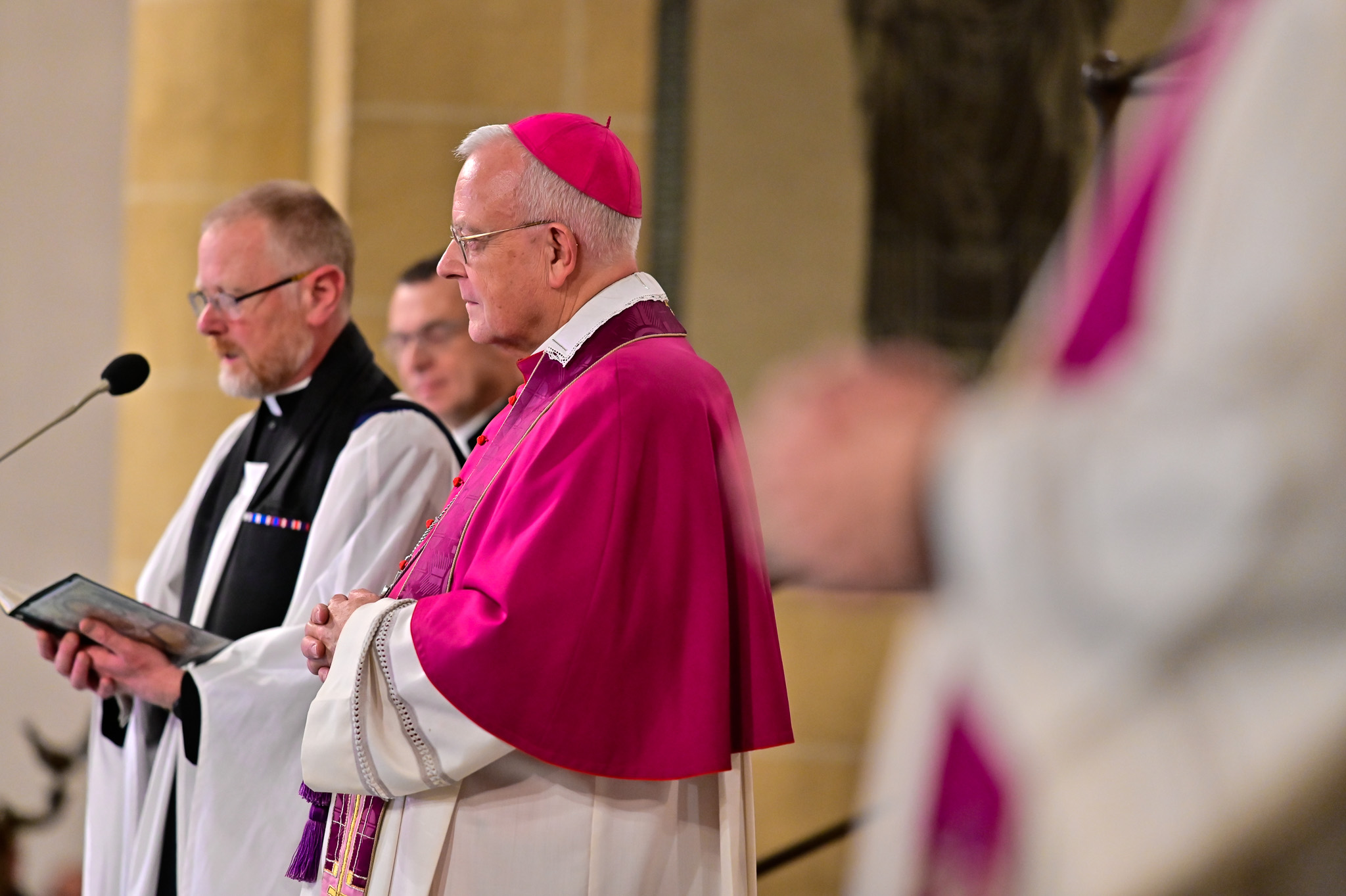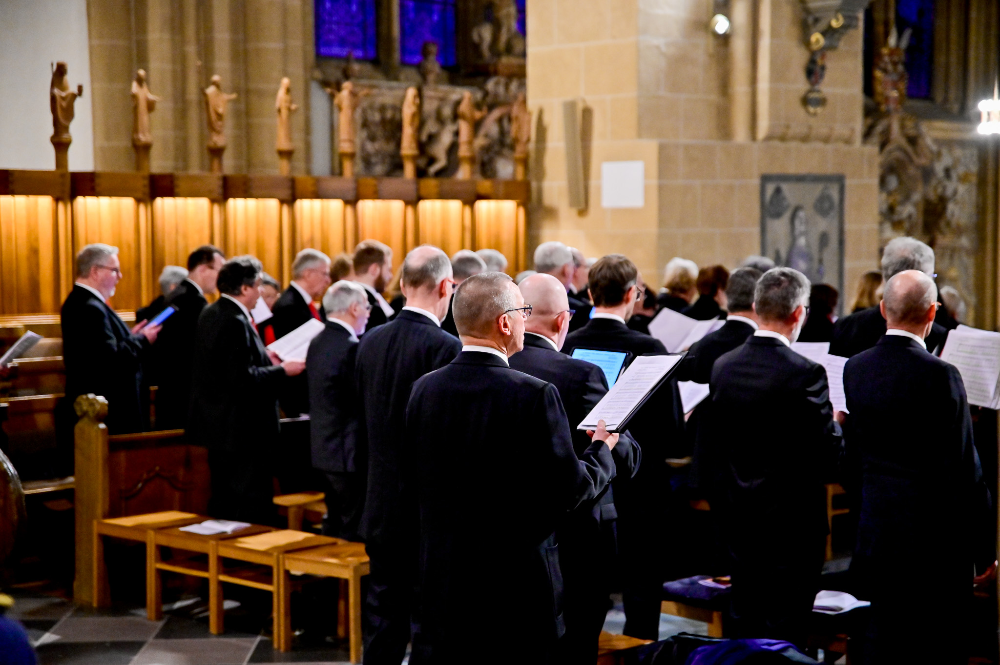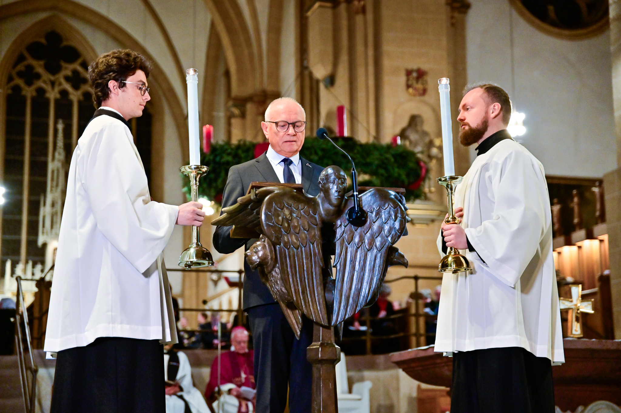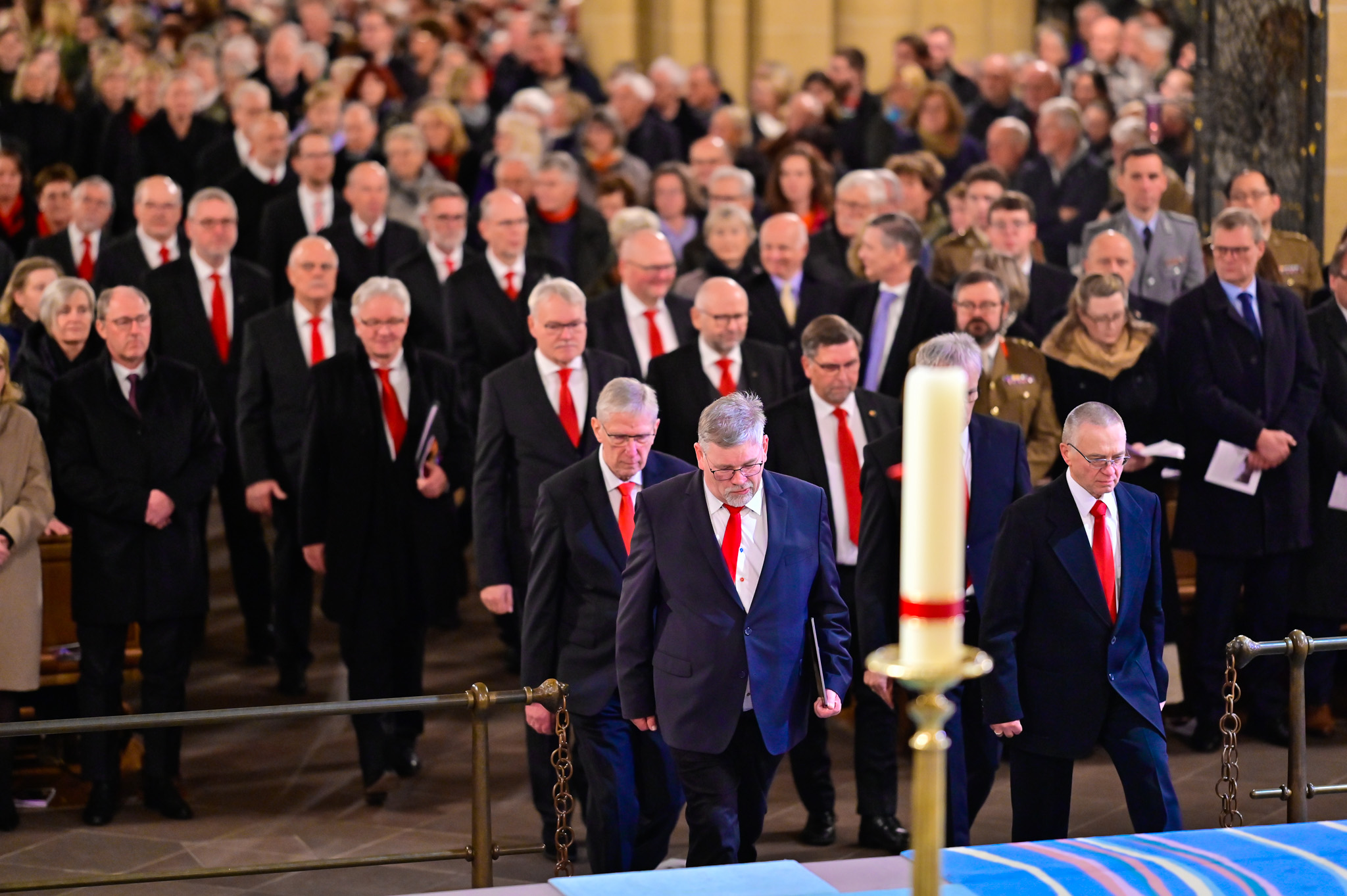 Der Deutsch-Britische Weihnachtsgottesdienst im Paderborner Dom gilt als alljährliches Fest des Glaubens, das Kulturen, Nationen und Konfessionen verbindet. Auch in diesem Jahr hat die britische Tradition der „Nine Lessons and Carols“ und die bewegende musikalische Gestaltung wieder hunderte Menschen im Paderborner Dom versammelt. Wer einen Sitzplatz ergattern wollte, musste schnell sein – lange vor Beginn des Gottesdienstes waren diese restlos belegt und auch die Seitengänge füllten sich rasch mit Gottesdienstbesuchern. Sie alle waren gekommen, um teilzuhaben an der eindrucksvollen internationalen Botschaft des Friedens und der Hoffnung, die sich in diesem Jahr vor allem an die Menschen in der Ukraine, im Sudan und im Nahen und Mittleren Osten richtete: „Trotz aller Not, aller Kriege und Krisen in der Welt: Christen haben durch alle Zeiten weitergehofft, dass Frieden möglich ist. Die Botschaft vom Friedensfürsten Jesus Christus hat ihnen dazu die Hoffnung geschenkt. Diese Botschaft will auch uns heute Abend anrühren und uns so ins Herz gehen, dass wir Botinnen und Boten des Friedens werden“, appellierte Weihbischof Matthias König zu Beginn des Gottesdienstes.