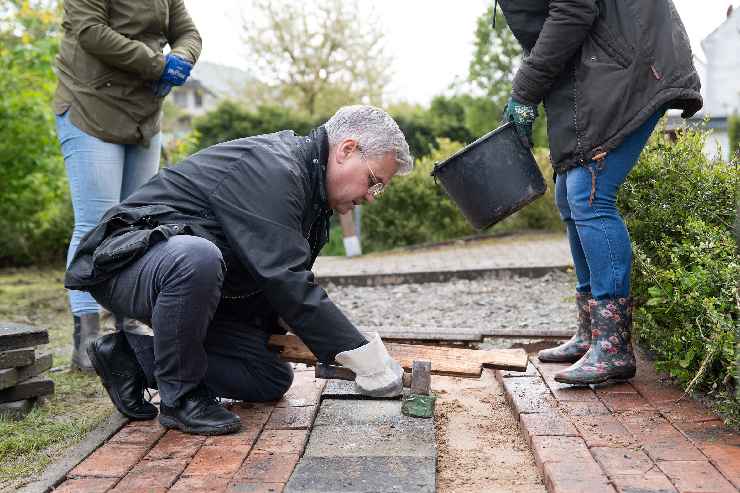 Die Wege dahin sind vielfältig. Während die Paderborner Pfadfinder St. Hedwig ihren Gruppenraum „aufgemöbelt“ haben, hat die Salzkottener Kolpingjugend die Verschönerung des Außengeländes an der Simonschule in Angriff genommen. Das dort ansässige Jugendzentrum ist ein Ort der Begegnung für die rund 340 Mitglieder der Salzkottener Kolpingsfamilie. Hier treffen sich Kinder und Jugendliche nach der Schule, essen gemeinsam, erledigen ihre Hausaufgaben und verbringen Zeit mit ihren Freunden. Die Motivation, gemeinsam viel zu erreichen, ist entsprechend hoch und die To-Do-Liste umfangreich: Wege pflastern, Hochbeete errichten und Paletten-Möbel bauen. All das gilt es in 72 Stunden und unter erschwerten Wetterbedingungen abzuarbeiten.