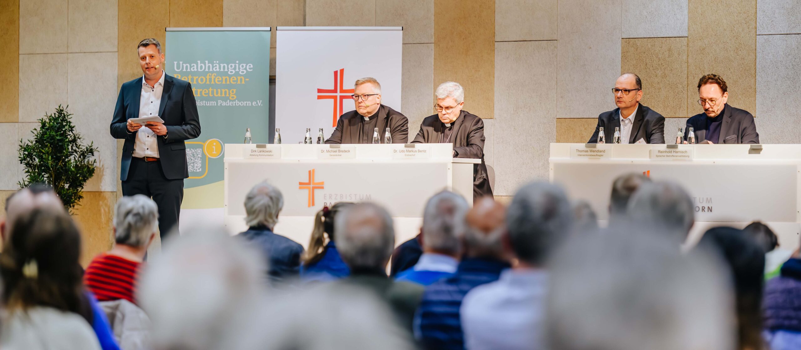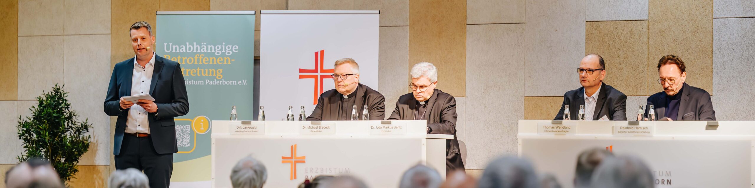 Erzbischof Dr. Udo Markus Bentz, die Generalvikare Thomas Dornseifer und Dr. Michael Bredeck, der Interventionsbeauftragte Thomas Wendland sowie Mitglieder der Betroffenenvertretung stellten sich den Fragen der Teilnehmenden und suchten bewusst den direkten Dialog. Ziel war es, Raum auch für sehr persönliche Rückmeldungen zu schaffen und die unterschiedlichen Perspektiven wahrzunehmen. Zugleich wurde deutlich, dass die Aufarbeitung nicht mit der Veröffentlichung der Studie abgeschlossen ist, sondern als fortlaufender Prozess verstanden wird. (Weitere Informationen dazu unter www.erzbistum-paderborn.de/aufarbeitung )