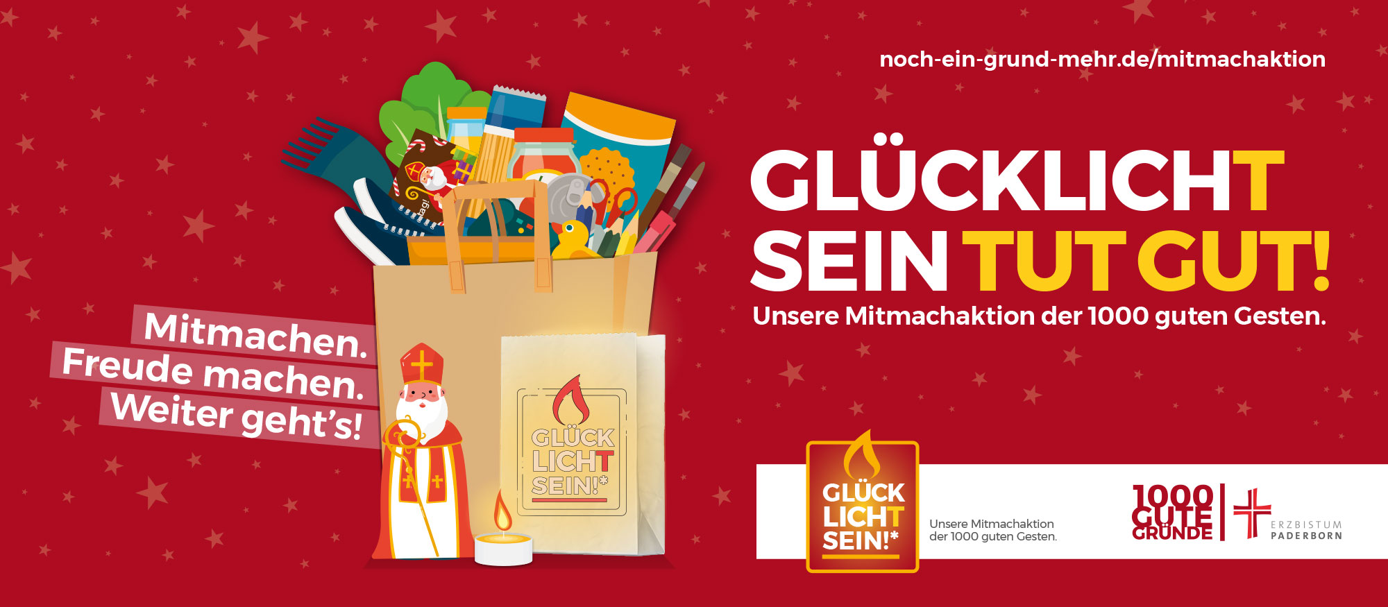 Die Mitmachaktion GLÜCKLICH/T SEIN! ist noch in vollem Gange. Aber schon vor dem offiziellen Finale zeichnet sich der Erfolg der Aktion ab. Überall im Erzbistum Paderborn beteiligen sich Gruppen und Einzelpersonen an der Initiative. In Büren aber sind besonders viele Einrichtungen und noch mehr Menschen dabei, Gutes zu tun: An Kitas, in Grundschulen und weiterführenden Schulen, in den Pfarrgemeinderäten und Kirchenvorständen werden Lebensmittelspenden und Spielsachen gesammelt, werden Geschenktüten gepackt. Und noch mehr wird darüber gesprochen, wie wir durch gute Taten und freundliche Gesten unseren Mitmenschen eine Freude bereiten können.