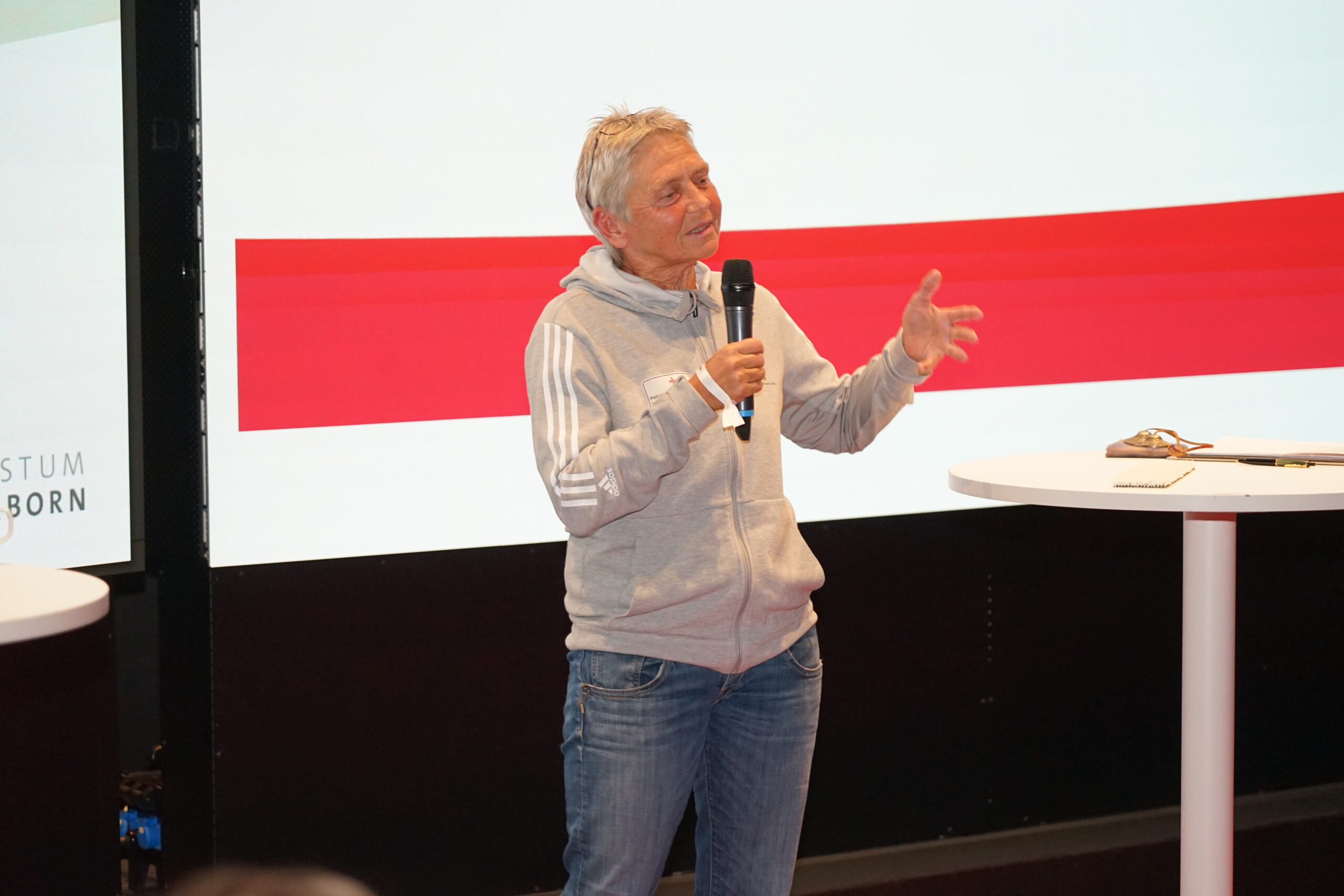 Mit Petra Landers sprach eine Pionierin des Frauenfußballs in der ersten Keynote über ihre Erfahrungen aus einer Zeit, in der Frauenfußball noch wenig Beachtung fand. Landers gewann mit der SSG 09 Bergisch Gladbach die damals noch inoffizielle Weltmeisterschaft 1981 in Taiwan und wurde später Europameisterin, Deutsche Meisterin und DFB-Pokal-Siegerin. „Ich wollte einfach Fußball spielen und habe dafür alle Hürden genommen“, berichtete sie.