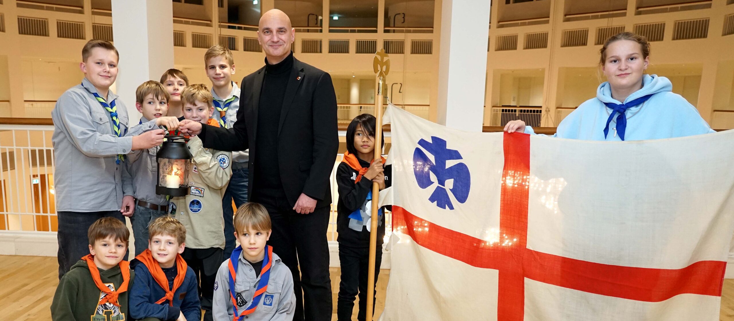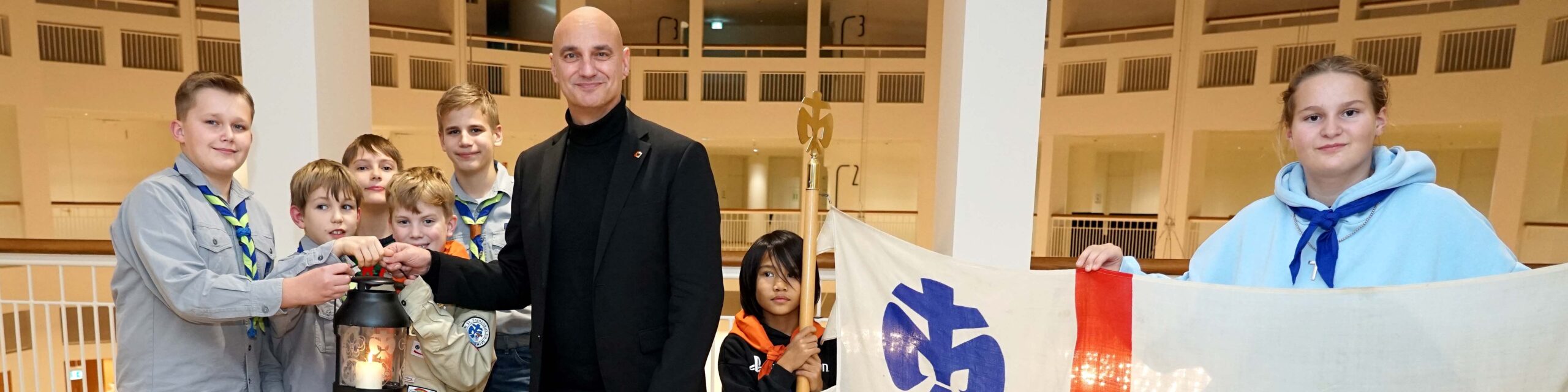 Das Friedenslicht aus Bethlehem brachten am Montagabend (15. Dezember 2025) Pfadfinderinnen und Pfadfinder in das Dortmunder Rathaus. Die Kinder und Jugendlichen wurden dort von Oberbürgermeister Alexander Kalouti empfangen, der sich darüber freute, dass das Weihnachtssymbol für Frieden nun auch im Rathaus brennt. In einem ökumenischen Gottesdienst mit rund 800 Teilnehmerinnen und Teilnehmern in der St.-Josephs-Kirche war das Friedenslicht aus Bethlehem am Sonntag in Dortmund angekommen. Pfadfinderinnen und Pfadfinder bringen es von dort aus weiter in ihre Gemeinden, Familien und an viele weitere Orte. In das Dortmunder Rathaus brachten es Gruppen vom Stamm Humboldt des evangelischen Verbandes VCP aus Eichlinghofen und von der katholischen DPSG aus Dortmund-Körne. Oberbürgermeister Alexander Kalouti dankte den Kindern, Jugendlichen und ihren Leiterinnen und Leitern für das Engagement für Frieden und Zusammenhalt.