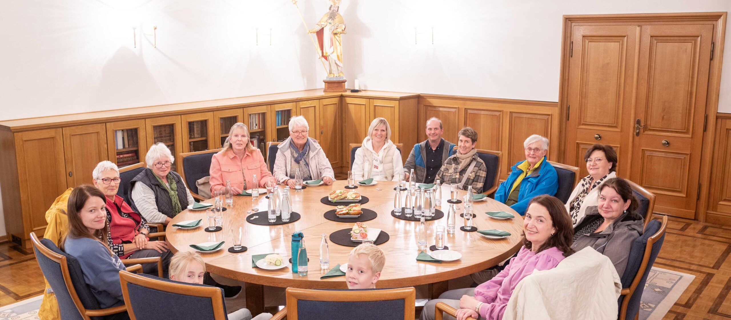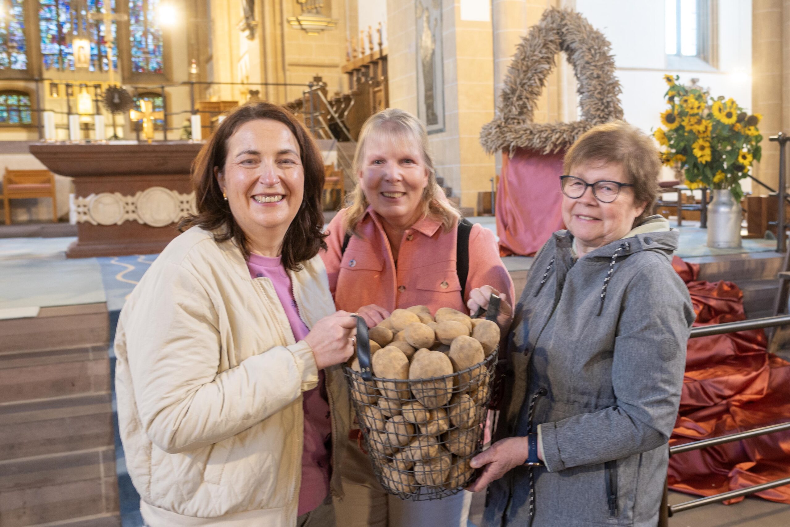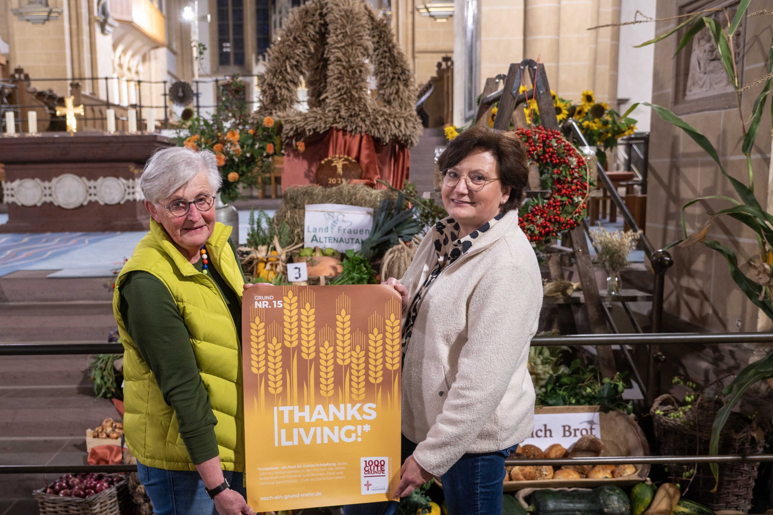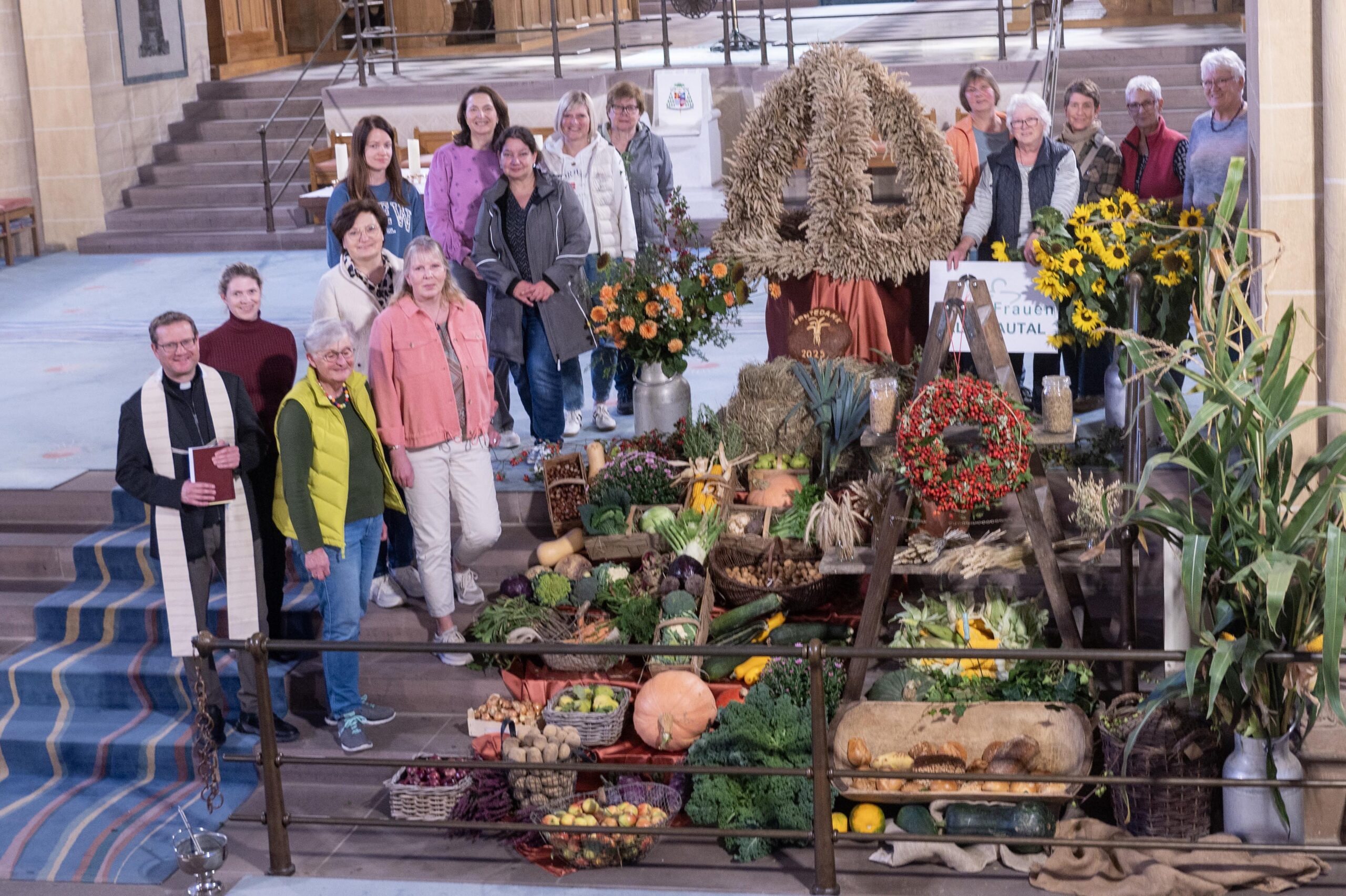 Landfrauen aus dem Ortsverband Altenautal des Kreislandfrauenverbandes Paderborn-Büren – Josefine Ernesti, Silvia Knaup, Stefanie Wulf, Cornelia Ernesti, Tanja Krois, Stefanie Niggemeyer, Rita Rosenkranz, Katharina Agethen, Elisabeth Schulte, Claudia Günther, Edeltraud Wegener-Schöpplein, Annemarie Risse – stellten die Erntekrone auf und schmückten den Altarraum der Kathedralkirche des Erzbistums Paderborn. Als Vorsitzende des Kreislandfrauenverbandes Paderborn-Büren erinnerte Maria Büser aus Delbrück daran, dass die Niederschläge in der Region sehr unterschiedlich waren, die Ernte zunächst früh gestartet sei, dann sich sehr verzögert habe. „Wir haben ein recht trockenes Jahr erlebt und das spiegelt sich auch in den Ernte-Erträgen wider.“