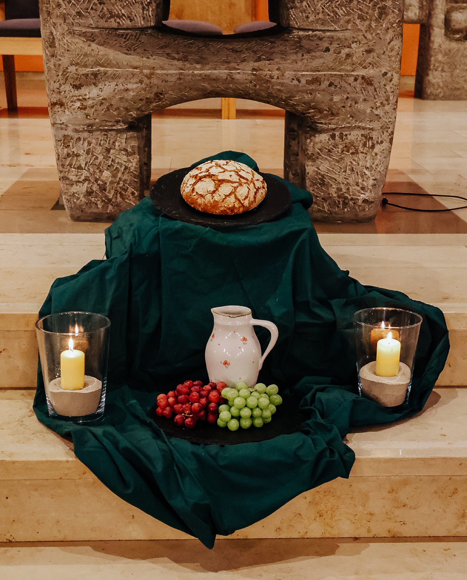 Adrian Koczy, ständiger Diakon und im Hauptberuf Pflegedienstleiter in der Seniorenhilfeeinrichtung Maria Rast in Herford, verwies auf ein Kirchenfenster, das die Begegnung Abrahams mit Gott in der Gestalt von „drei Männern“ am Hain Mamre (Gen 18) darstellt: „Sie kamen und wurden herzlich von Abraham und Sarah empfangen. Dann teilten sie Sarah mit, dass sie einen Sohn bekommen wird. Das ist eine Episode, die fast identisch im Koran vorkommt.“ Vor dem Altar lagen symbolisch Brot, Wasser und Weintrauben. „Mit Abraham haben wir einen Vater des Glaubens, eine wichtige Persönlichkeit, die in beiden Religionen eine große Bedeutung hat.“