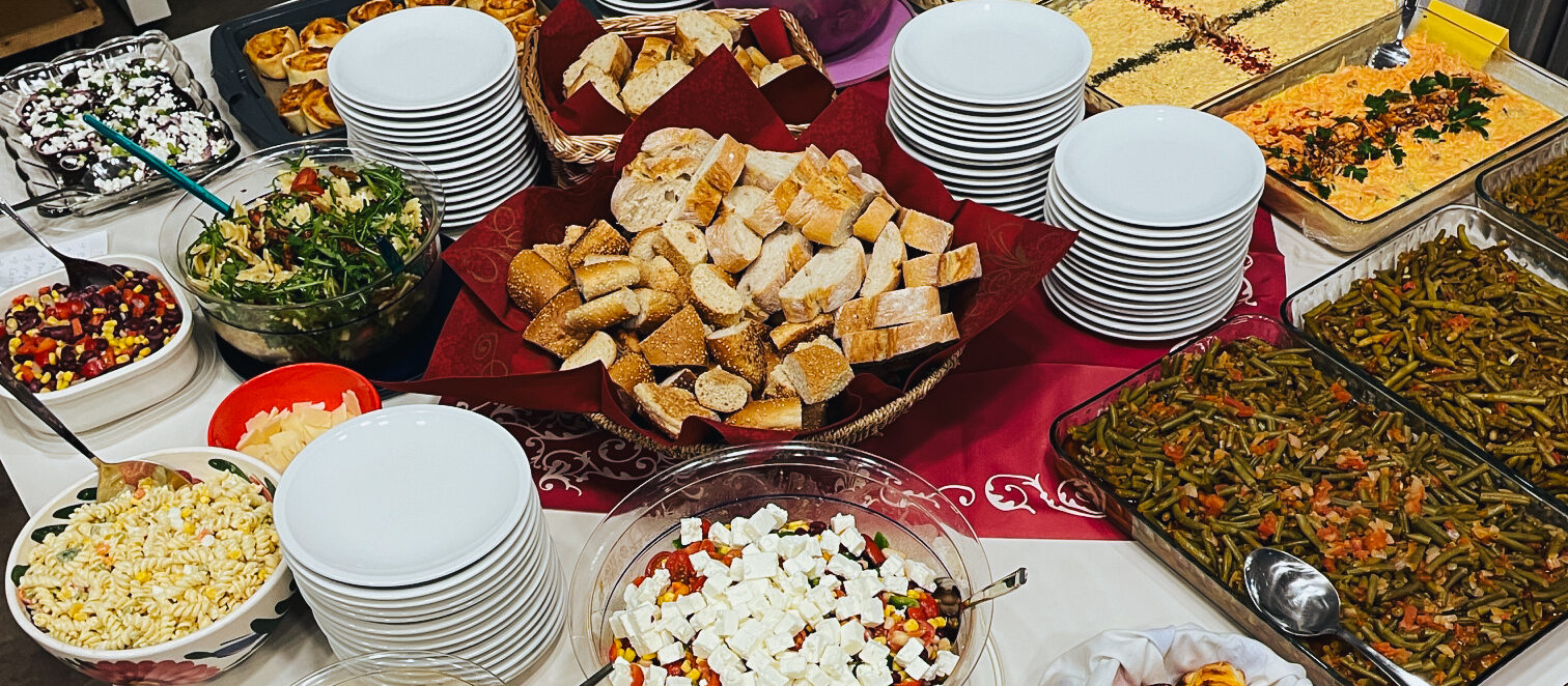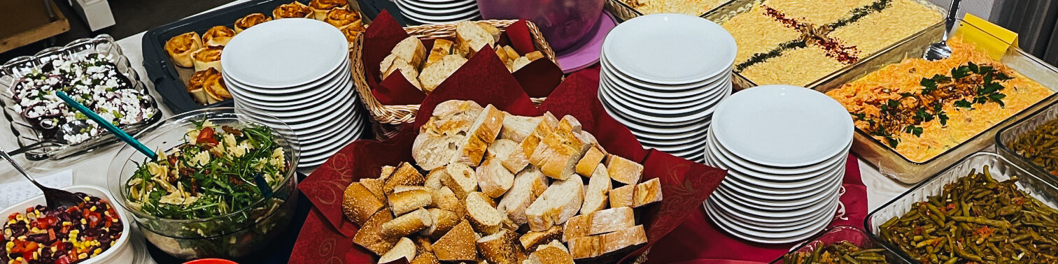 Jetzt war es endlich soweit und das Entdecken von Gemeinsamkeit setzte sich am Mitbring-Buffet ungezwungen fort. Diakon Koczy schildert seine Eindrücke: „Alle haben ein sehr gutes Essen vorbereitet und: Wir saßen nicht getrennt nach Religionen, sondern gemischt, das war sehr schön. So sind persönliche Gespräche entstanden. Wir haben von den Schicksalen der Menschen gehört, wie sie nach Deutschland kamen, und was sie jetzt planen.“