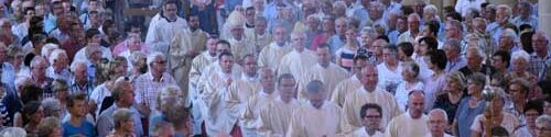 Der Hohe Dom zu Paderborn war beim Pontifikalamt mit dem Landvolk am Libori-Dienstag voll besetzt. Erzbischof Wiktor Skworc stand dem feierlichen Gottesdienst vor.pdp / Thomas ThroenleDer Erzbischof der in Polen gelegenen Diözese Kattowitz, Erzbischof Wiktor Skworc, feierte am Libori-Dienstag das traditionelle Pontifikalamt mit dem Landvolk im Hohen Dom zu Paderborn. Im Hinblick auf das Leitwort des Libori-Festes und das 950-jährige Weihejubiläum des Paderborner Domes sagte er: „Der Hohe Dom zu Paderborn ist im Laufe der Zeit für viele ein Symbol der Heimat und ein fester Anhaltspunkt geworden, weil er immer an eines erinnert, an das Ziel unseres Lebens, an das ewige ‚Domus Dei‘, an Gott, der sich als Liebe durch Jesus Christus offenbart hat.“ Weihbischof Dr. Dominicus Meier OSB hatte den Erzbischof von Kattowitz, die zahlreichen Konzelebranten und Gottesdienstteilnehmer zu Beginn des feierlichen Pontifikalamtes begrüßt.