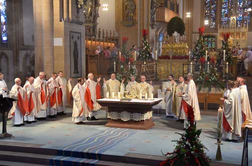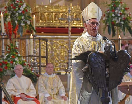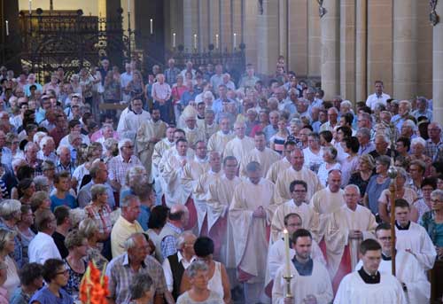 Im vor 950 Jahren geweihten Dom würden sich Menschen aus der Stadt und der Umgebung „behütet und bedacht“ fühlen, sagte Erzbischof Skworc in seiner Predigt. „Hier im Paderborner Dom begegnen die Menschen Gottes Liebe, hier erfahren sie im Sakrament der Versöhnung die Barmherzigkeit Gottes, hier haben sich Generationen von Menschen durch den Leib und das Blut Christi gestärkt, hier haben die Paderborner Bischöfe viele Priester und Bischöfe geweiht, um die Verkündigung des Evangeliums zu ermöglichen und zu sichern.“ Im Paderborner Dom sei die „Communio, die Gemeinschaft zwischen Gott und den Menschen Wirklichkeit geworden. Unter dem Dach dieses Domes ist die Kirche als Gemeinschaft der Gläubigen entstanden“, so der Erzbischof von Kattowitz.
