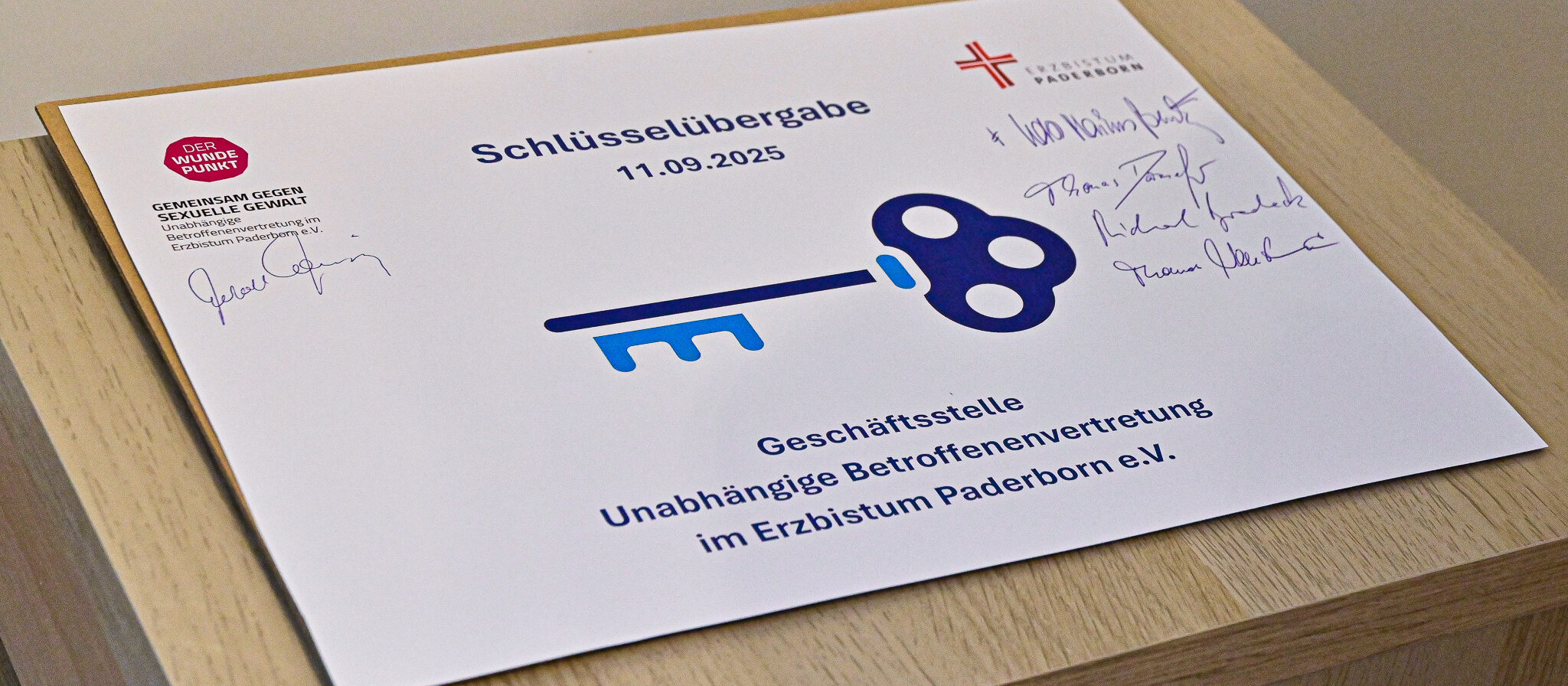 Die Unabhängige Betroffenenvertretung e. V. im Erzbistum Paderborn bezieht eigene Räumlichkeiten: An der Alten Synagoge 6, über den Geschäftsräumen der Consoldio GmbH, entstehen aktuell Arbeits- und Besprechungszimmer, die einen geschützten Raum für Betroffene von sexueller Gewalt in der Kirche bieten sollen. Stellvertretend für die Unabhängige Betroffenenvertretung hat deren Vorstandsvorsitzender Reinhold Harnisch jetzt die Schlüssel zu den Räumen entgegengenommen.