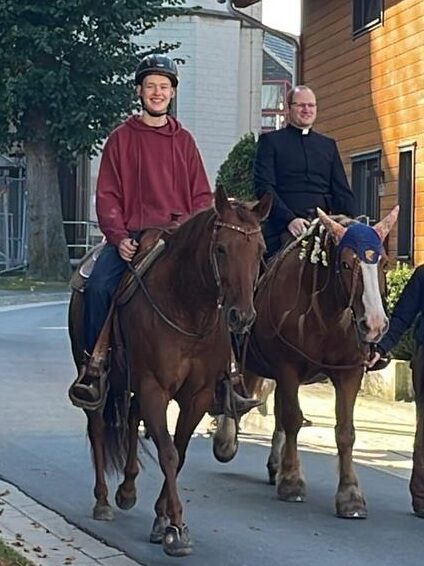 Im vergangenen Jahr erlebte im Pastoralen Raum Soest eine Reiterprozession ihre Premiere. Bei blauem Himmel und strahlendem Sonnenschein machten sich 300 Teilnehmerinnen und Teilnehmer, Vereins- und Fahnenabordnung, zahlreiche Pferde mit ihren Reitern aber auch eine größere Zahl Gespanne, darunter eines mit einer großen Erntekrone, auf den Weg von der St. Antonius-Kapelle in Bettinghausen zum etwa eine halbe Stunde Fußweg entfernten Versuchs- und Bildungszentrum Landwirtschaft Haus Düsse. Und so – oder so ähnlich – soll es auch beim Erntedankfest am Sonntag, 5. Oktober, wieder werden. Pastor Michael Stiehler und Messdiener Maximilian Arp als Initiatoren schildern im Doppel-Interview mit Reinhold Großelohmann die Motivation, die diesem Projekt zugrunde liegt, ein Projekt, das schon in der Vorbereitung zu einem großen Gemeinschaftswerk wurde.