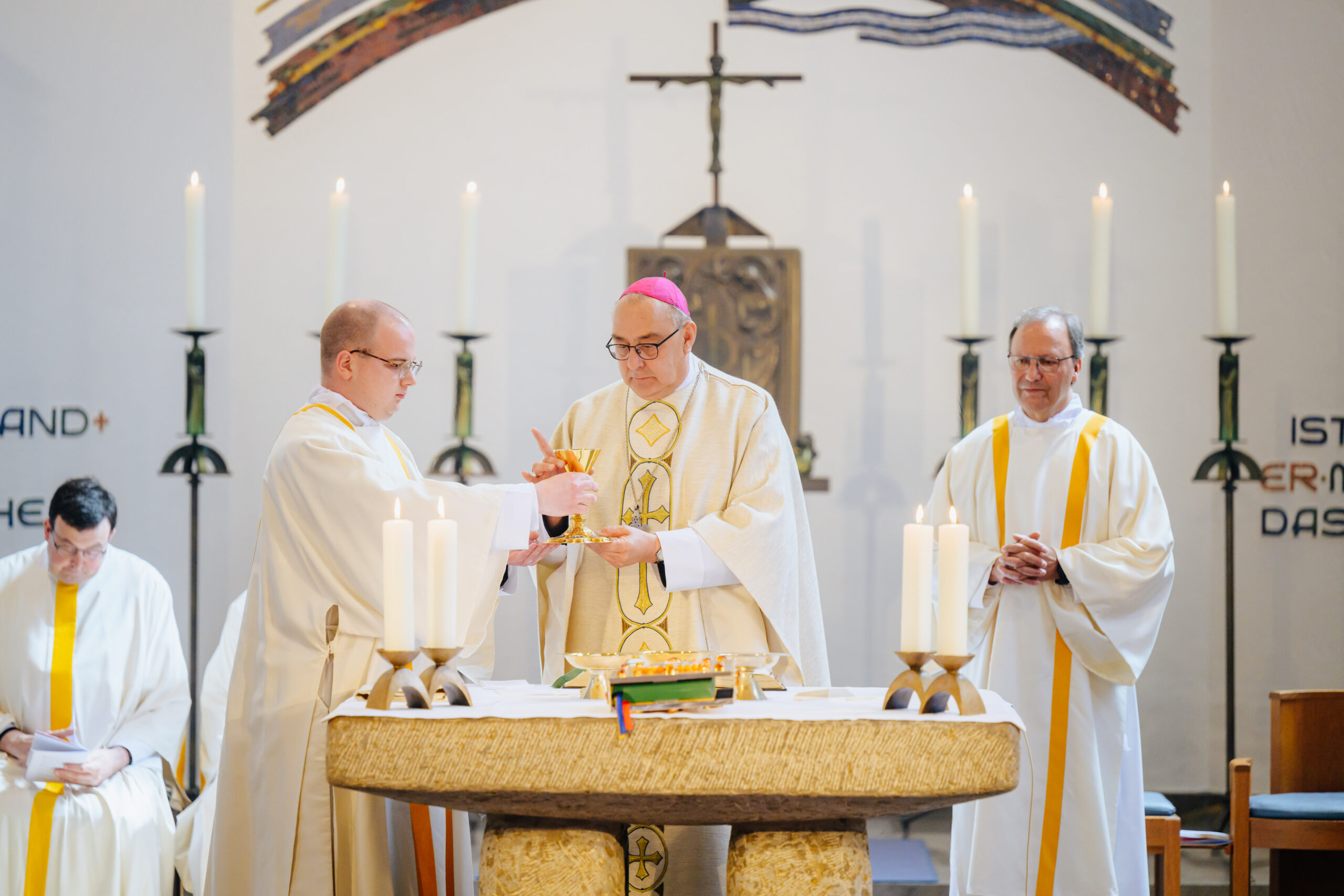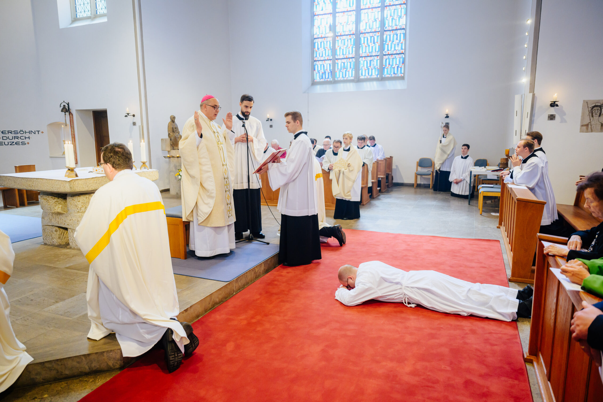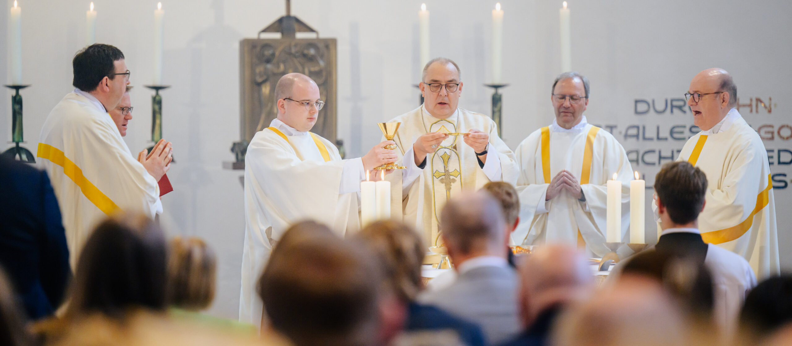 Zum Abschluss seiner Predigt betonte Weihbischof Dominicus im Hinblick auf das Dienstamt eines Diakons: „Derjenige, der von der Kirche zum Diakon bestellt wird, ist Bote eines Größeren, dessen, der bei den Menschen ankommen will. Er hat als Bote so zu handeln, dass in ihm der Sendende zu erkennen ist: der Herr selbst!“ Im Verzicht auf den eigenen Status und das eigene Renommee, in der Achtung des Gegenübers und der Fürsorge für Schwache, im Verzicht auf Gewalt und einer Lebensführung, die nicht nur Dienst heuchle, sondern Dienst durch und durch sei, werde deutlich, wie konkret die Nachfolge Jesu werden könne. „Der Diakon ist einer, der durch seine Dienste unter den Menschen verkündet, dass der Eigentliche nach ihm kommt! Durch den Dienst des Diakons hindurch soll man auf Christus schauen können. Man muss über den Diakon hinausschauen können, er darf seinen Meister nicht verstellen.“