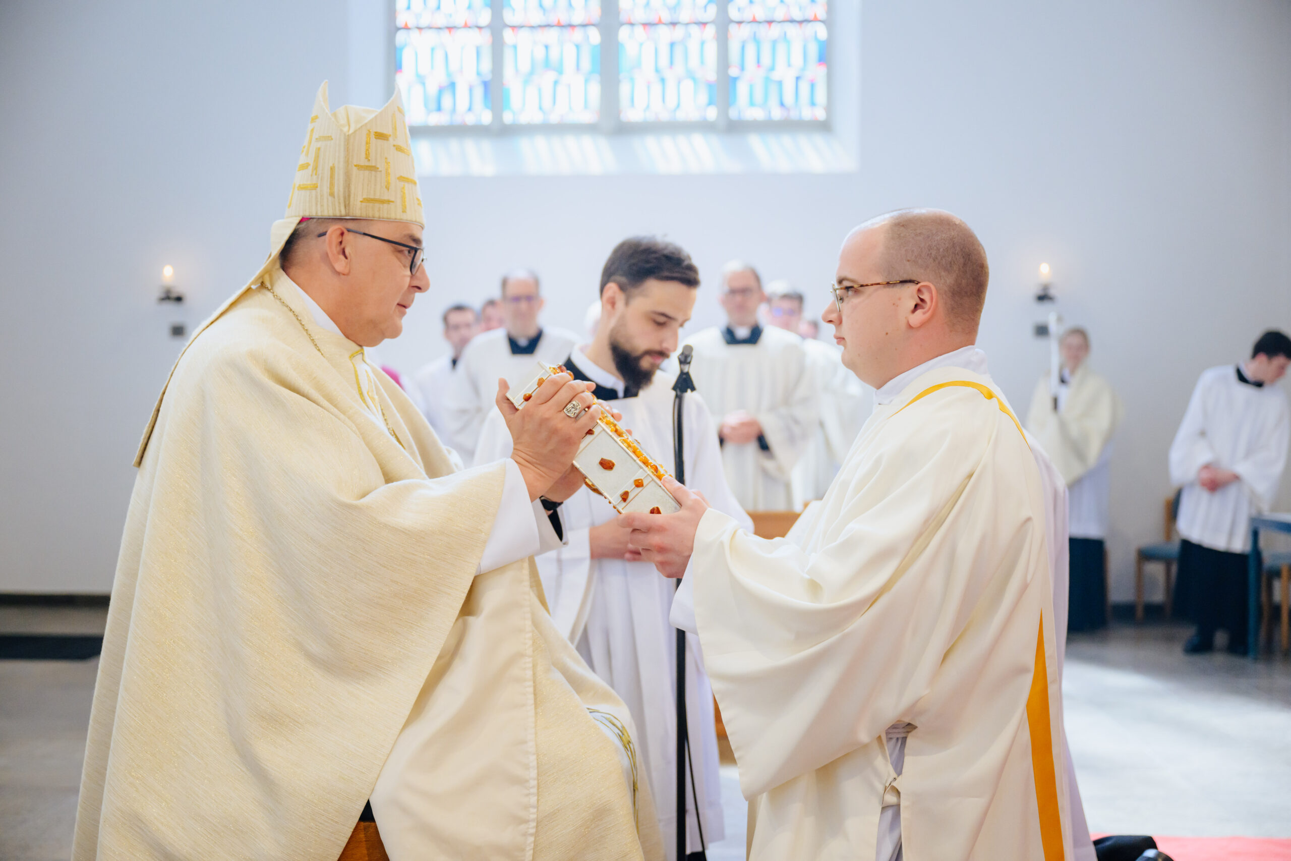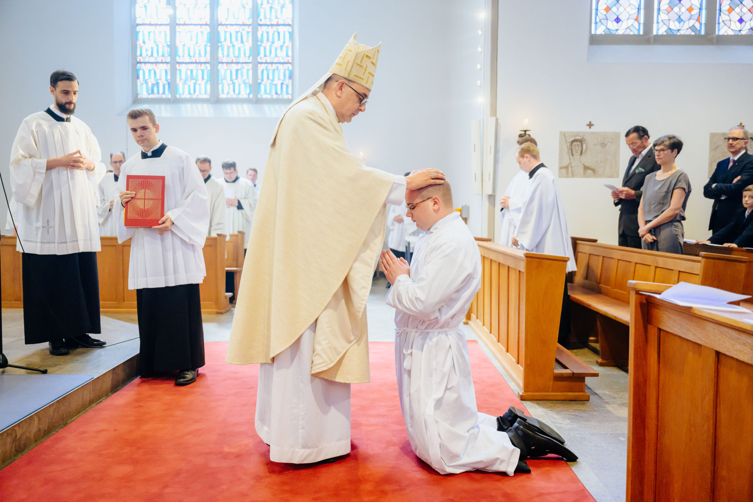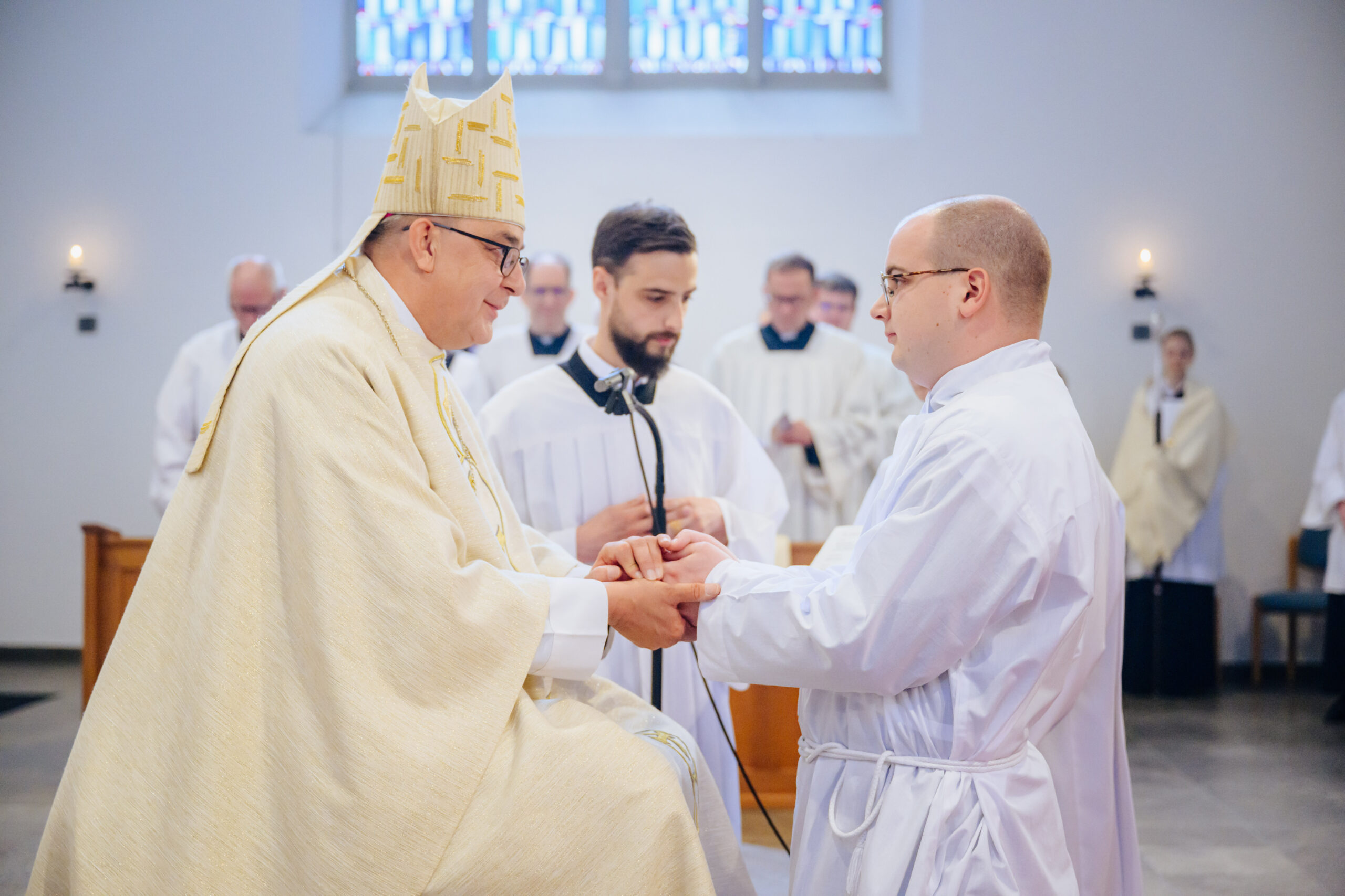 Zum Abschluss seiner Predigt betonte Weihbischof Dominicus im Hinblick auf das Dienstamt eines Diakons: „Derjenige, der von der Kirche zum Diakon bestellt wird, ist Bote eines Größeren, dessen, der bei den Menschen ankommen will. Er hat als Bote so zu handeln, dass in ihm der Sendende zu erkennen ist: der Herr selbst!“ Im Verzicht auf den eigenen Status und das eigene Renommee, in der Achtung des Gegenübers und der Fürsorge für Schwache, im Verzicht auf Gewalt und einer Lebensführung, die nicht nur Dienst heuchle, sondern Dienst durch und durch sei, werde deutlich, wie konkret die Nachfolge Jesu werden könne. „Der Diakon ist einer, der durch seine Dienste unter den Menschen verkündet, dass der Eigentliche nach ihm kommt! Durch den Dienst des Diakons hindurch soll man auf Christus schauen können. Man muss über den Diakon hinausschauen können, er darf seinen Meister nicht verstellen.“