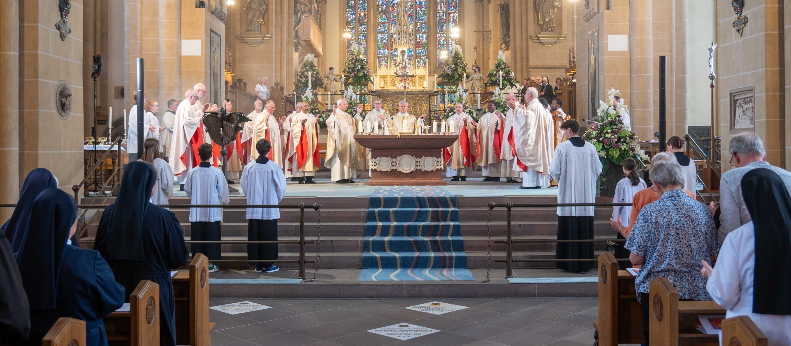 Erzbischof Dr. Udo Markus Bentz und Weihbischof Matthias König feierten am Mittwoch der Libori-Woche mit zahlreichen Ordensfrauen und Ordensmännern, Missionarinnen und Missionare im Hohen Dom ein festliches Pontifikalamt. Die Ordens-Christen prägten durch ihre sichtbare Präsenz mit Ordensgewändern sowie durch Begegnungen und Gespräche „ihren“ Tag der Libori-Festwoche. Die Berufung durch Gott, der erste Ruf Gottes an einen Menschen müsse täglich neu gehört und in immer neuen Anläufen beantwortet werden, betonte der neue Paderborner Erzbischof in seiner Predigt. Der Vorstand der Paderborner Ordenskonferenz (POK) hatte den Gottesdienst gemeinsam mit dem Ordensreferat im Erzbischöflichen Generalvikariat vorbereitet. Am Nachmittag trafen Erzbischof Dr. Udo Markus Bentz und Weihbischof Matthias König Missionarinnen und Missionare, die im Erzbistum Paderborn ihre Wurzeln haben, aber in verschiedenen Ländern ihren missionarischen Dienst tun.