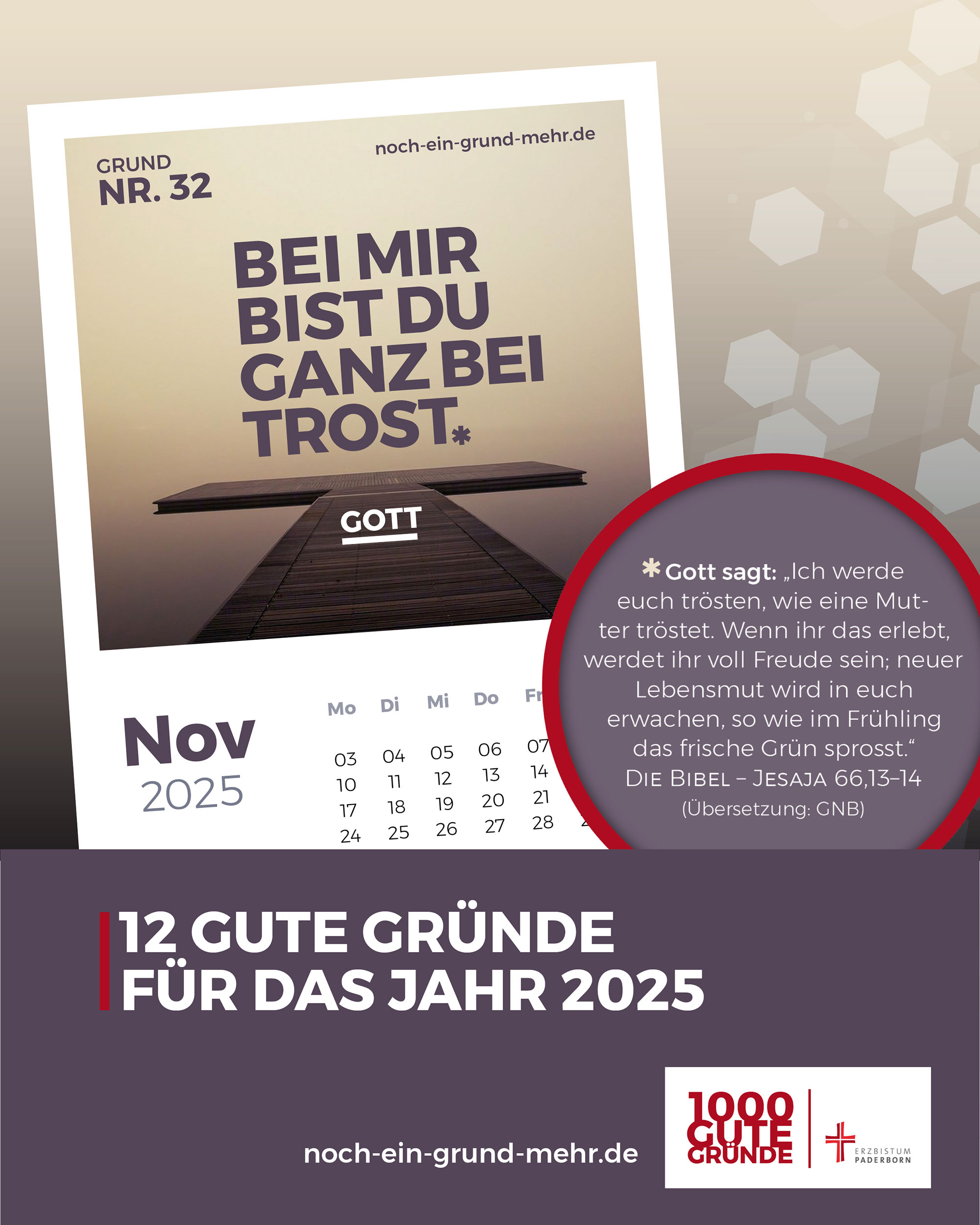 Trost zu finden, ist ein Geschenk – Trost von Mensch zu Mensch, Trost in einer unverhofften Situation, in einer tröstenden Melodie, manchmal auch einfach nur, indem man den Tränen freien Lauf lässt. Eines gilt mit tröstlicher Sicherheit: Selbst in aller Verzweiflung, in der uns der Trost scheinbar fehlt, bleiben wir bei Gott „ganz bei Trost“. Bei Gott sind wir „Von guten Mächten wunderbar geborgen“. Dietrich Bonhoeffer schrieb diesen Text kurz vor dem Weihnachtsfest 1944 aus dem Gefängnis an seine Familie – wenige Monate vor seiner Hinrichtung. Seine Worte aus einer scheinbar hoffnungslosen Situation sind für viele eine Zusage geworden, „ganz im Trost Gottes“ zu sein – und auf gutem Grund Halt zu finden.