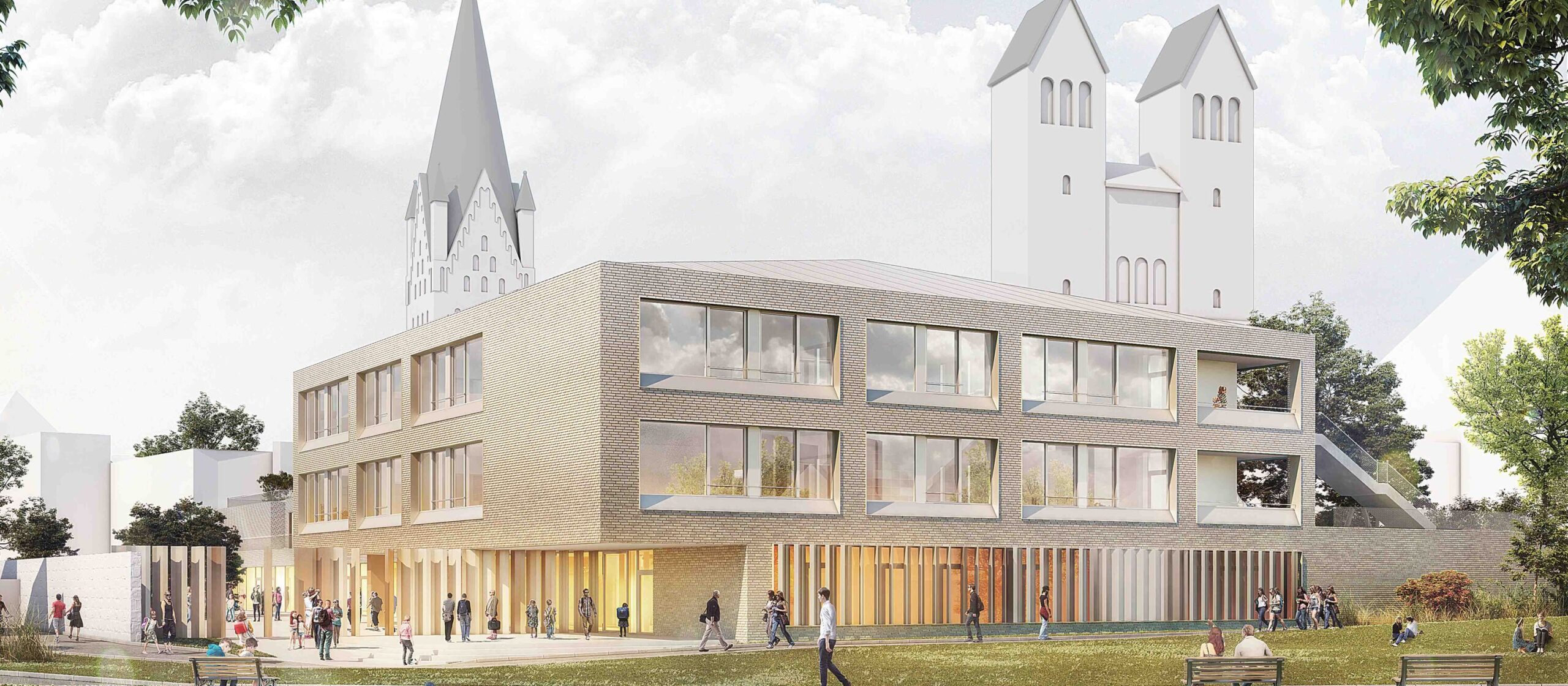 Die vom Erzbistum Paderborn getragene und 2020 eingeweihte Grundschule St. Michael ist ein architektonischer Blickfang, der das Stadtbild von Paderborn prägt. Zudem sorgt sie dafür, dass das Lernen und Lehren hier in einer pädagogisch-konzeptionell durchdachten Architektur viel Spaß machen. Jetzt wurde der innovative Schulbau vom Ministerium für Schule und Bildung des Landes Nordrhein-Westfalen sowie der Architektenkammer Nordrhein-Westfalen mit dem Schulbaupreis NRW 2023 ausgezeichnet. Eine Delegation um Dompropst Monsignore Joachim Göbel und Schulleiterin Anne Cordes nahm den Preis aus den Händen von Schulministerin Dorothee Feller und Dipl.-Ing. Ernst Uhing als Präsident der Architektenkammer NRW entgegen.