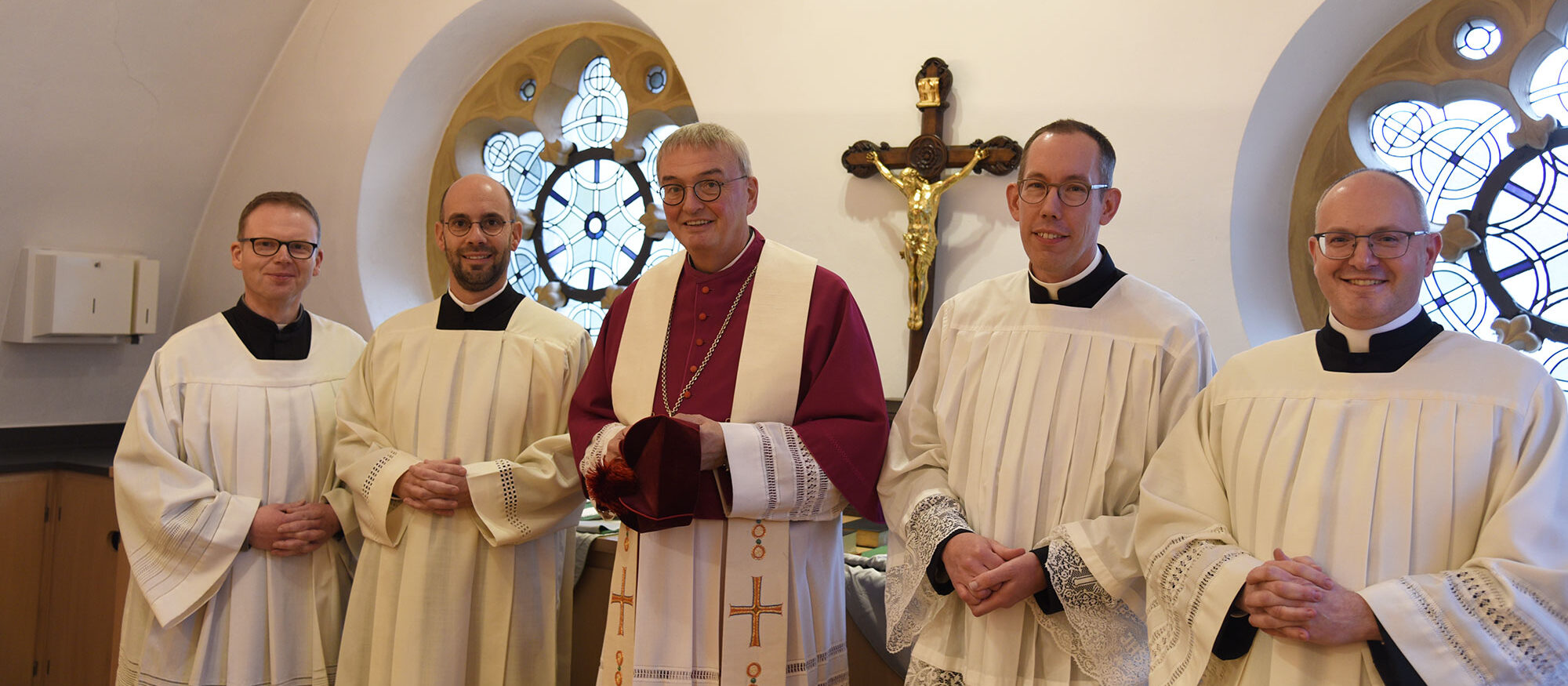 Die Herausforderungen für einen Pfarrer als Verantwortlichen einer Kirchengemeinde seien heute komplex, machte Prälat Dornseifer in seiner Ansprache deutlich: „Die Pastoralen Räume sind groß, es gibt viele Anfragen an die Kirche.“ Ein Satz in der kürzlich veröffentlichten, „ernüchternden“ Kirchenmitgliedschaftsstudie lasse jedoch aufhorchen, gab der Ständige Vertreter des Paderborner Diözesanadministrators den vier Priestern mit auf den Weg: „An der Basis, da wo ihr mit euren Teams für Menschen da seid und zuhört, wird Kirche positiv wahrgenommen. An den Wendepunkten des Lebens, steht ein Fragen und Suchen, bei dem ihr Menschen begleitet.“ Diözesanadministrator Msgr. Dr. Michael Bredeck sei „dankbar, dass ihr euch in eurer Leitungsfunktion dieser Verantwortung stellt“. Auch der heilige Liborius habe im 4. Jahrhundert nicht in „einfachen Zeiten der Kirchengeschichte“ Verantwortung übernommen. „Vertraut deshalb auf die Fürsprache unseres Bistumspatrons auf Jesus Christus, der euch sendet“, ermutigte Prälat Thomas Dornseifer die vier Priester.