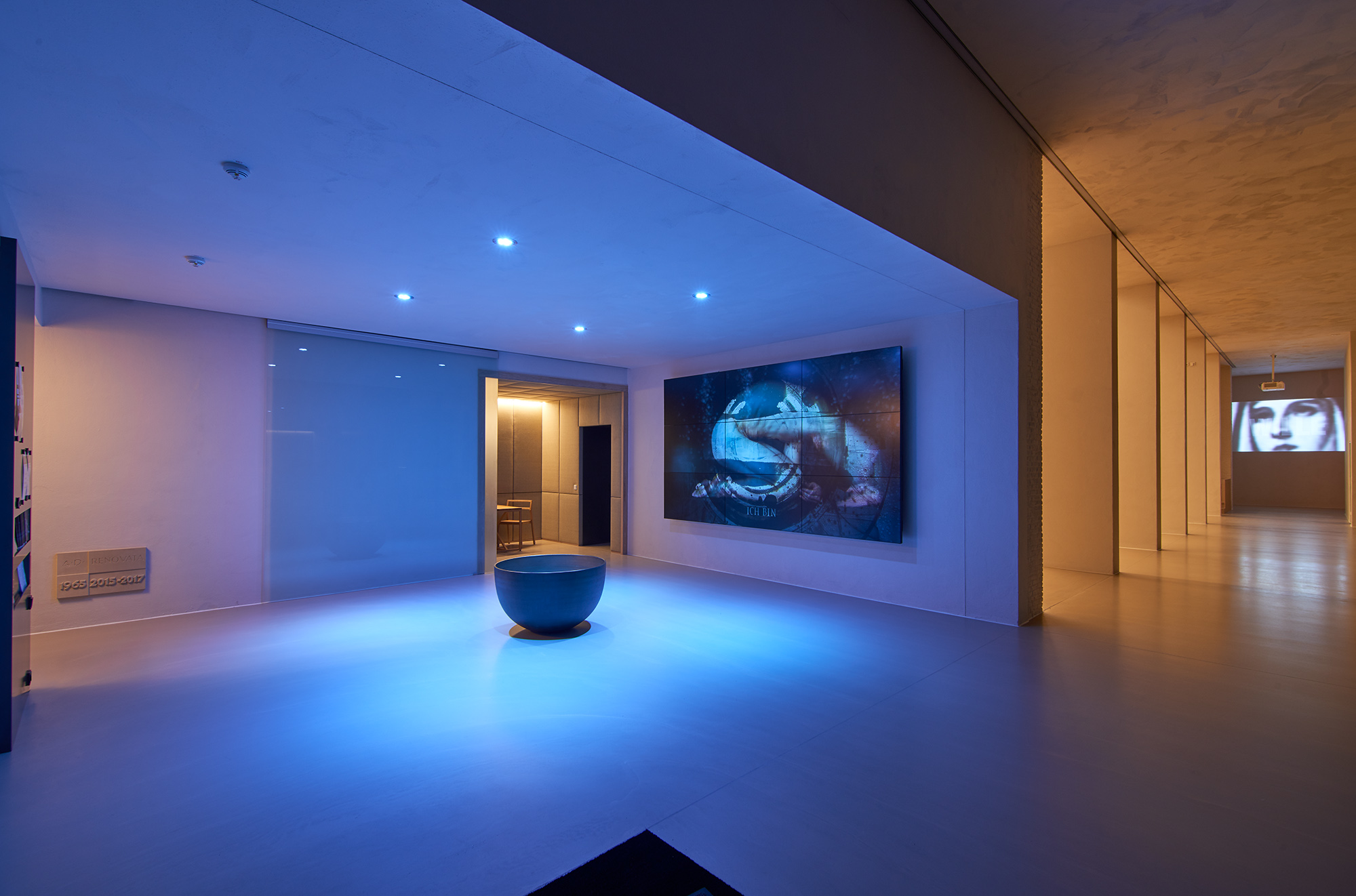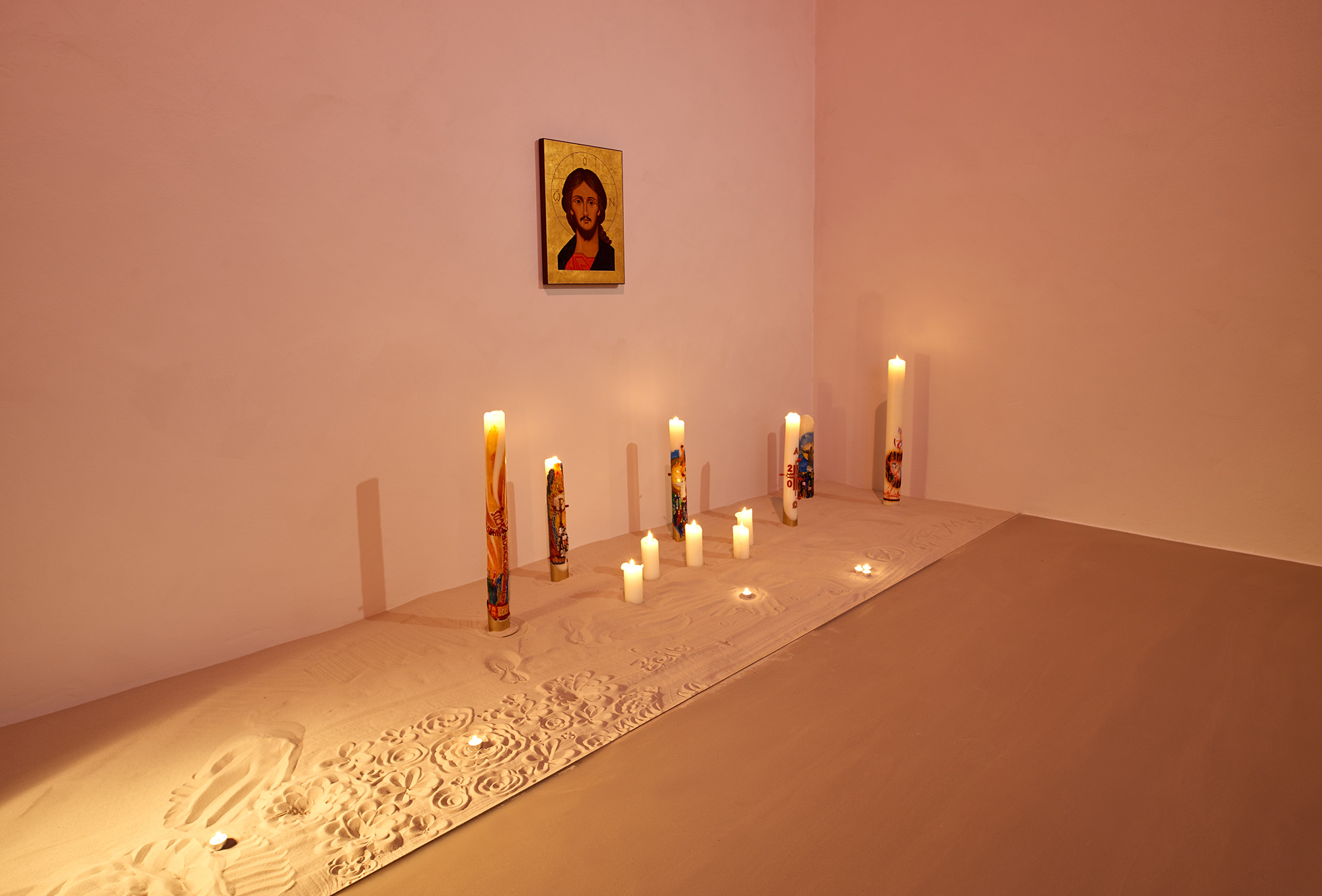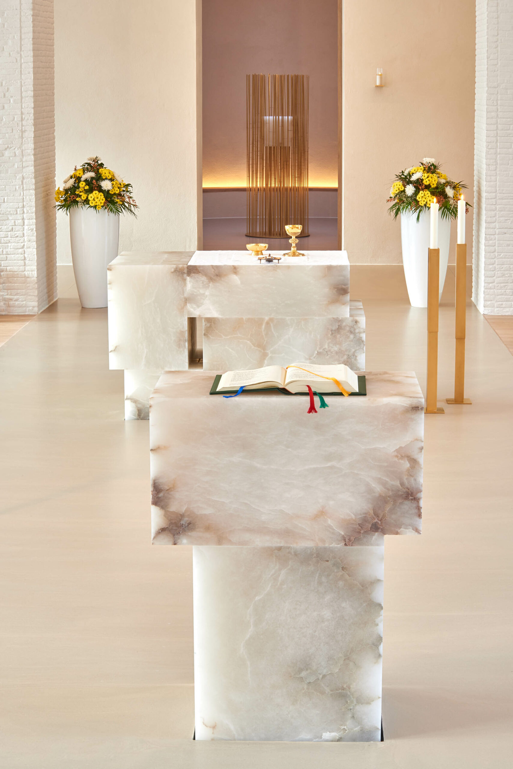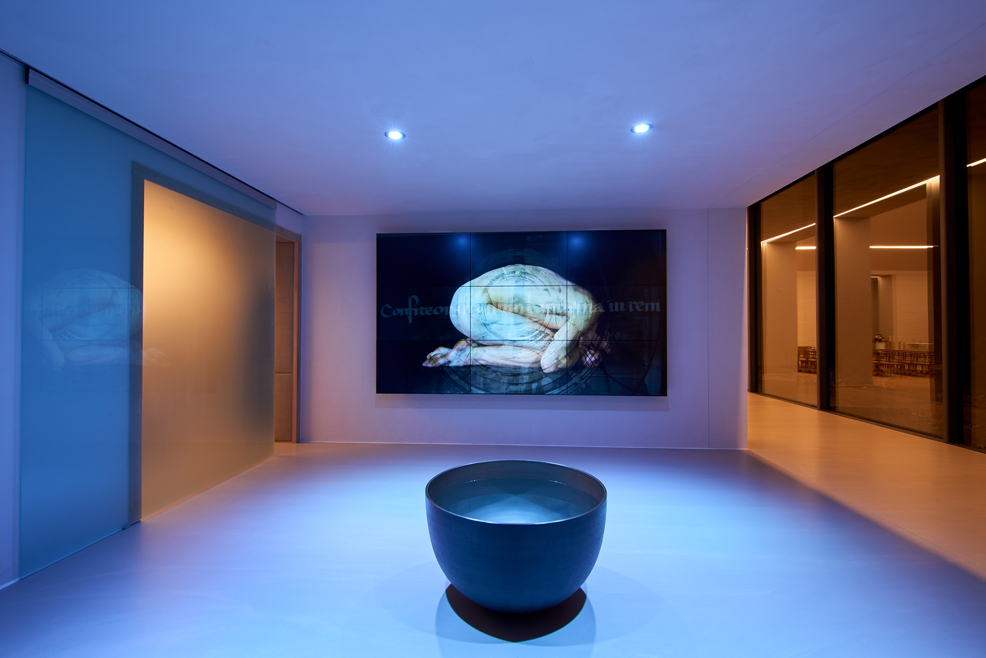 Nur ein paar Schritte vom Haupthaus entfernt liegt die 2017 nach einem Umbau neu geweihte Kirche des Jugendhauses und der Landvolkshochschule – auch die Landvolkshochschule ist als Bildungseinrichtung des Erzbistums Paderborn in Hardehausen beheimatet. In der Kirche herrscht eine ganz andere Stimmung als bei der Essensausgabe. Der Eingangsbereich der modernen Architektur ist in blaues Licht getaucht. Junge Menschen, die noch vor wenigen Minuten munter durcheinander quasselten, kommen hier wie durch ein Wunder ganz von selbst zur Ruhe, die Gespräche verstummen. Oder ganz profan: Die Jugendlichen sind angesichts der Kraft, die dieser heilige Raum ausstrahlt, erst einmal „baff“. Gebannt verfolgt eine Gruppe die Video-Präsentation an der ersten Erzählstation gleich neben dem Taufbecken, am sogenannten Paradies. Der Film erzählt die Geschichte von Adam und Eva. Anfangs ist nur ein nackter, in Embryonalstellung da liegender Mann zu erkennen, später wird eine ebenfalls nackte Frau sichtbar. Langsam werden beide von Leben erfüllt. Die beiden erheben sich und durchschreiten gemeinsam einen Wasserfall.
