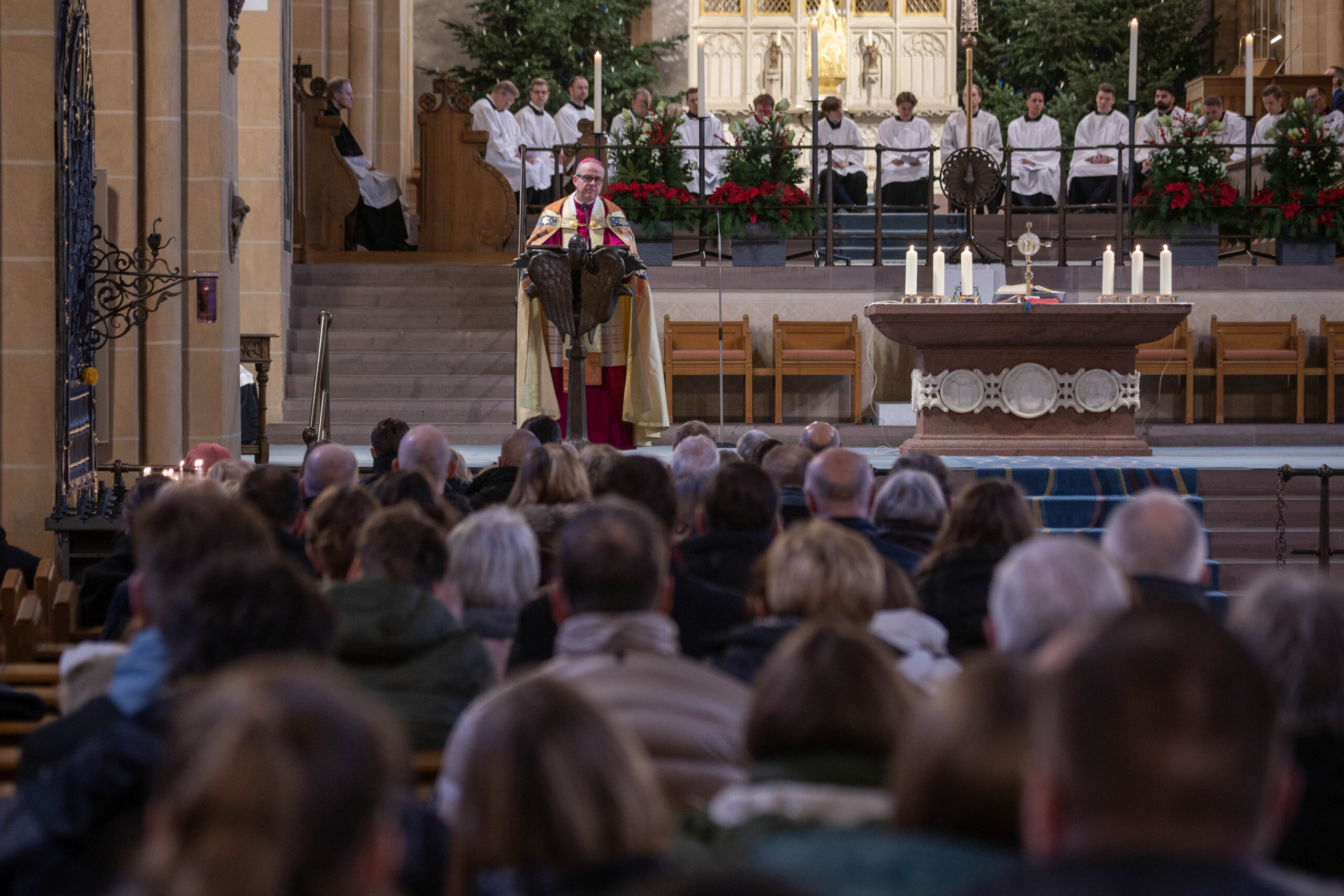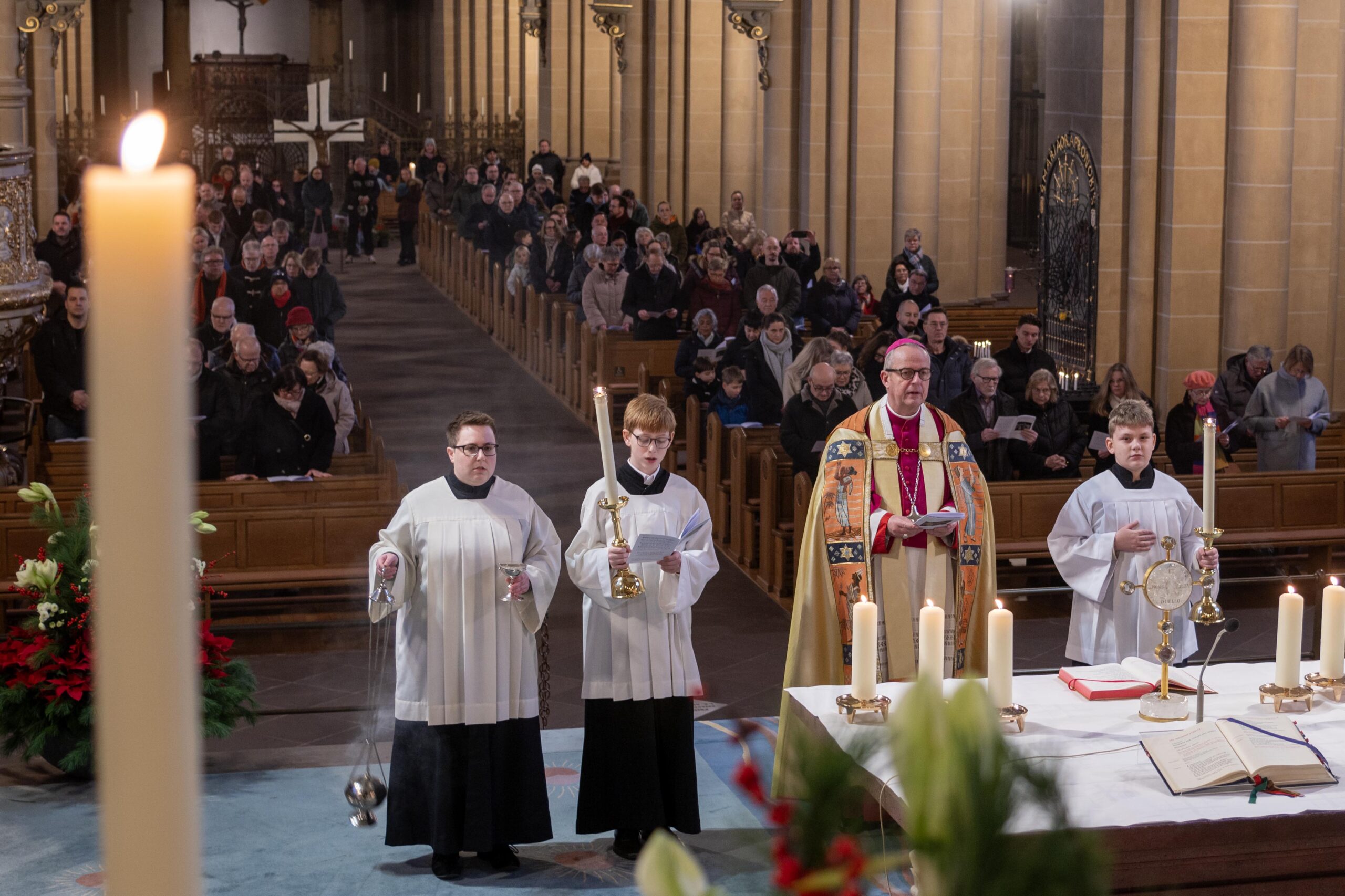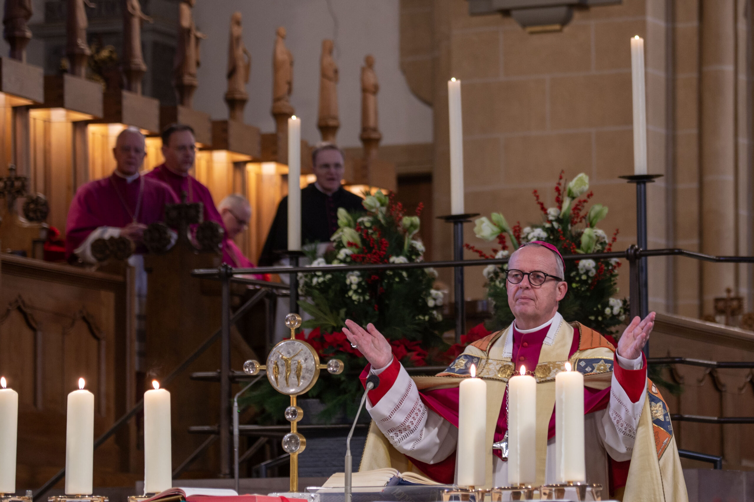 Zum offiziellen Auftakt des Weihnachtsfestes und der Weihnachtszeit 2025 feierte Weihbischof Josef Holtkotte an Heiligabend, 24. Dezember 2025, um 15 Uhr, einen Vesper-Gottesdienst im Paderborn Dom. In seiner Ansprache rief Weihbischof Holtkotte dazu auf, sich in der Heiligen Nacht hineinnehmen zu lassen in die Wahrheit für Gott und die Menschen, sich in Gott festzumachen, vom Heiligen Geist führen zu lassen und sich herausfordern zu lassen von Gottes Liebe: „Bleiben wir Menschen mit Kopf und Verstand und mit Herz und Seele.“