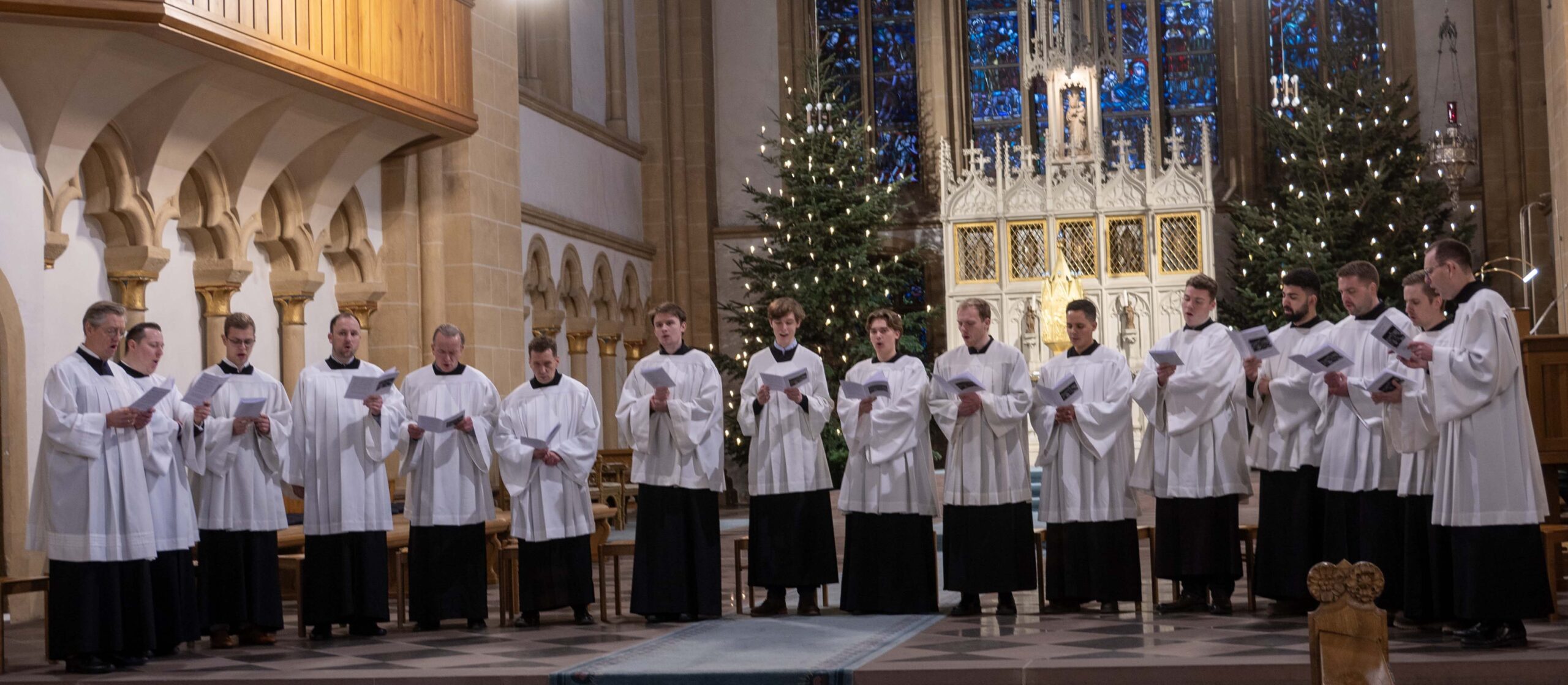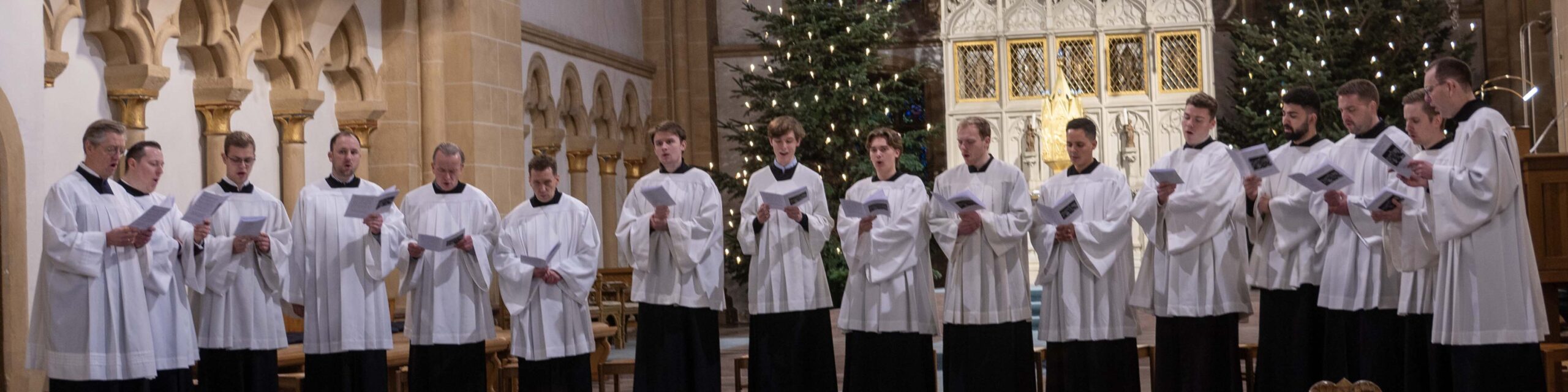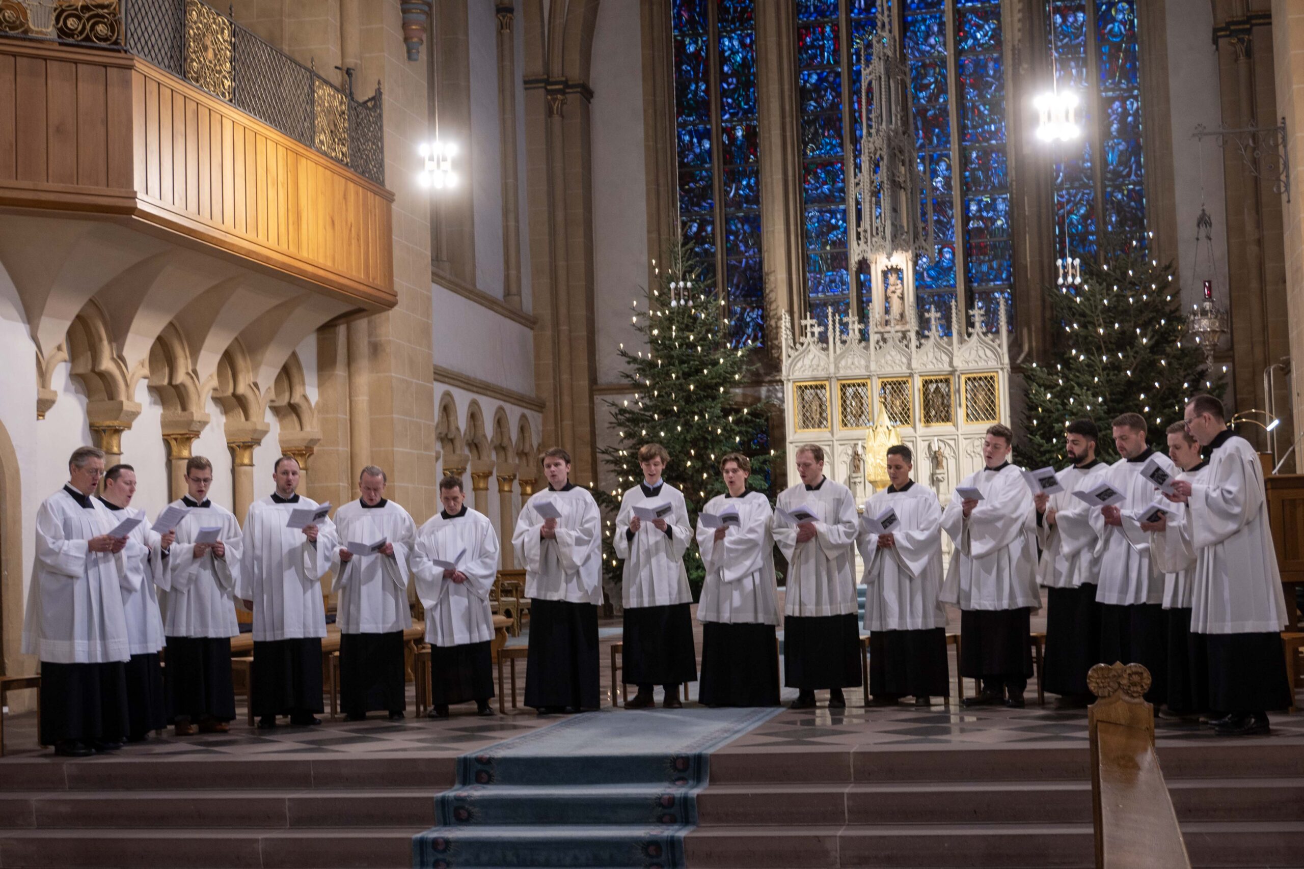 Mitglieder des Paderborner Domkapitels feierten den festlichen Vesper-Gottesdienst zum Beginn des Weihnachtsfestes und der Weihnachtszeit im Chorgestühl der Paderborner Bischofskirche mit. Eine Schola des Domchores unter der Leitung von Domkapellmeister Thomas Berning und Domorganist Tobias Aehlig an der Orgel gestalteten die Vesper musikalisch. Beim Magnifikat im Vesper-Gottesdienst wurden die Weihnachtsbäume im Paderborner Dom erleuchtet.