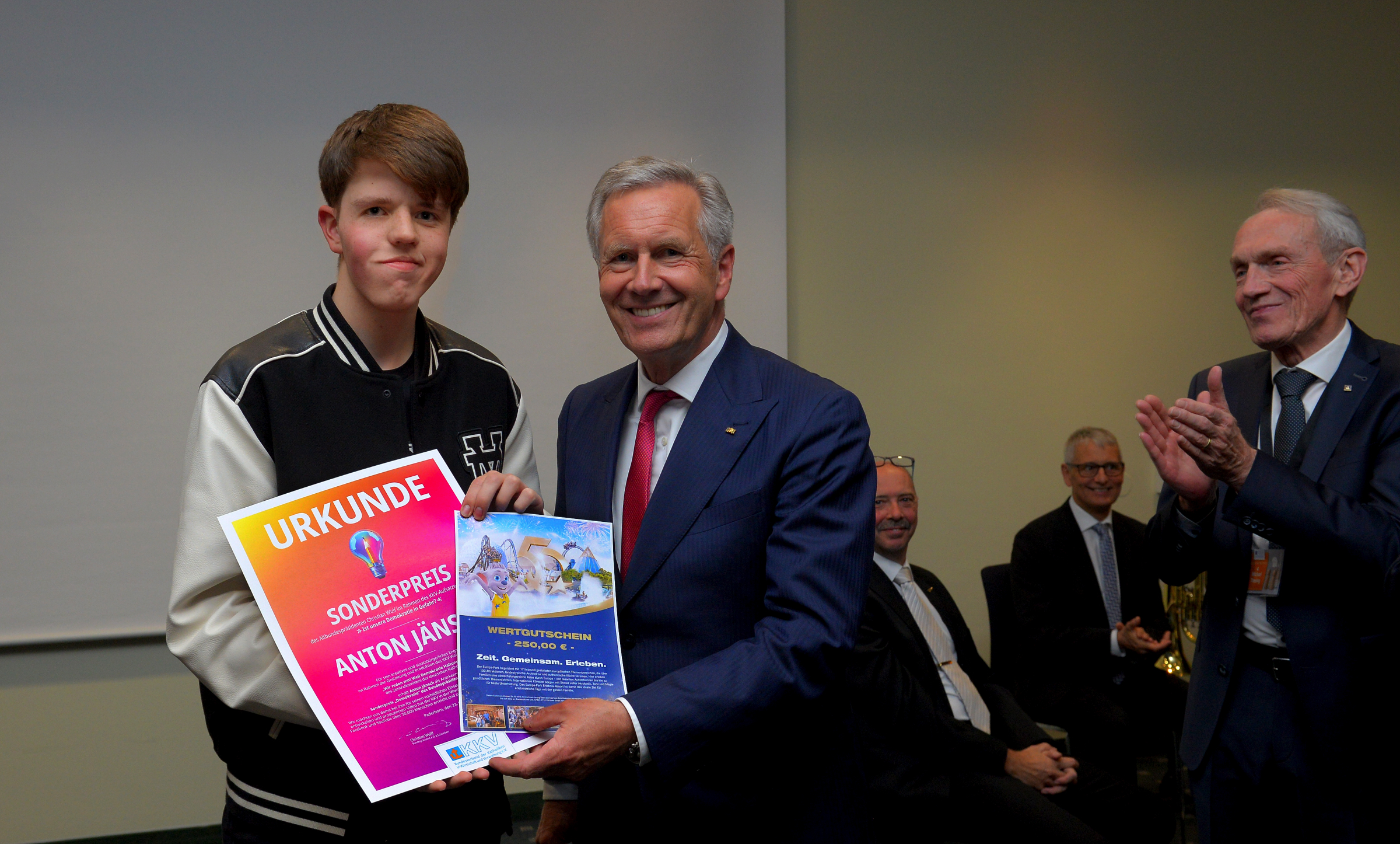 Ein weiterer Höhepunkt des Abends war die Verleihung des „Demokratie-Sonderpreises des Altbundespräsidenten“ an den 14-jährigen Anton Jänsch vom Archi-Gymnasium Soest. Obwohl er keinen Aufsatz im klassischen Sinne einreichte, beeindruckte er Altbundespräsident Wulff mit seinem außergewöhnlichen Engagement für die Demokratie.