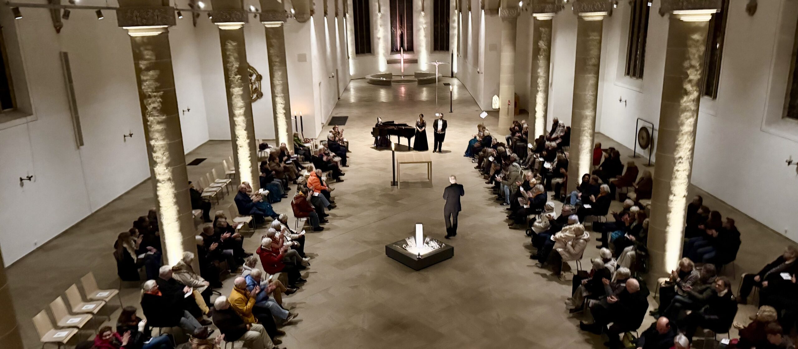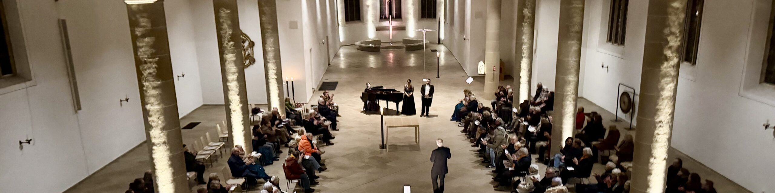 In der St. Agnes Kirche als zentrales Gotteshaus des katholischen Pastoralverbundes Hamm-Mitte-Osten wurde die Vielfalt des musikalischen Schaffens über acht Jahrthunderte parallel zur Hammer Stadtentwicklung aufgezeigt. Neben dem italienischen Tenor wirkten die japanische Sopranistin Makiko Tanaka-Lo Medico und ihre Landsmännin Pianistin Tomoka Ohki mit. Das festliche Konzert bildete am Samstag, 21. Februar 2026, den Auftakt zu einer größeren Zahl von Jubiläumsveranstaltungen, die im Laufe des Jahres unterschiedliche Aspekte des gesellschaftlichen Lebens der Stadt Hamm in den Fokus stellen. Die St. Agnes Kirche als einstige Klosterkirche des in Hamm einst ansässigen Ordens der Franziskus-Observanten wurde von 1947 bis 1953 errichtet. Der Vorgängerbau aus dem 16. Jahrhundert fiel einem Bombenhagel im Dezember 1944, wenige Monate vor Ende des Zweiten Weltkriegs, zum Opfer. Die erste Kirche an dieser Stelle stammte aus dem Jahr 1328. So fand das Auftakt-Konzert an einem für die Hammer Stadtgeschichte bedeutsamen historischen Ort statt. Die Agnes-Kirche weist heute zwei Besonderheiten auf. Seit 2017 befindet sich im Chorraum ein begehbares Taufbecken, das eine Ganzkörpertaufe ermöglicht. Bereits fünf Jahre zuvor waren die festen Bänke aus der Kirche entfernt worden. Die Gemeinde sitzt seitdem in einer Ellipse um Altar und Ambo herum. Beim Jubiläumskonzert war diese Anordnung für die 200 Zuschauerinnen und Zuschauer beibehalten worden. Unter den neun vorgetragenen Werken – eine die Jahrhunderte umfassende Bandbreite von Johann Sebastian Bach über Giacomo Puccini und Frédéric Chopin bis Giuseooe Verdi – fand „Jerusalem“ von Stephen Adams besondere Beachtung. Moderator Dr. Detlef Berntzen wies auf die verbindende Bedeutung der Stadt Jerusalem für die drei großen monotheistischen Weltreligionen Islam, Judentum und Christentum hin. „Es wäre so dringend nötig, Grenzen zu überwinden“, sagte er. „Diese Hoffnung gipfelt in der Stadt Jerusalem.“ Das vorgetragene Werk von Stephen Adams, eine viktorianische Ballade aus dem Jahr 1892, erhielt lang anhaltenden Beifall. Der steigerte sich noch einmal zum Ende des Konzertes, als die Zuhörerinnen und Zuhörer sich von den Stühlen erhoben und die drei Künstler feierten.