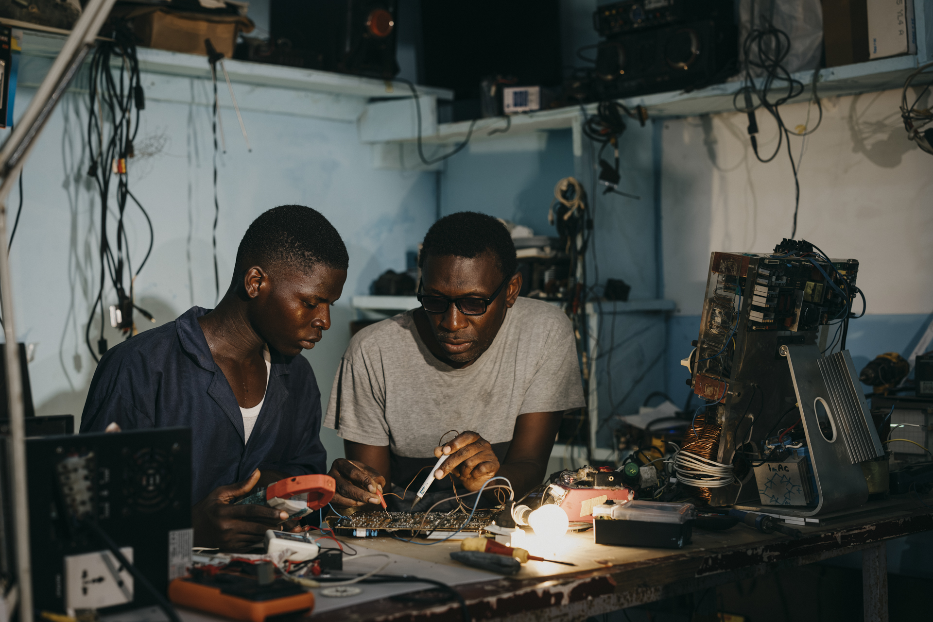 Es blinkt, qualmt, surrt. Azubi Silas Teyim schraubt an einer Platine herum. Neben ihm steht ein uraltes Radiogerät, Marke Philips aus den 1950er-Jahren. Ein eleganter brauner Kasten aus lackiertem Holz mit großen Metalldrehknöpfen und weißen Tasten. Würde es funktionieren, dann könnte man seinem kratzigen Sound lauschen, vielleicht gedämpften Trompeten und Klarinetten, in diesem einzigartigen vollen Klang, wie nur alte Radios und Plattenspieler ihn zustande bringen. Doch dafür muss das Teil erst repariert werden. Stattdessen übertönen die wummernden Bässe des Reggaeton aus dem Friseursalon nebenan den Straßenlärm.
